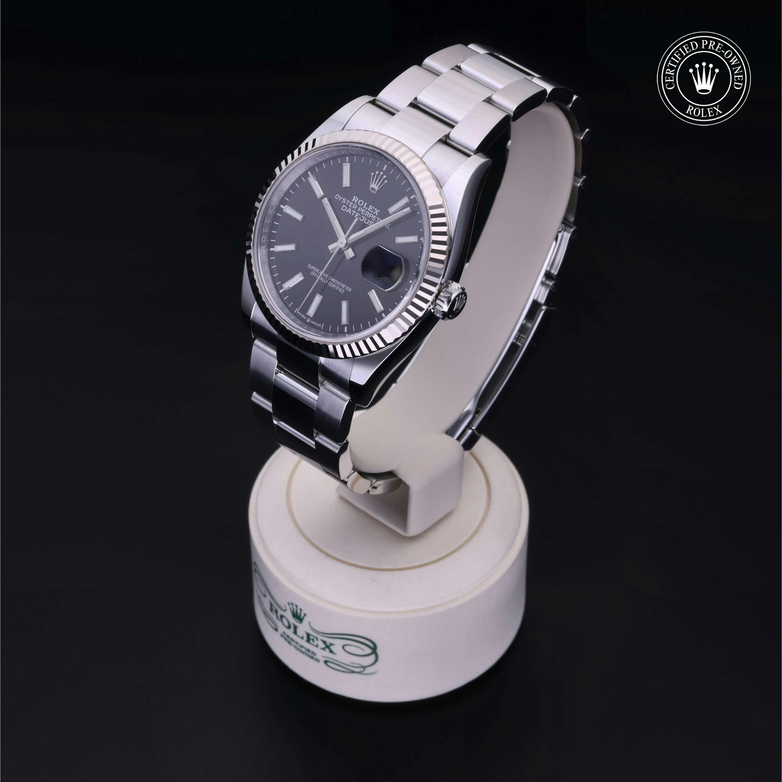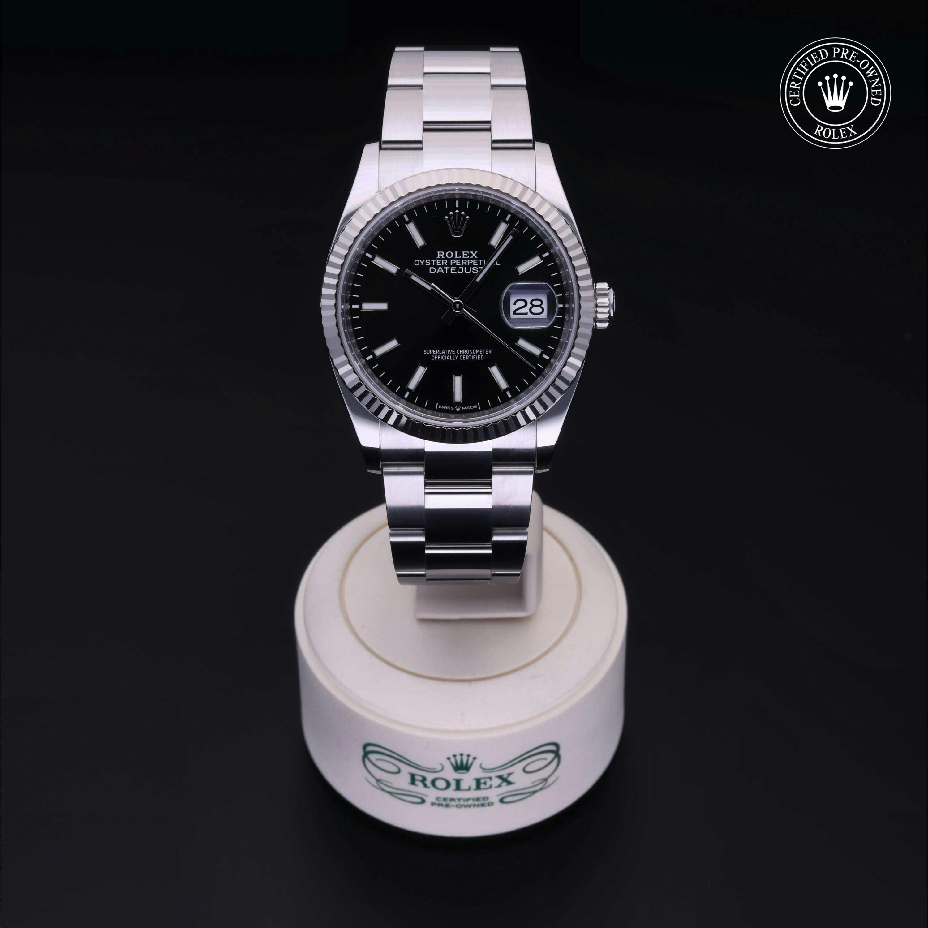 Rolex Certified Pre-Owned Datejust (126234) self - winding automatic watch, features a 36mm stainless steel case with an 18k white gold fluted bezel surrounding a bright black dial on a stainless steel oyster bracelet. Functions include hours, minutes, seconds and date. This watch has received Rolex-authorized service and certification. It comes with the original box, and includes a custom Rolex Certified Pre-Owned hang tag, travel pouch and RCPO international warranty card.