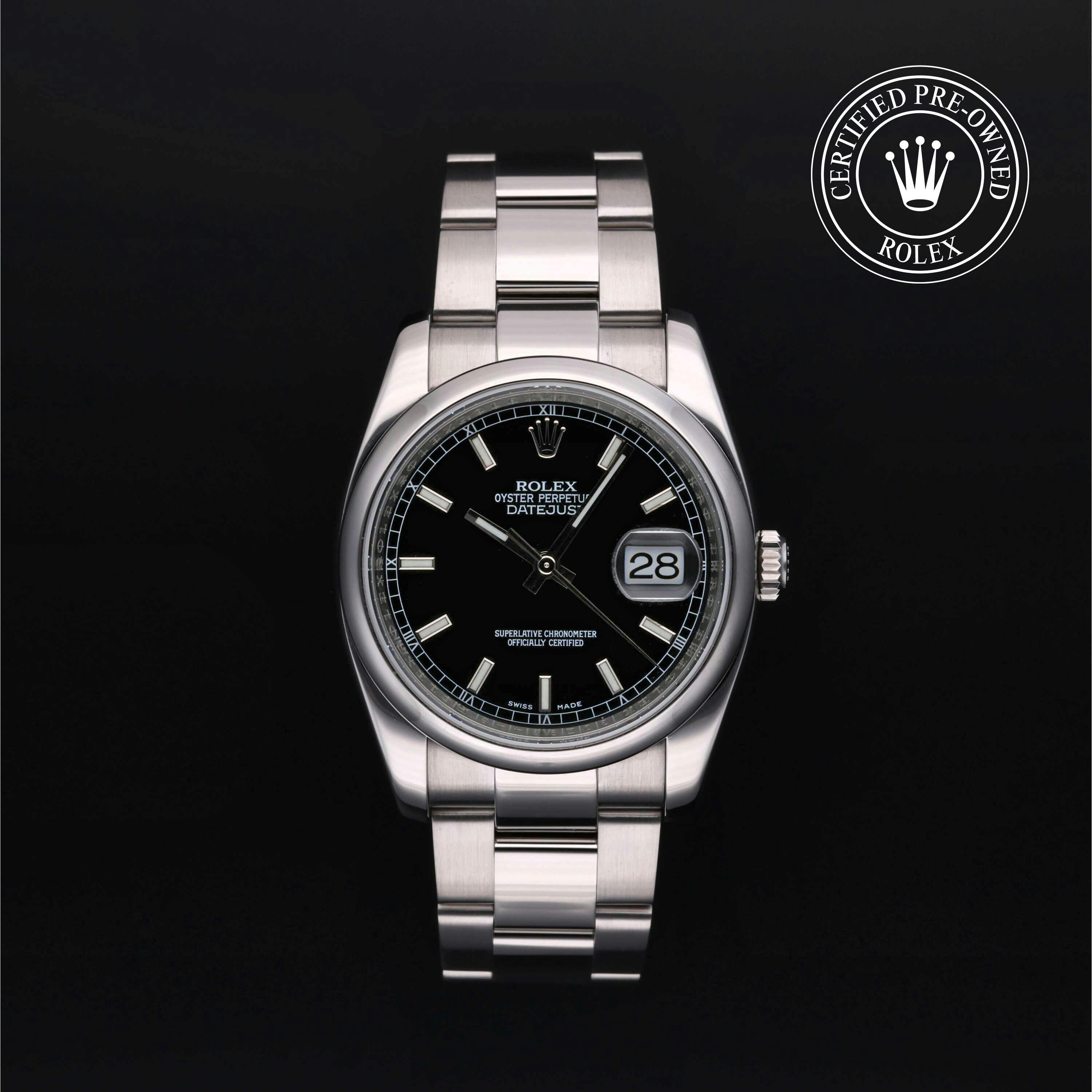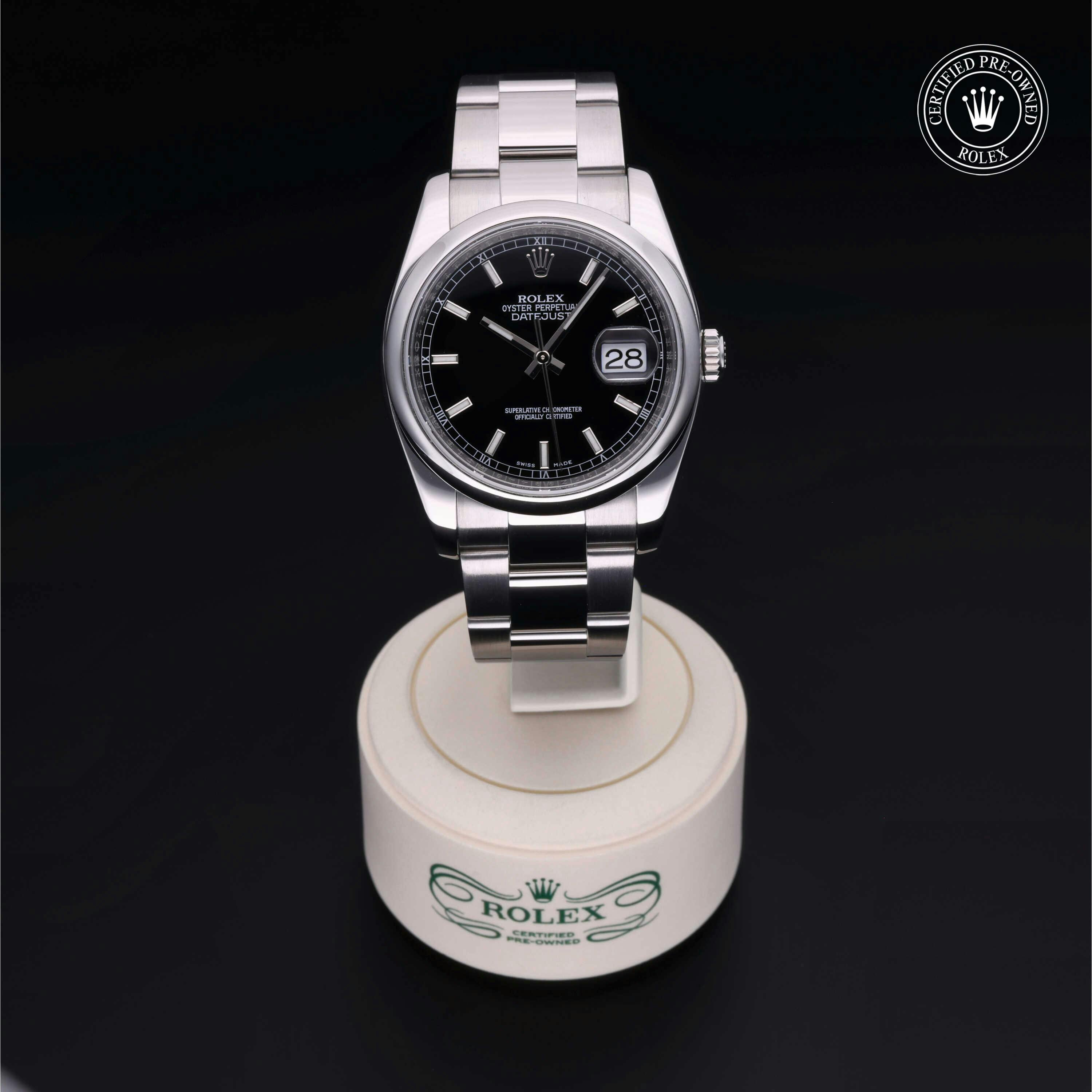 Rolex Certified Pre-Owned Datejust (116200) self - winding automatic watch, features a 36mm stainless steel case and domed bezel surrounding a black dial on a stainless steel oyster bracelet. Functions include hours, minutes, seconds and date. This watch has received Rolex-authorized service and certification. It does not come with the original box or papers, but includes a custom Rolex Certified Pre-Owned hang tag, travel pouch and RCPO international warranty card.
