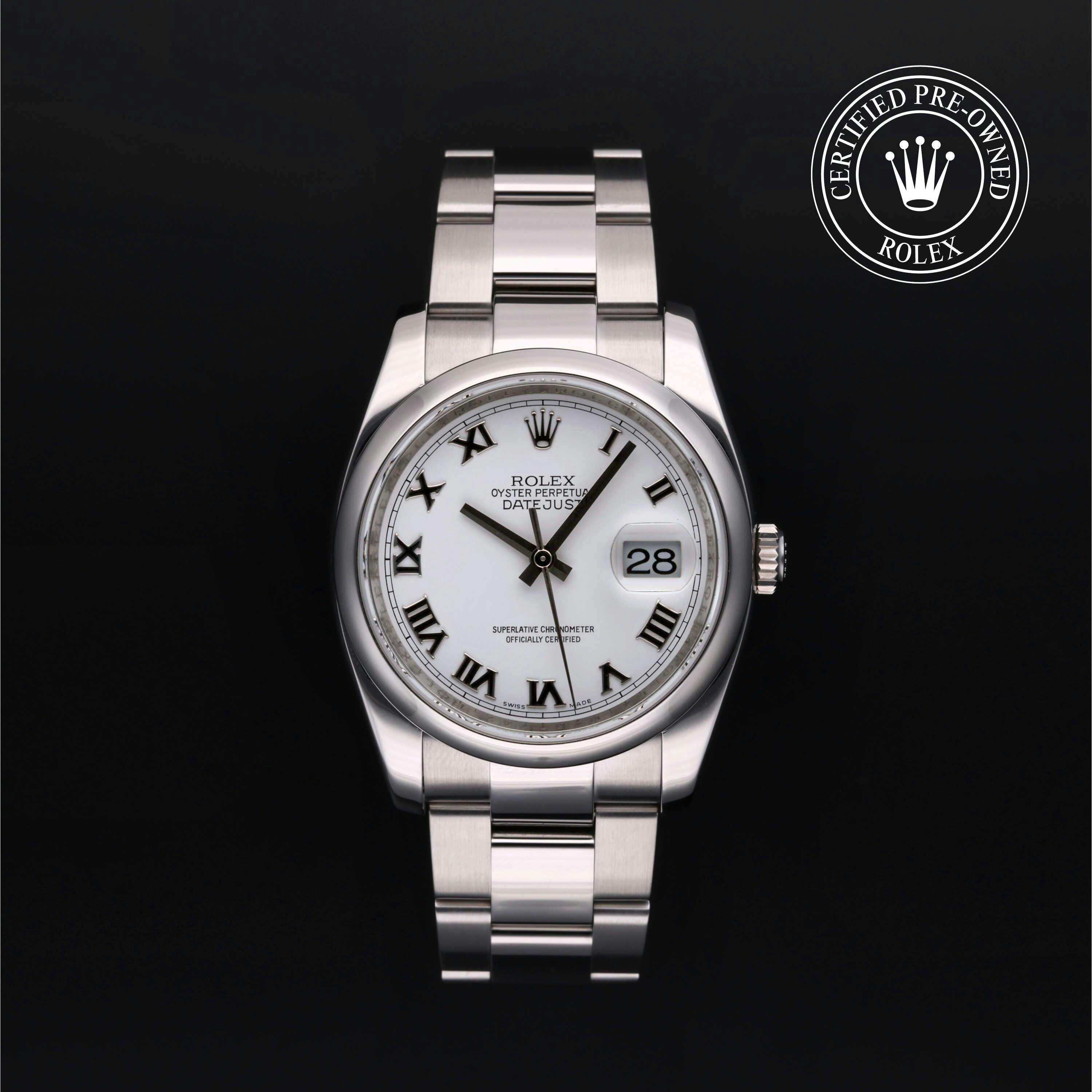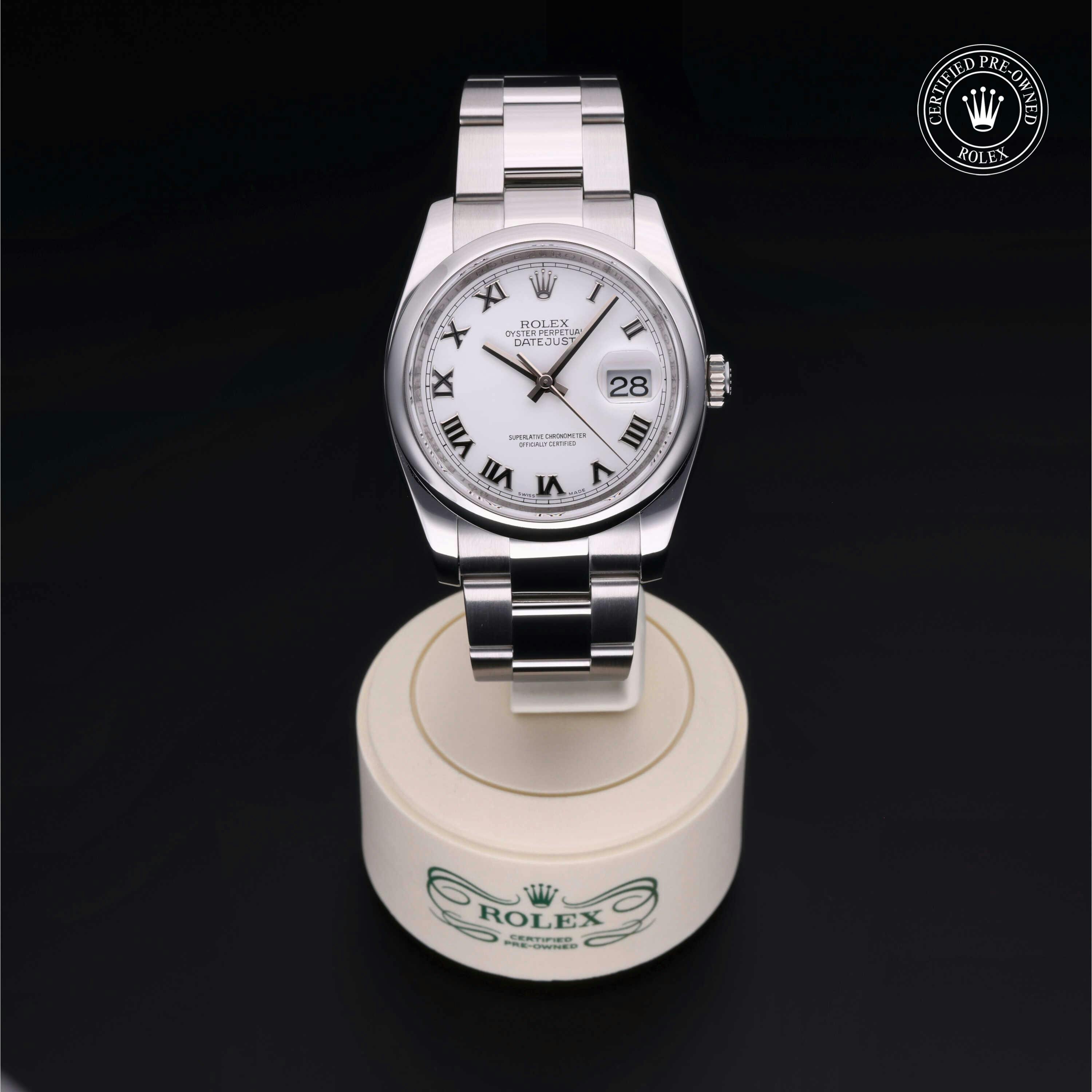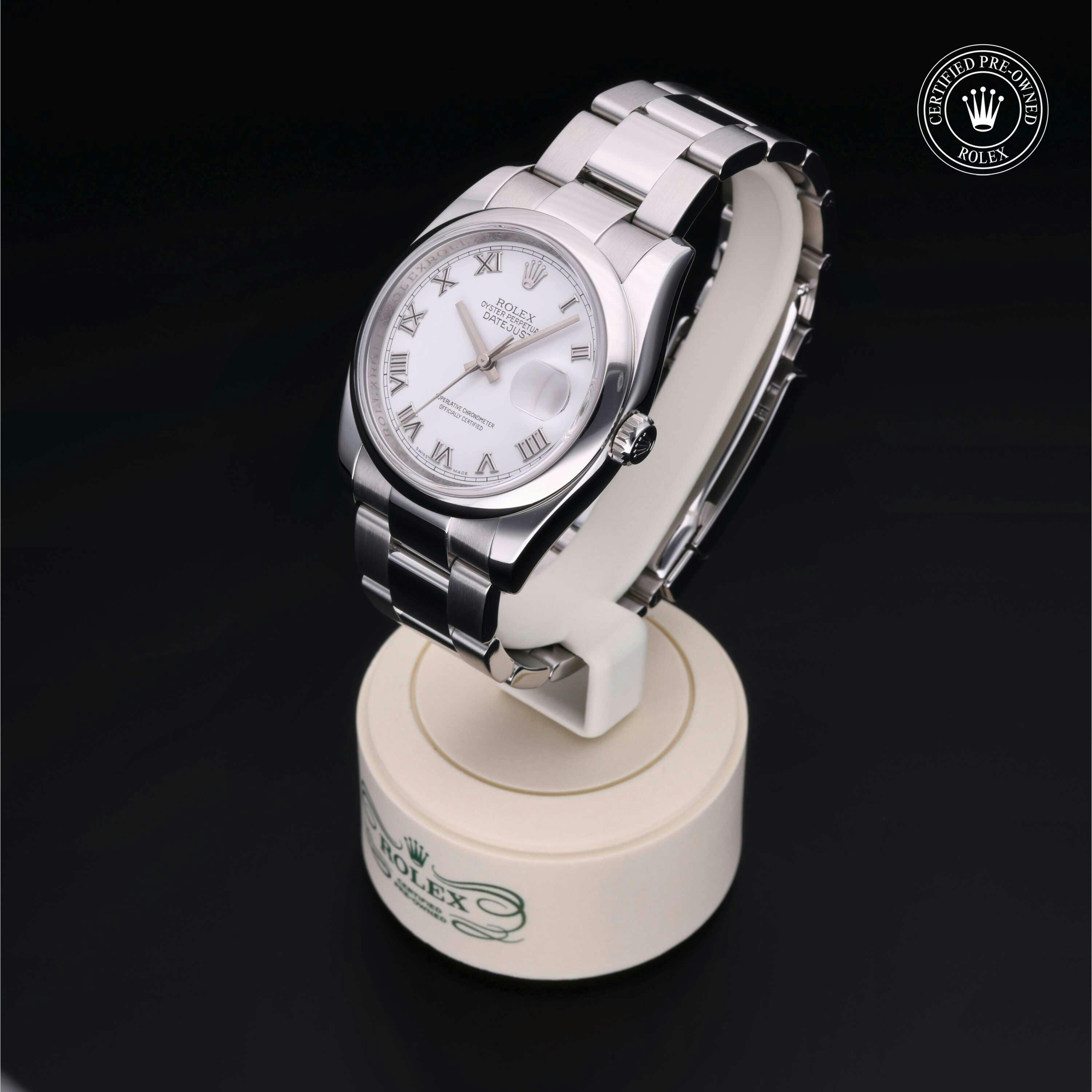 Rolex Certified Pre-Owned Datejust (116200) self - winding automatic watch, features a 36mm stainless steel case and domed bezel surrounding a white dial on a stainless steel oyster bracelet. Functions include hours, minutes, seconds and date. This watch has received Rolex-authorized service and certification. It does not come with the original box or papers, but includes a custom Rolex Certified Pre-Owned hang tag, travel pouch and RCPO international warranty card.