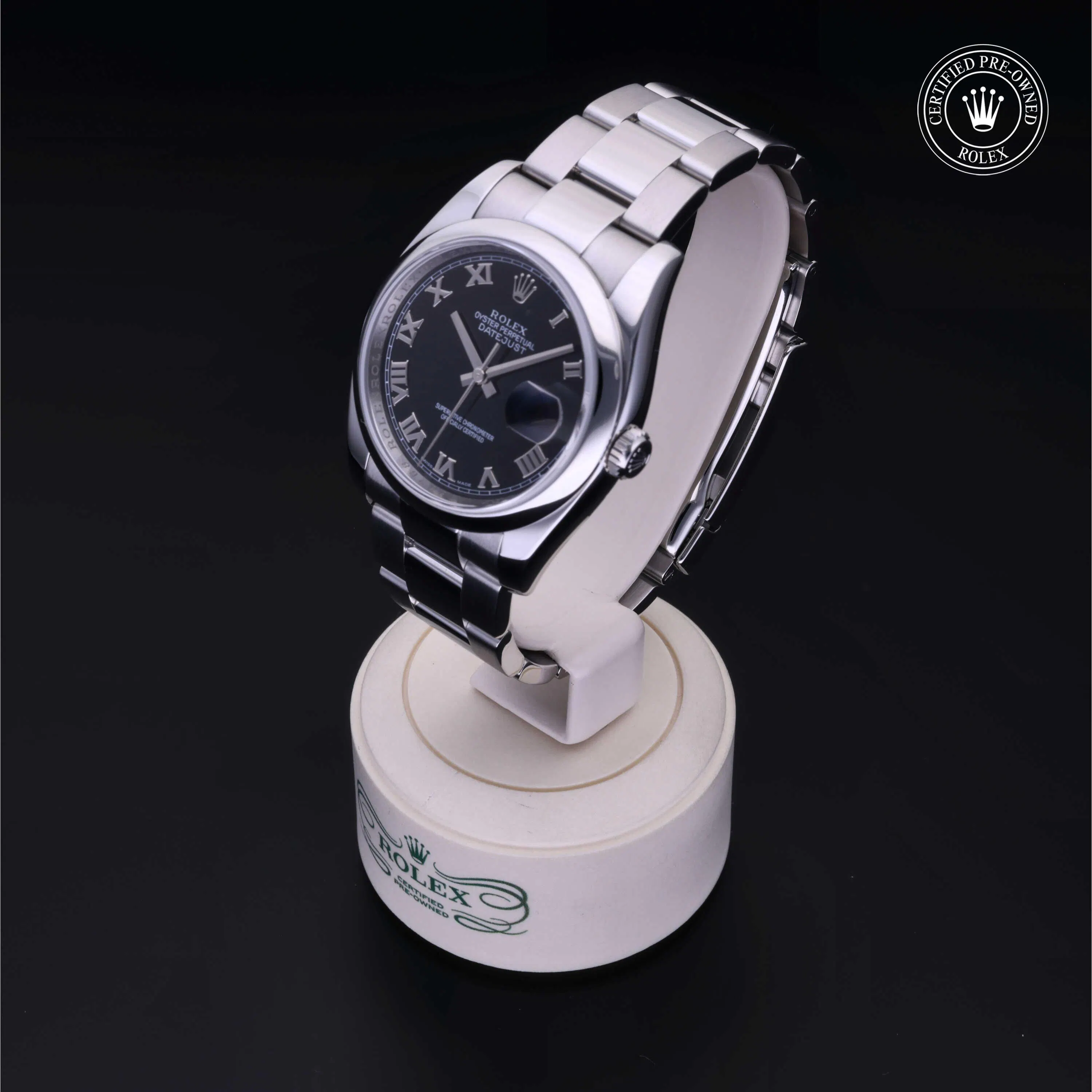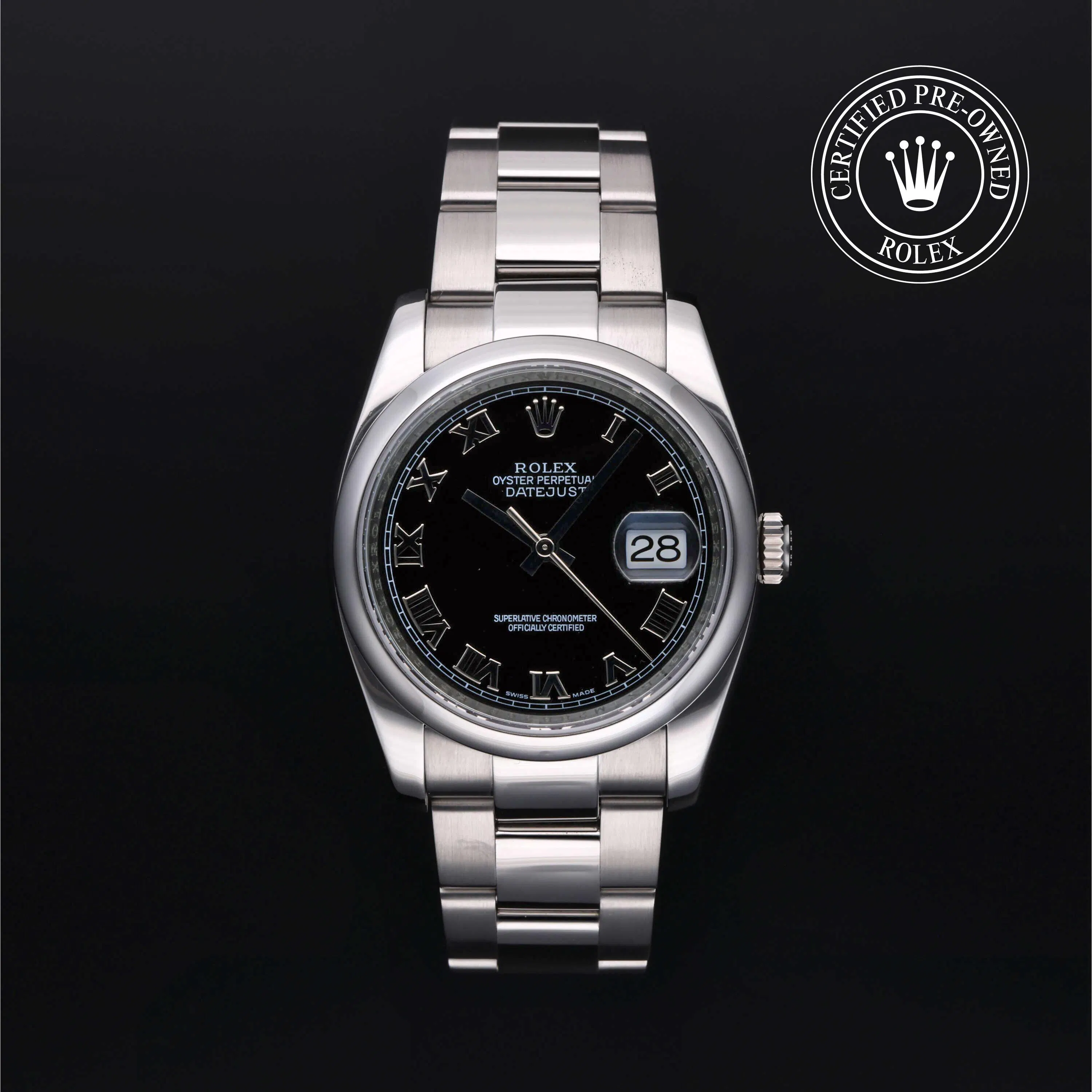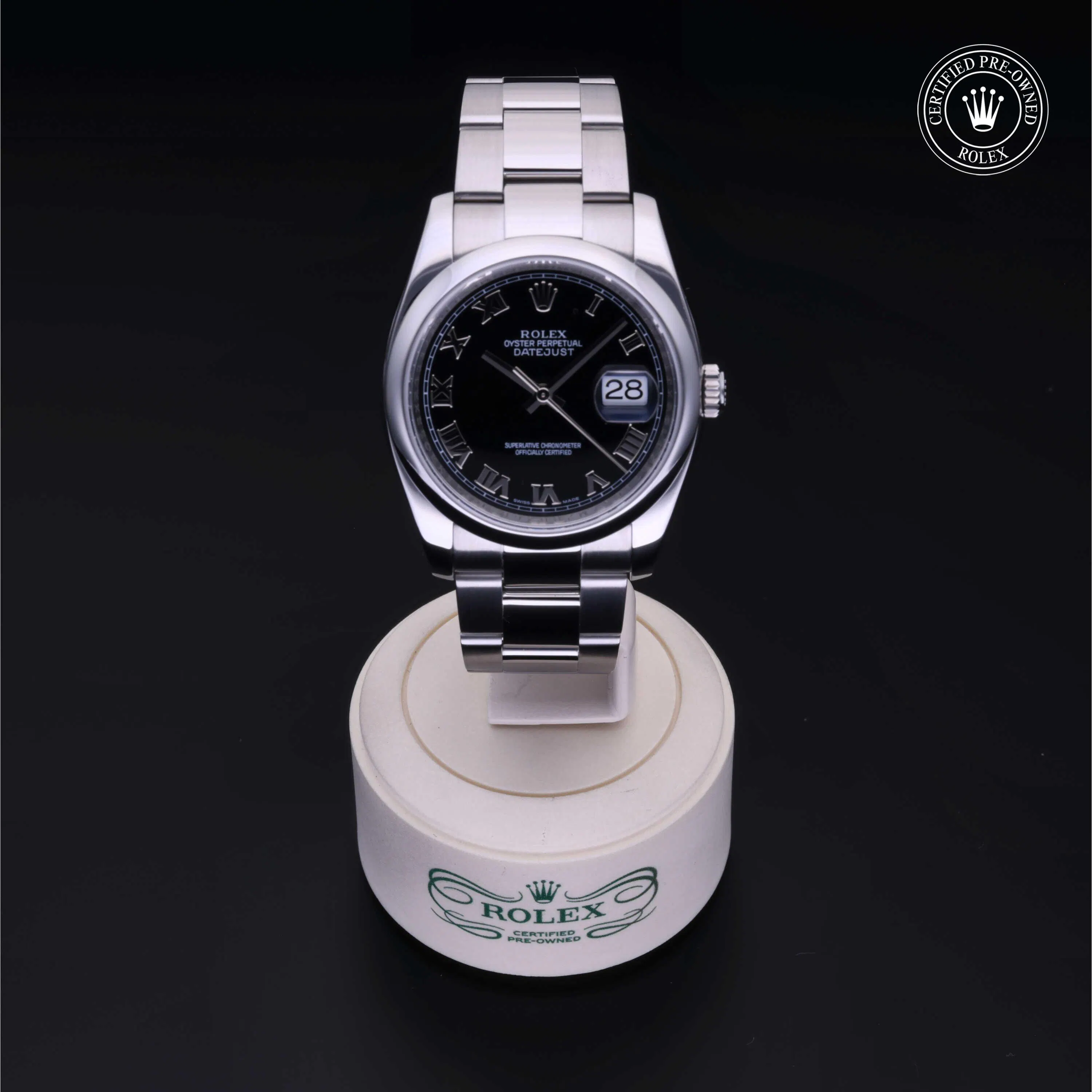 Rolex Certified Pre-Owned Datejust (116200) self - winding automatic watch, features a 36mm stainless steel case with a domed bezel surrounding a black roman dial. The watch is secured on a stainless steel Oyser bracelet complete with a folding buckle. Functions include hours, minutes, seconds and date. This watch has been serviced by an authorized service center and certified by Rolex. It does not come with the original box or papers, but includes a custom Rolex Certified Pre-Owned hang tag, travel pouch and international warranty card.