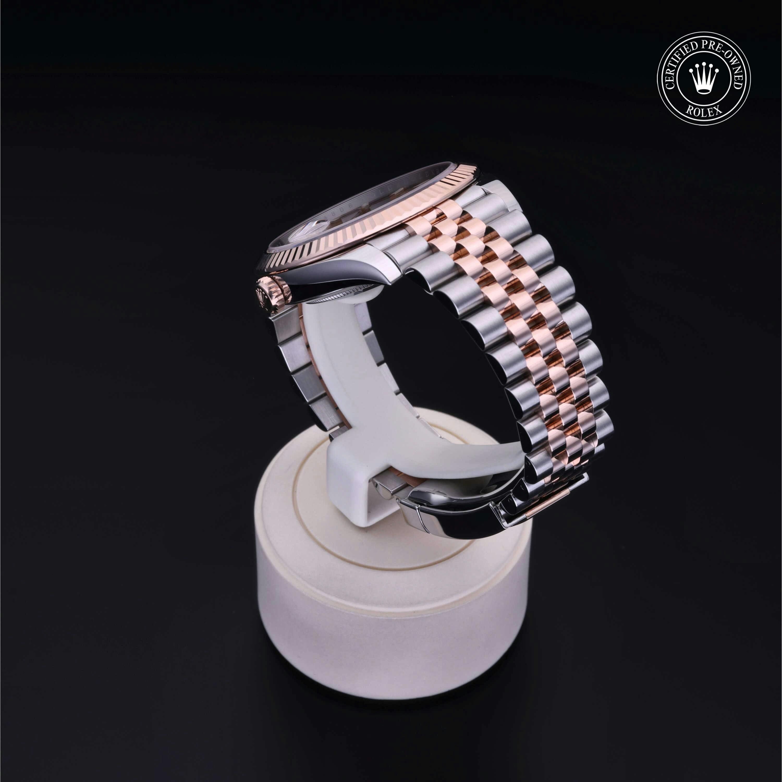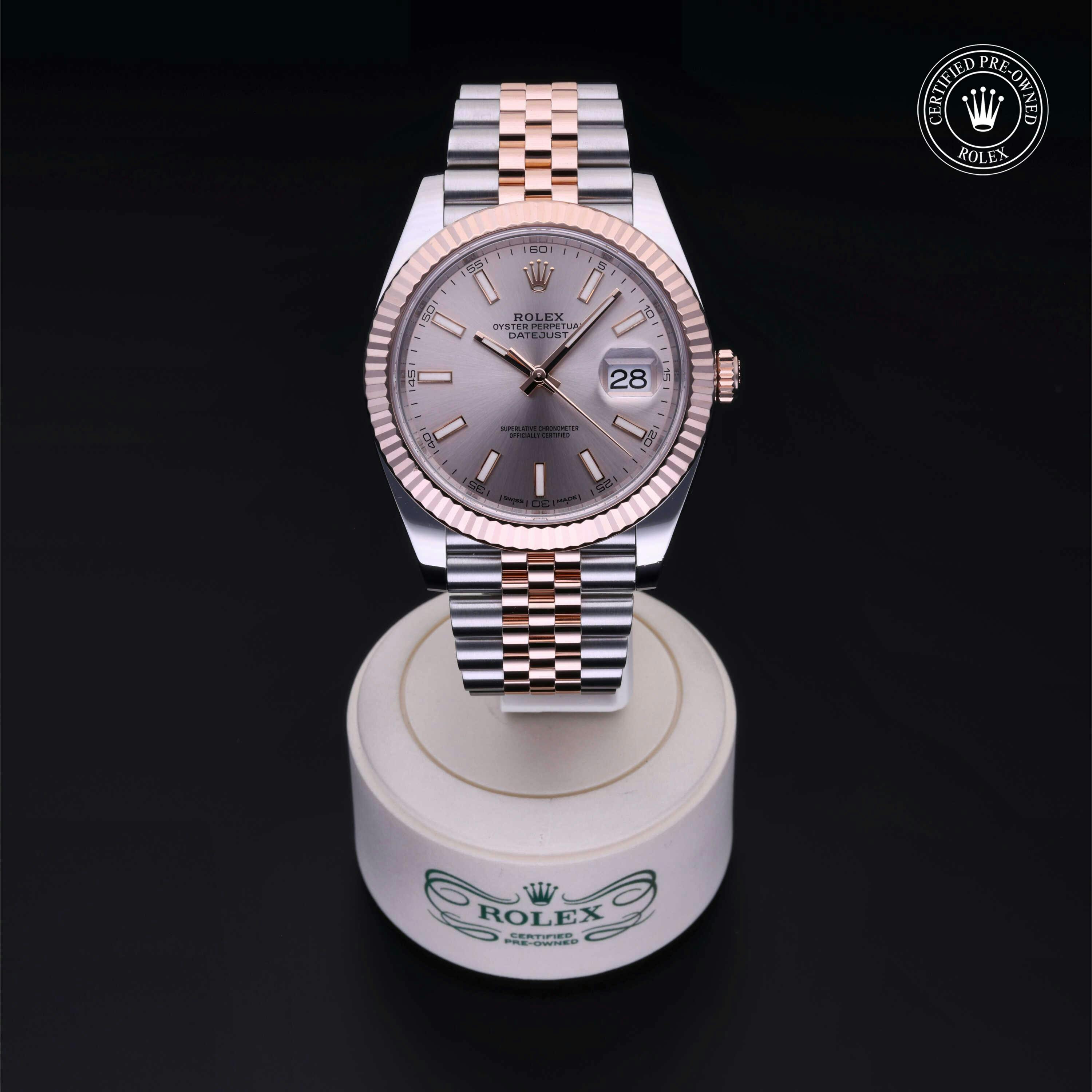 Rolex Certified Pre-Owned Datejust 41 (126331) self - winding automatic watch, features a 41mm stainless steel case with an 18k rose gold fluted bezel surrounding a Sundust dial on a stainless steel and 18k rose gold jubilee bracelet. Functions include hours, minutes, seconds and date. This watch has received Rolex-authorized service and certification. It comes with the original box and papers, and includes a custom Rolex Certified Pre-Owned hang tag, travel pouch and RCPO international warranty card.