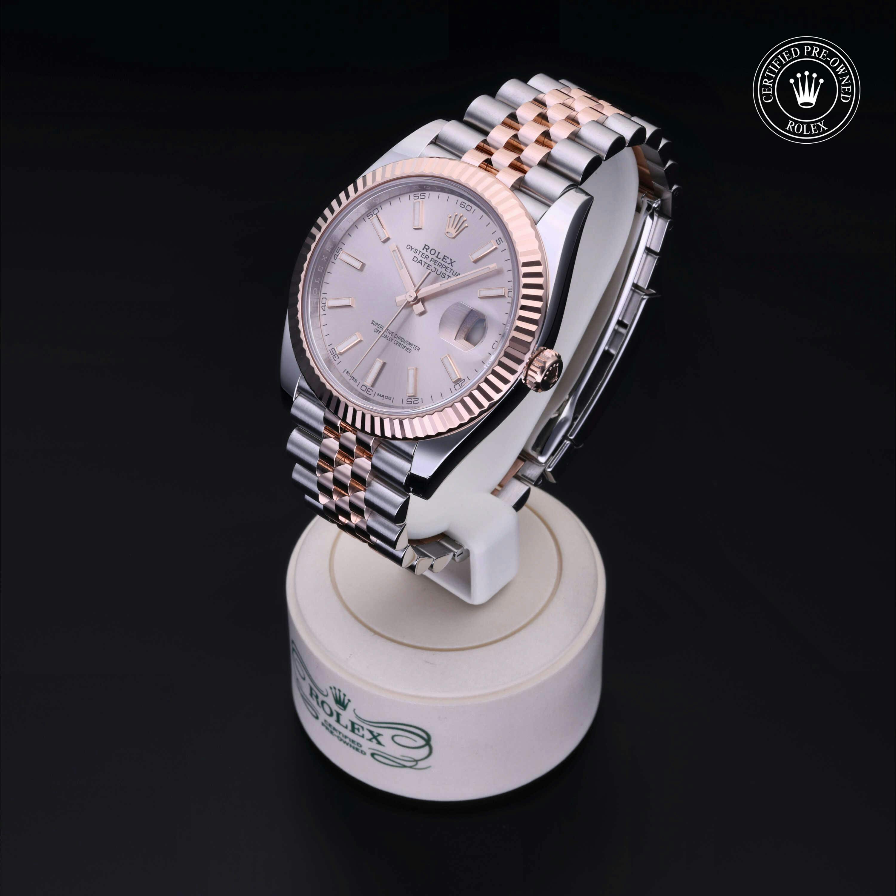 Rolex Certified Pre-Owned Datejust 41 (126331) self - winding automatic watch, features a 41mm stainless steel case with an 18k rose gold fluted bezel surrounding a Sundust dial on a stainless steel and 18k rose gold jubilee bracelet. Functions include hours, minutes, seconds and date. This watch has received Rolex-authorized service and certification. It comes with the original box and papers, and includes a custom Rolex Certified Pre-Owned hang tag, travel pouch and RCPO international warranty card.