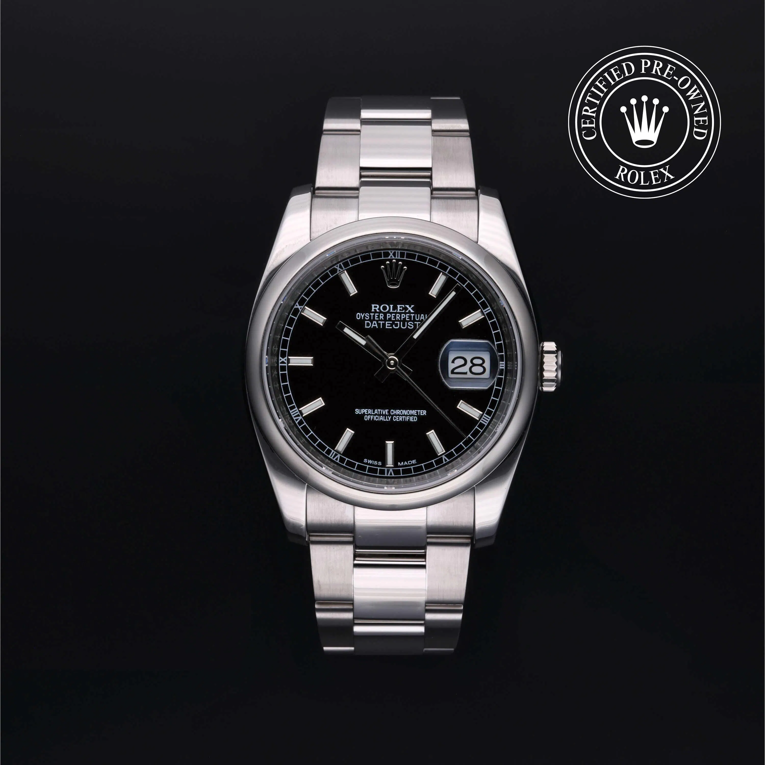 Rolex Certified Pre-Owned Datejust (116200) self - winding automatic watch, features a 36mm stainless steel case and domed bezel surrounding a black dial on a stainless steel oyster bracelet. Functions include hours, minutes, seconds and date. This watch has received Rolex-authorized service and certification. It does not come with the original box or papers, but includes a custom Rolex Certified Pre-Owned hang tag, travel pouch and RCPO international warranty card.