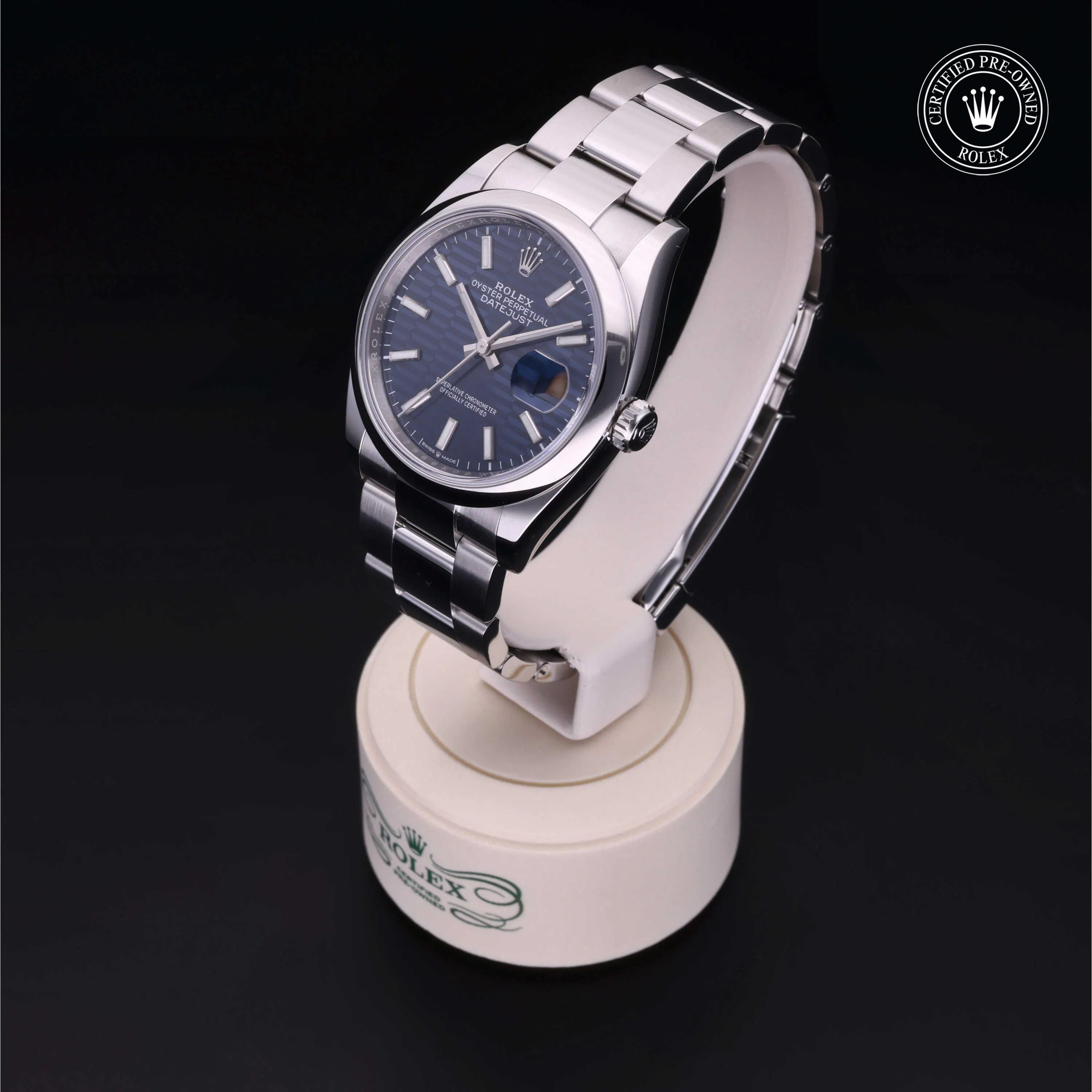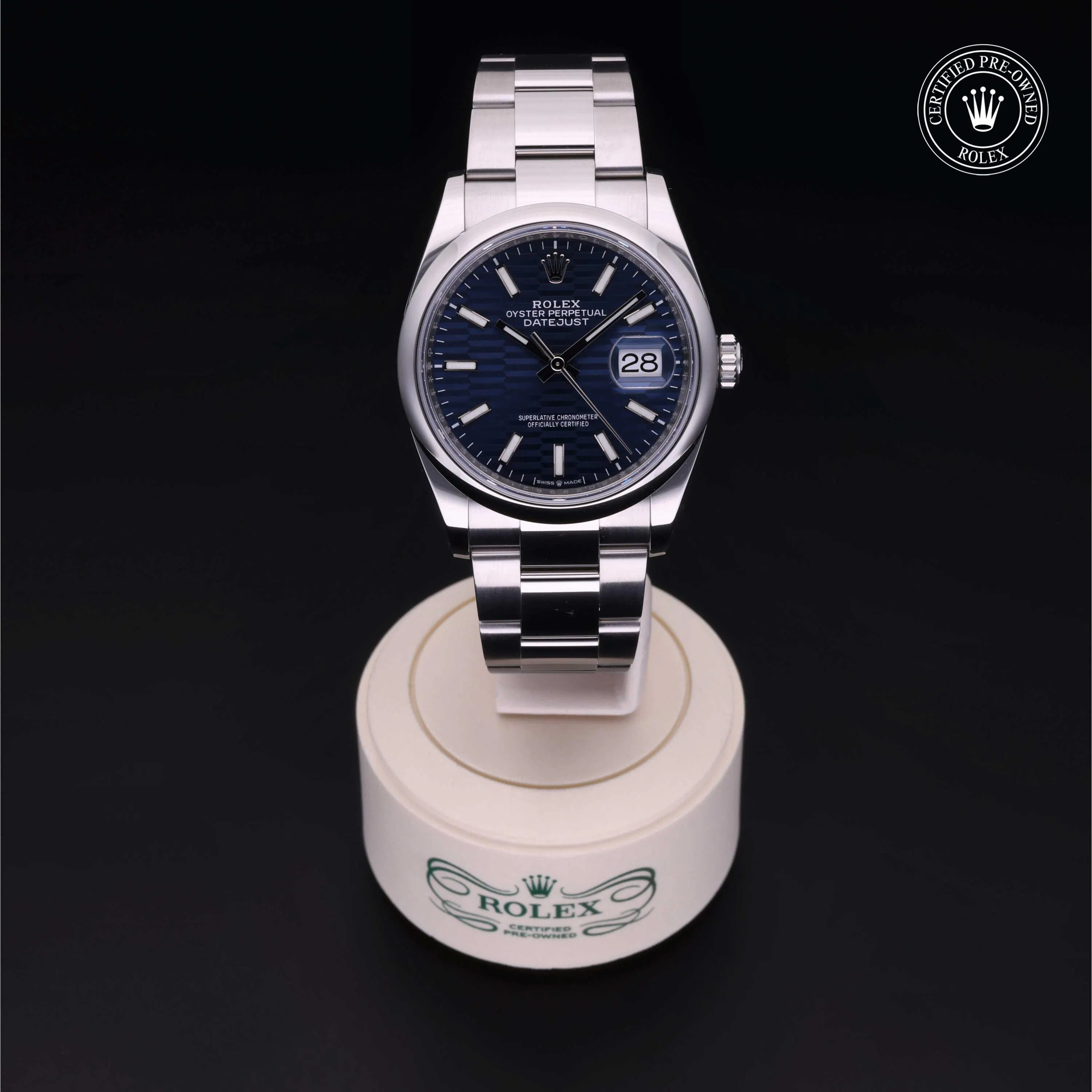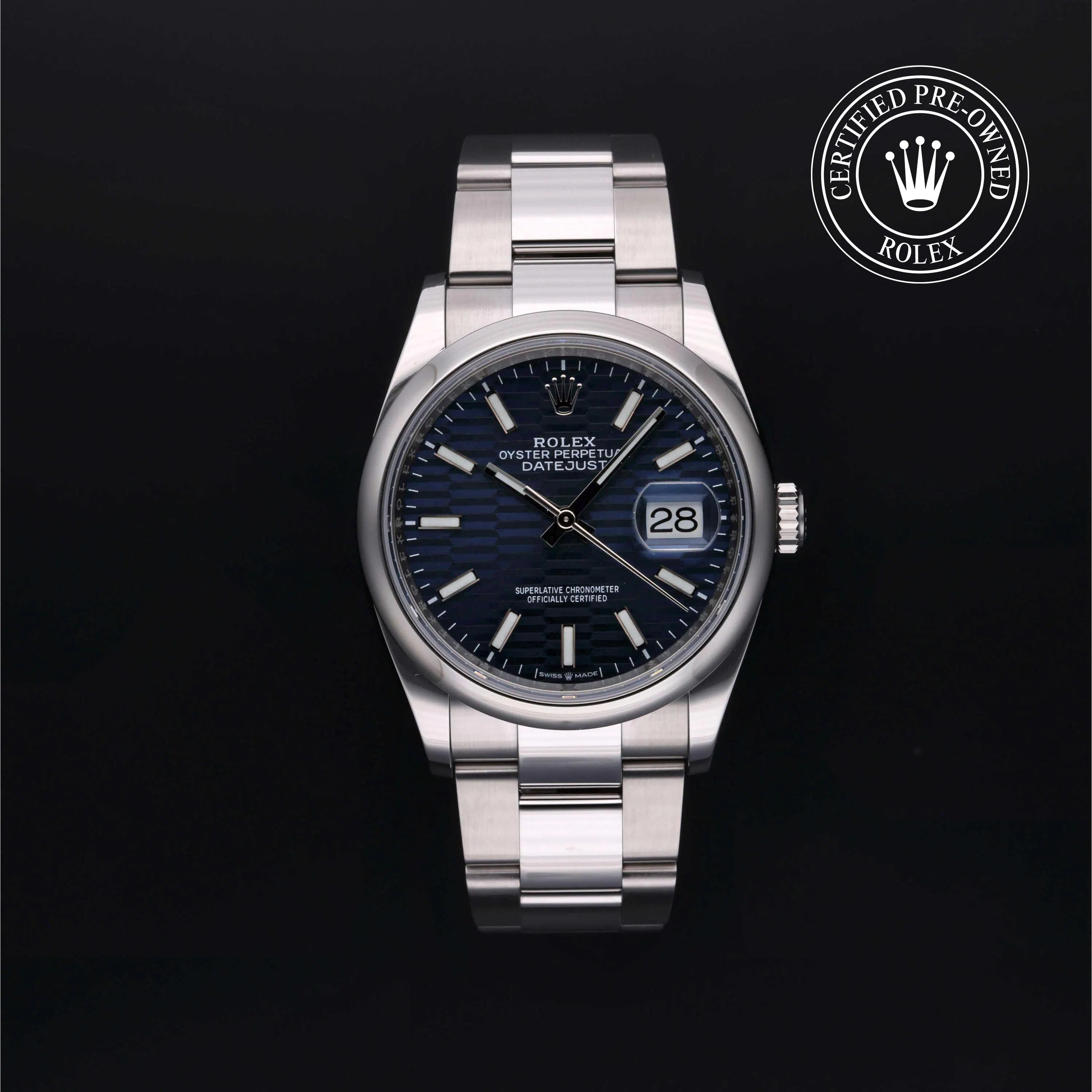 Rolex Certified Pre-Owned Datejust (126200) self - winding automatic watch, features a 36mm stainless steel case and domed bezel surrounding a bright blue fluted dial on a stainless steel oyster bracelet. Functions include hours, minutes, seconds and date. This watch has received Rolex-authorized service and certification. It comes with the original box and papers, and includes a custom Rolex Certified Pre-Owned hang tag, travel pouch and RCPO international warranty card.