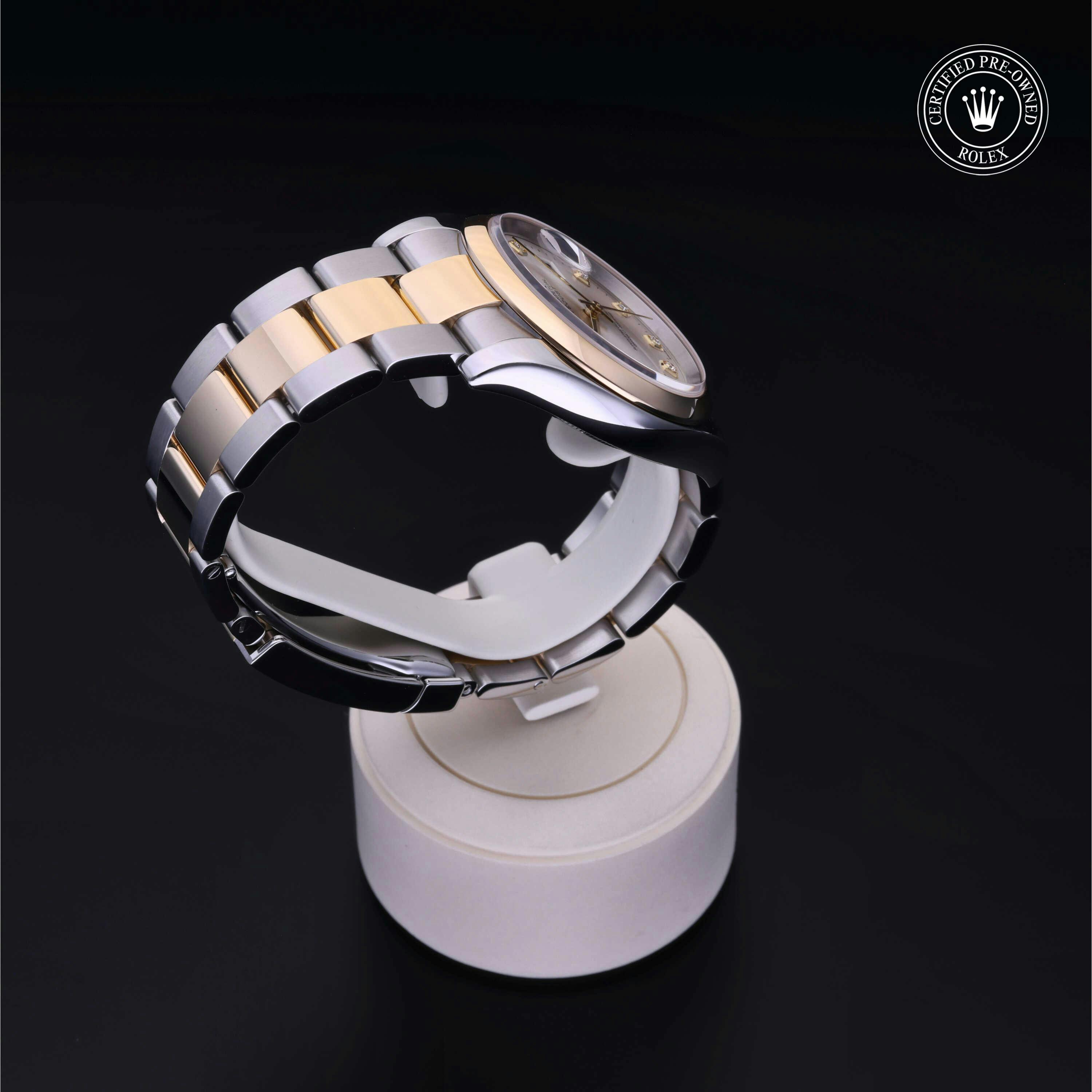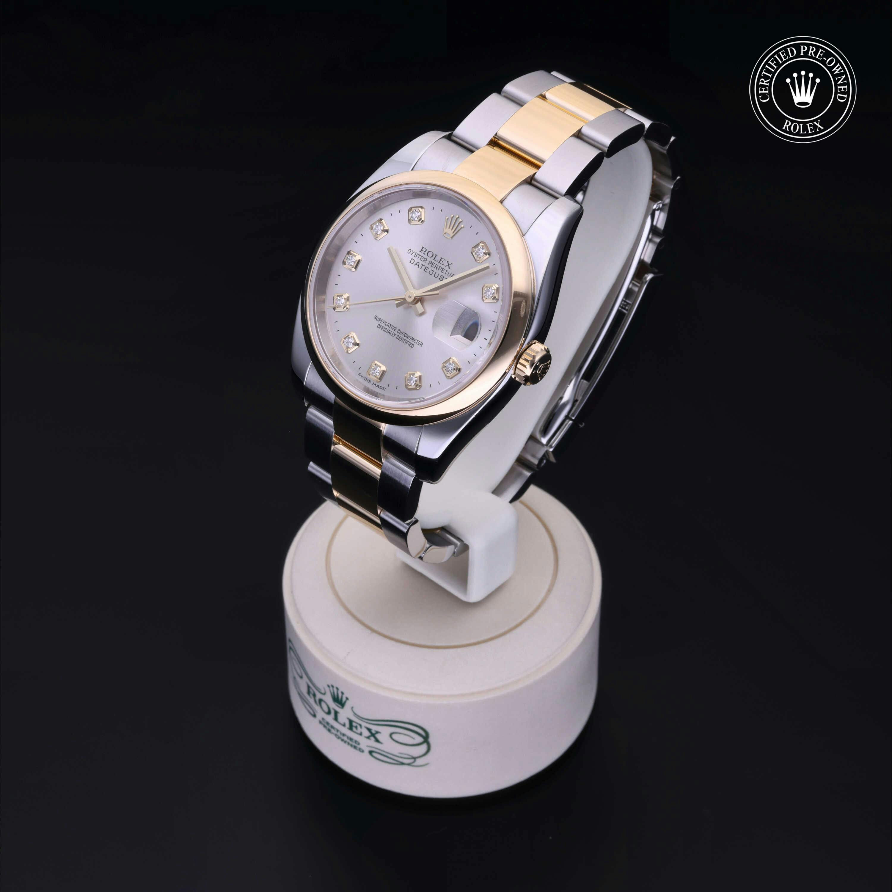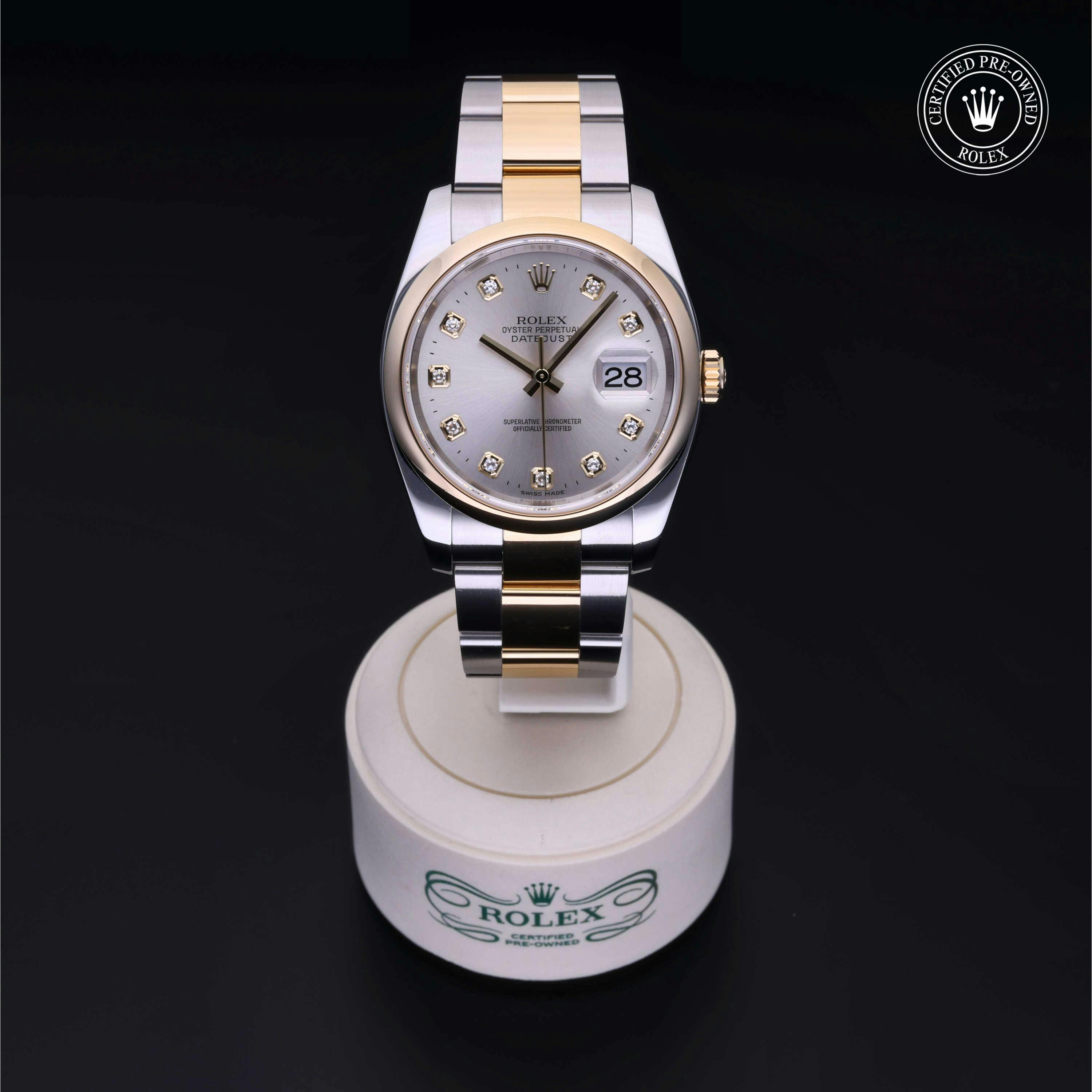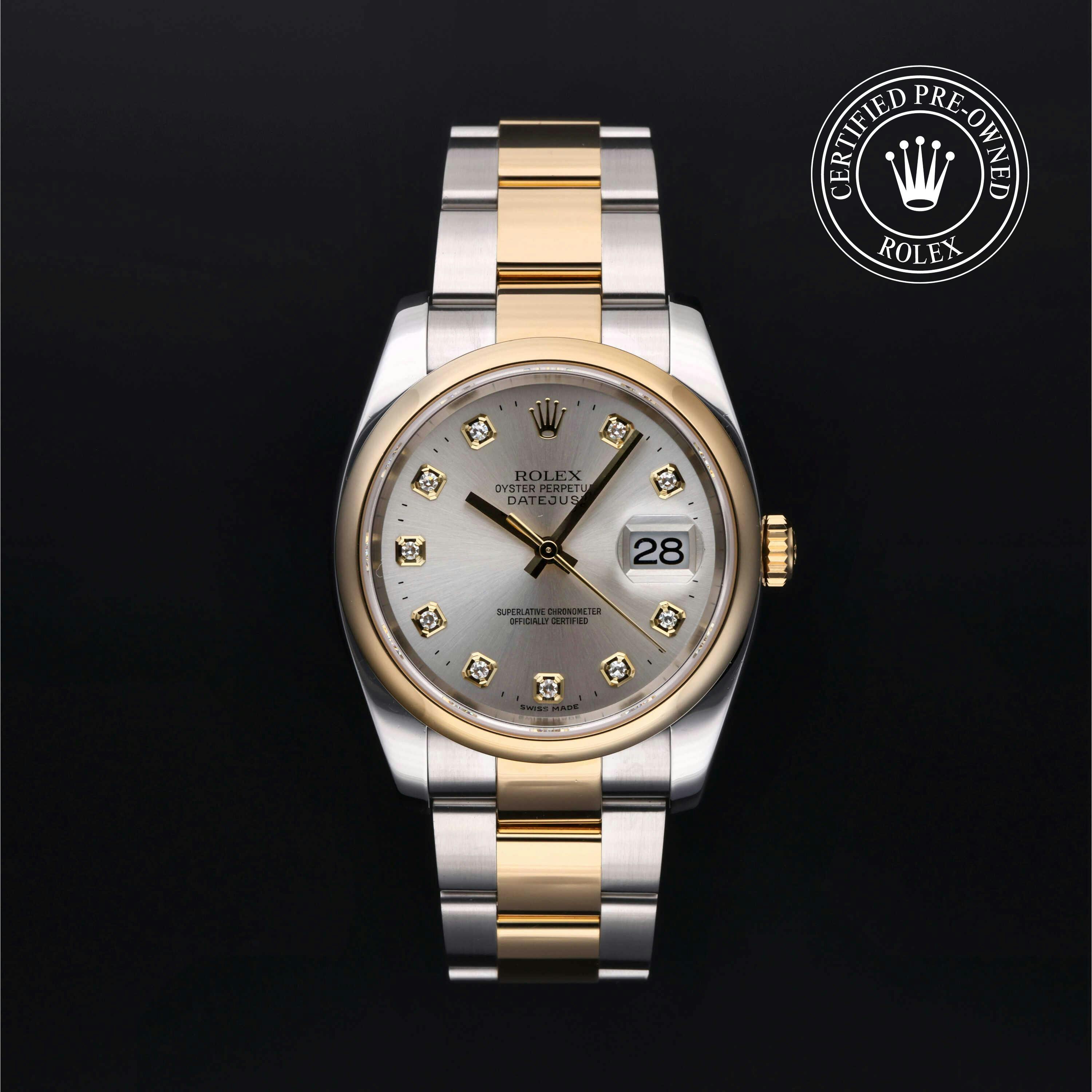 Rolex Certified Pre-Owned Datejust (116203) self - winding automatic watch, features a 36mm stainless case with an 18k yellow gold domed bezel surrounding a silver diamond set dial on a stainless steel and 18k yellow gold oyster bracelet. Functions include hours, minutes, seconds and date. This watch has received Rolex-authorized service and certification. It does not come with the original box or papers, but includes a custom Rolex Certified Pre-Owned hang tag, travel pouch and RCPO international warranty card.