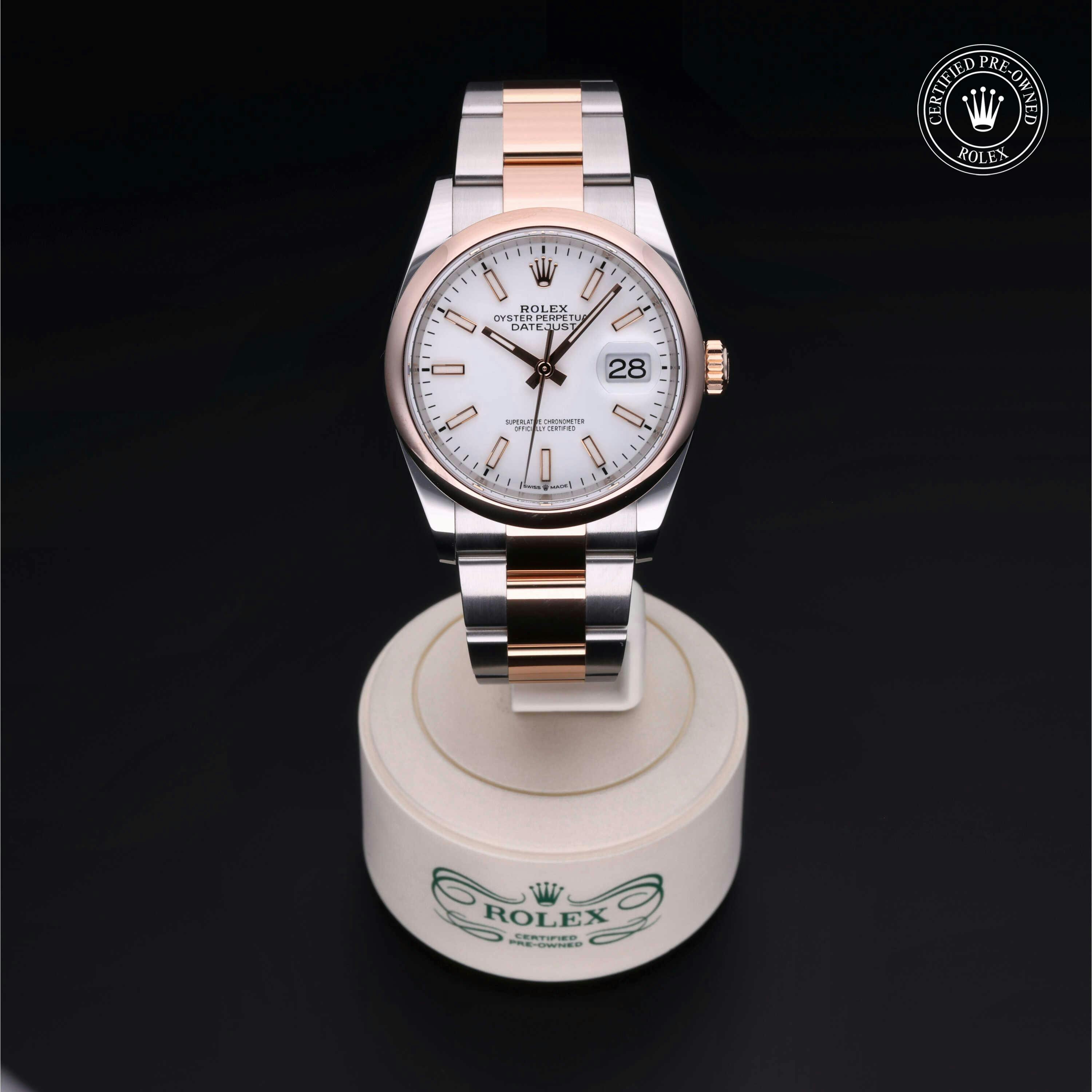 Rolex Certified Pre-Owned Datejust (126201) self - winding automatic watch, features a 36mm stainless case with an 18k rose gold domed bezel surrounding a white dial on a stainless steel and 18k rose gold oyster bracelet. Functions include hours, minutes and seconds. This watch has received Rolex-authorized service and certification. It comes with the original papers, and includes a custom Rolex Certified Pre-Owned hang tag, travel pouch and RCPO international warranty card.