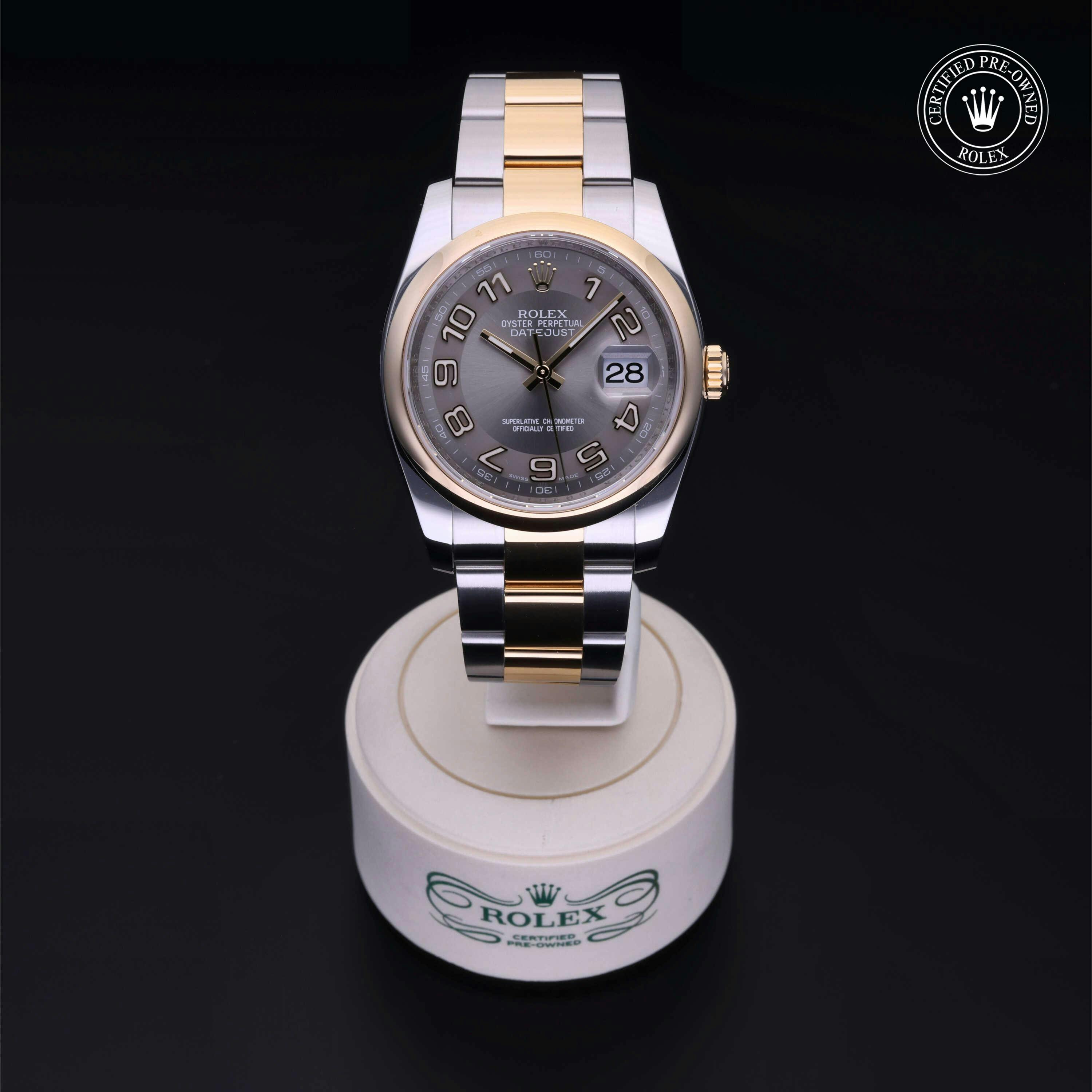 Rolex Certified Pre-Owned Datejust (116203) self - winding automatic watch, features a 36mm stainless case with an 18k yellow gold domed bezel surrounding a steel dial on a stainless steel and 18k yellow gold oyster bracelet. Functions include hours and minutes. This watch has received Rolex-authorized service and certification. It comes with the original box and papers, and includes a custom Rolex Certified Pre-Owned hang tag, travel pouch and RCPO international warranty card.