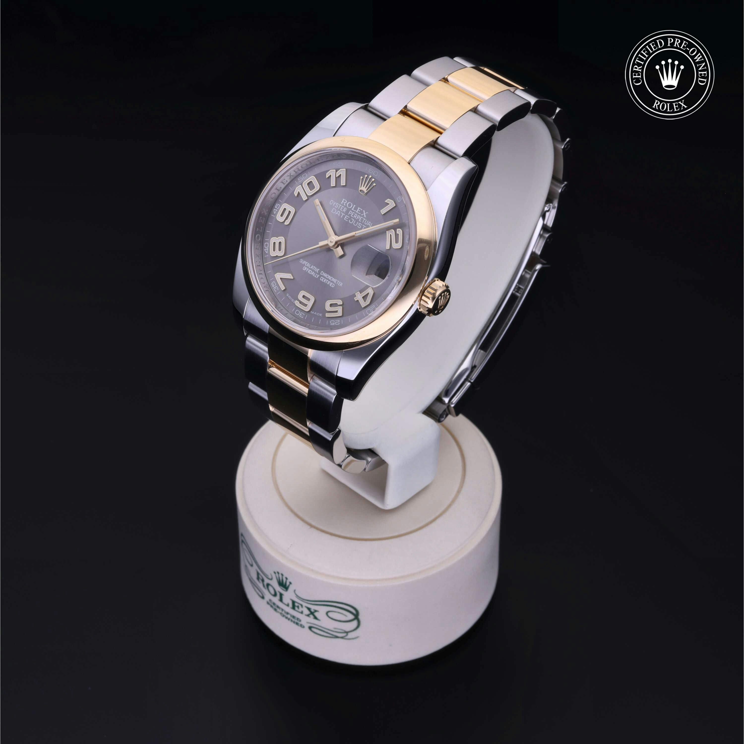 Rolex Certified Pre-Owned Datejust (116203) self - winding automatic watch, features a 36mm stainless case with an 18k yellow gold domed bezel surrounding a steel dial on a stainless steel and 18k yellow gold oyster bracelet. Functions include hours and minutes. This watch has received Rolex-authorized service and certification. It comes with the original box and papers, and includes a custom Rolex Certified Pre-Owned hang tag, travel pouch and RCPO international warranty card.