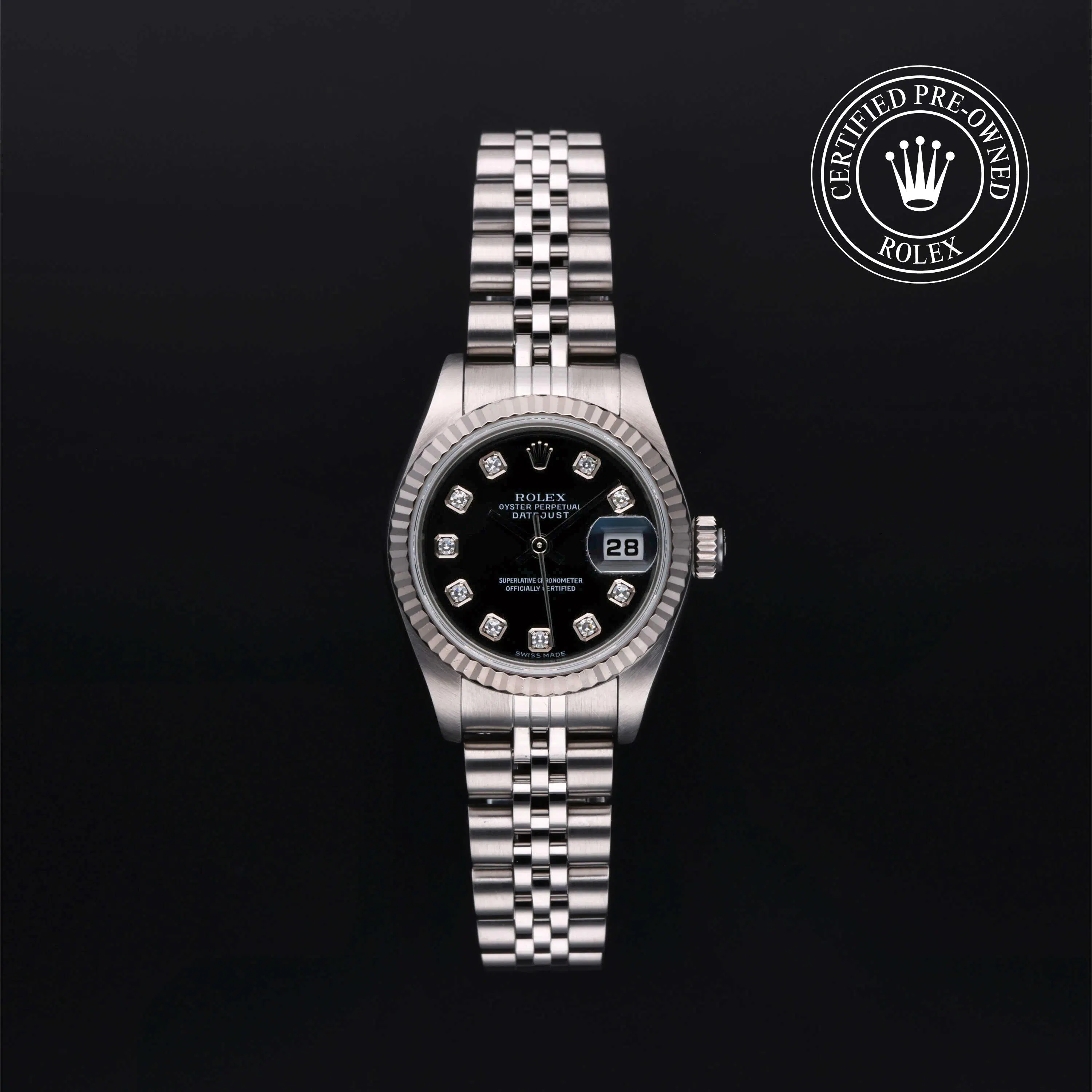 Rolex Certified Pre-Owned Datejust (79174) self - winding automatic watch, features a 26mm stainless steel case with an 18k white gold fluted bezel surrounding a black diamond set dial on a stainless steel Jubilee bracelet. Functions include hours, minutes, seconds and date. This watch has received Rolex-authorized service and certification. It comes with the original box and papers, and includes a custom Rolex Certified Pre-Owned hang tag, travel pouch and RCPO international warranty card.