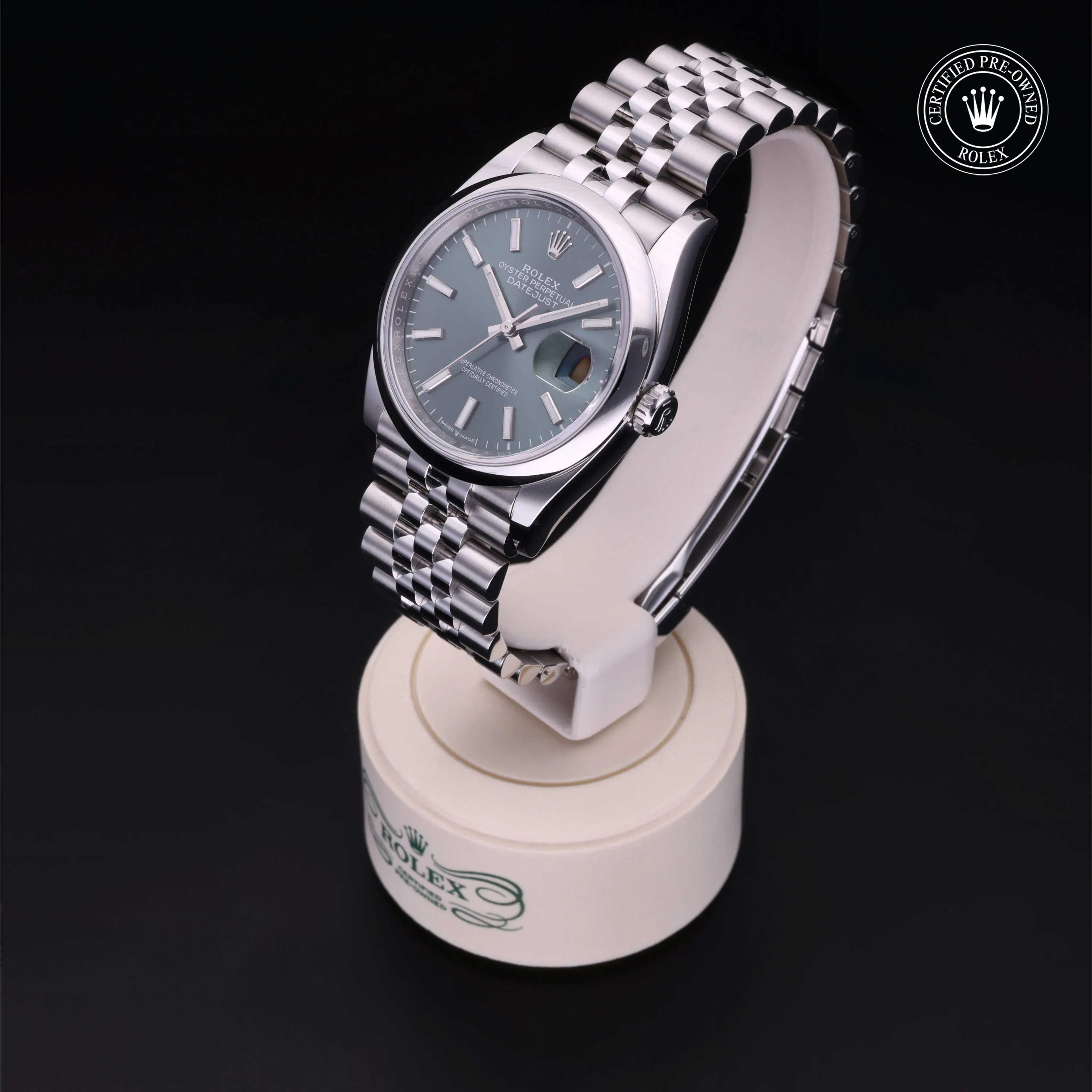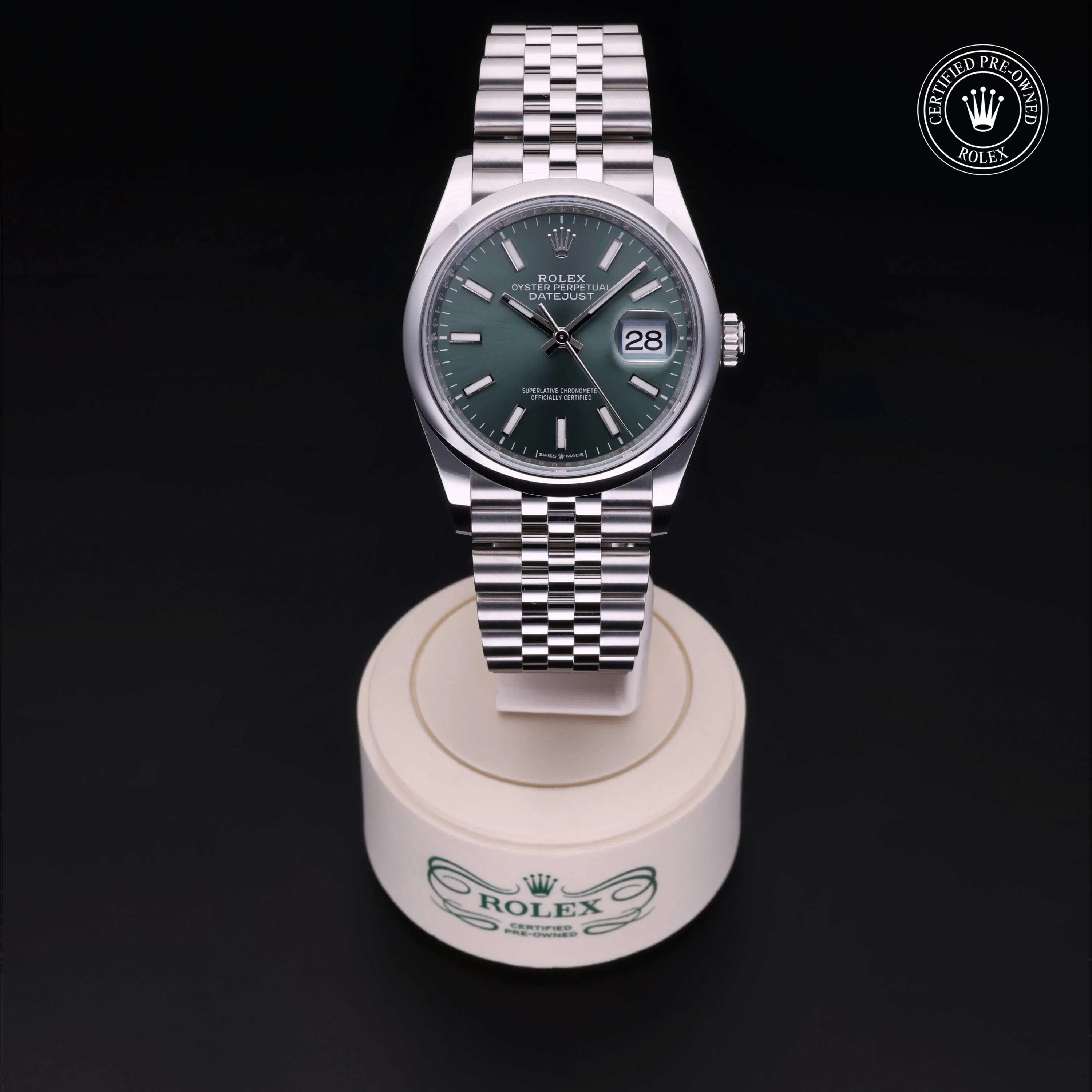 Rolex Certified Pre-Owned Datejust (126200) self - winding automatic watch, features a 36mm stainless steel case and domed bezel surrounding a mint green dial on a stainless steel jubilee bracelet. Functions include hours, minutes, seconds and date. This watch has received Rolex-authorized service and certification. It comes with the original box and papers, and includes a custom Rolex Certified Pre-Owned hang tag, travel pouch and RCPO international warranty card.