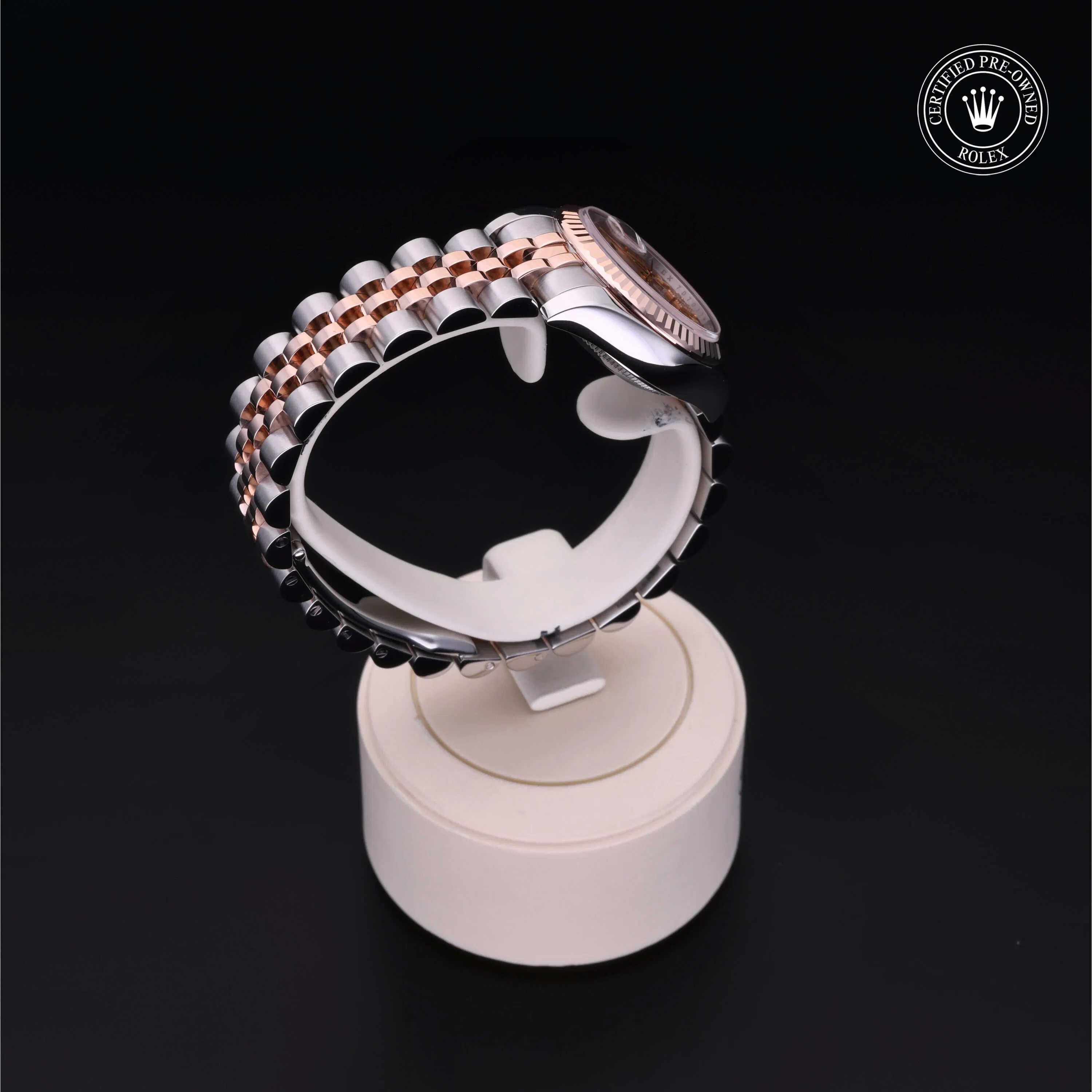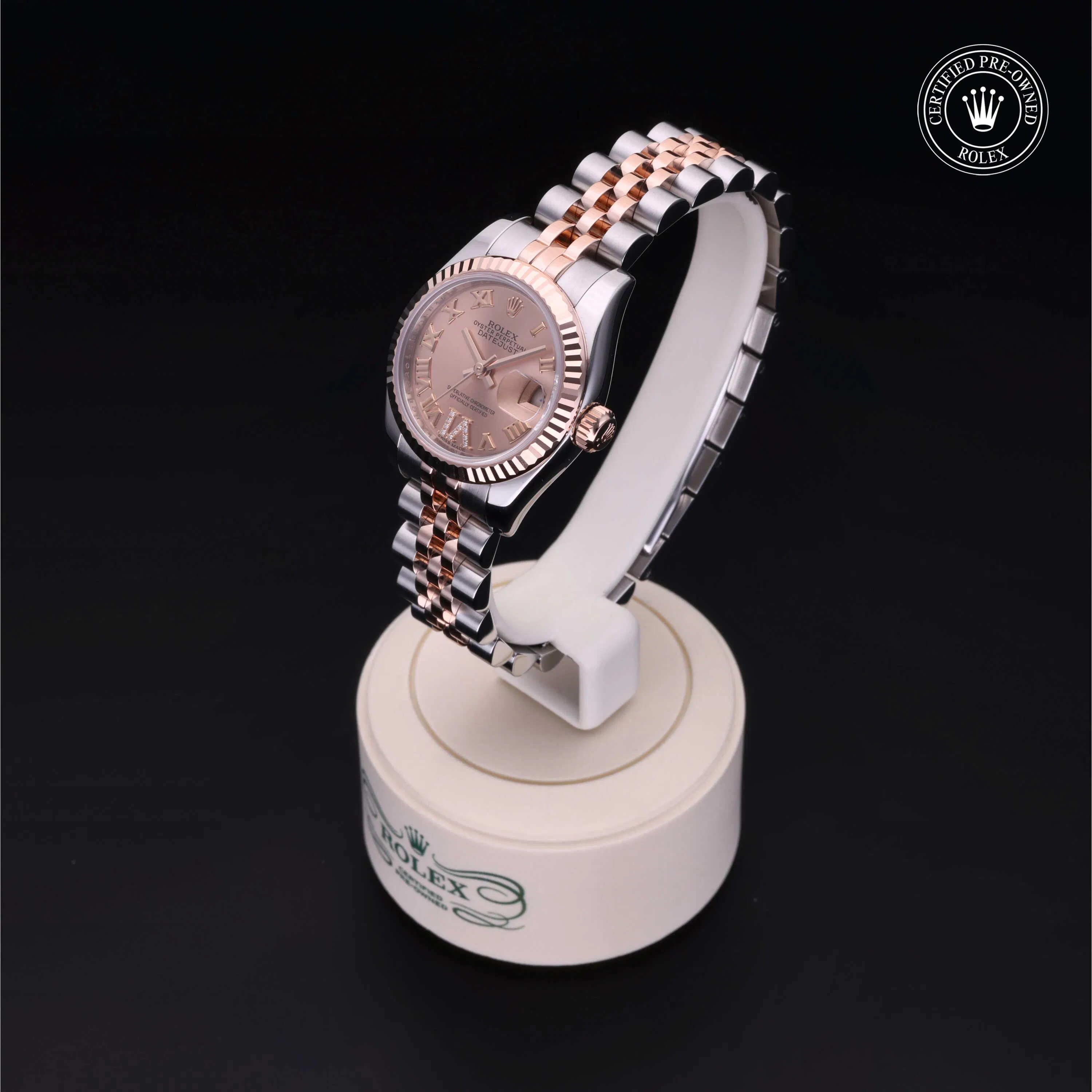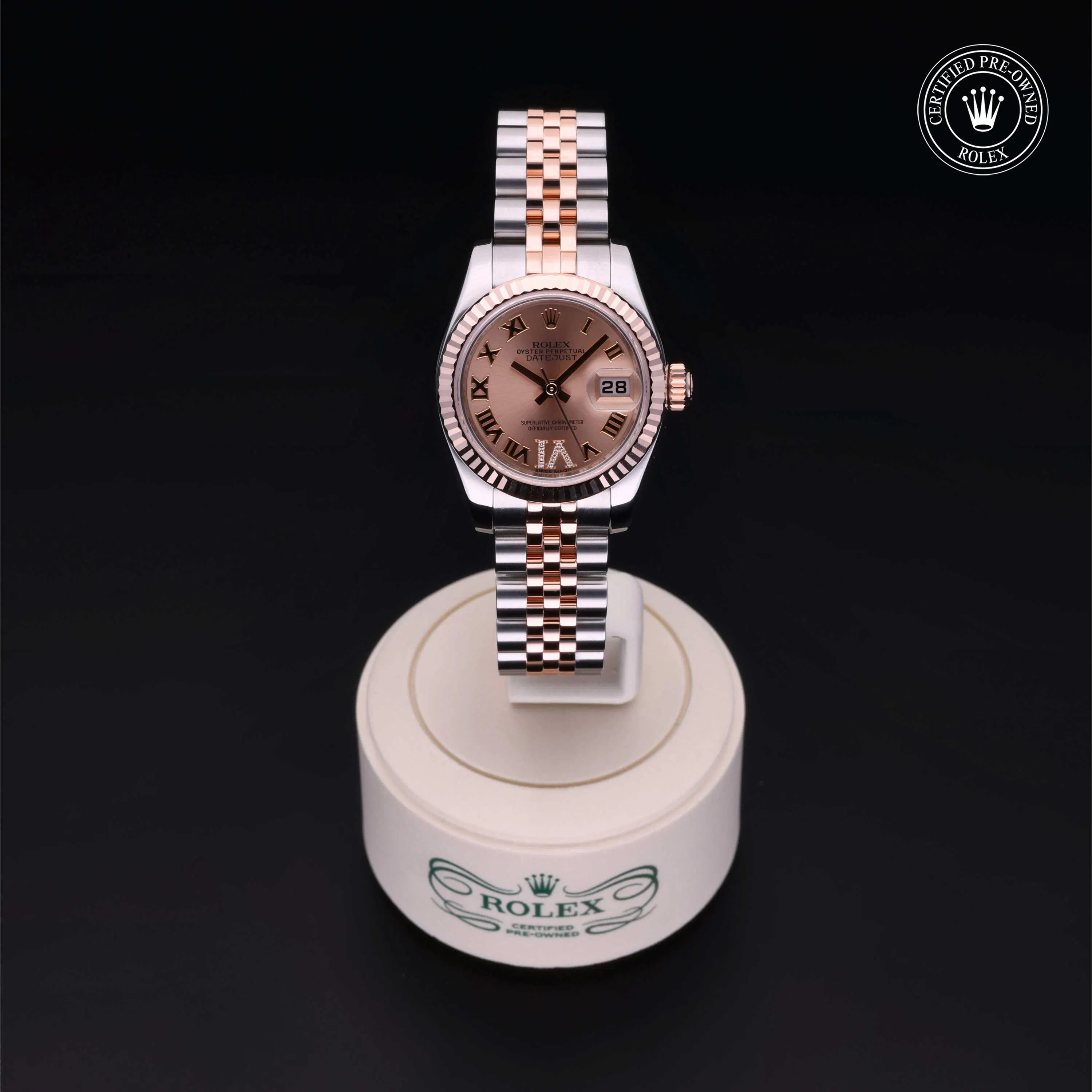 Rolex Certified Pre-Owned Datejust (179171) self - winding automatic watch, features a 26mm stainless steel case with an 18k rose gold fluted bezel surrounding a pink diamond set dial on a stainless steel and rose gold jubilee bracelet. Functions include hours, minutes, seconds and date. This watch has received Rolex-authorized service and certification. It does not come with the original box or papers, but includes a custom Rolex Certified Pre-Owned hang tag, travel pouch and RCPO international warranty card.