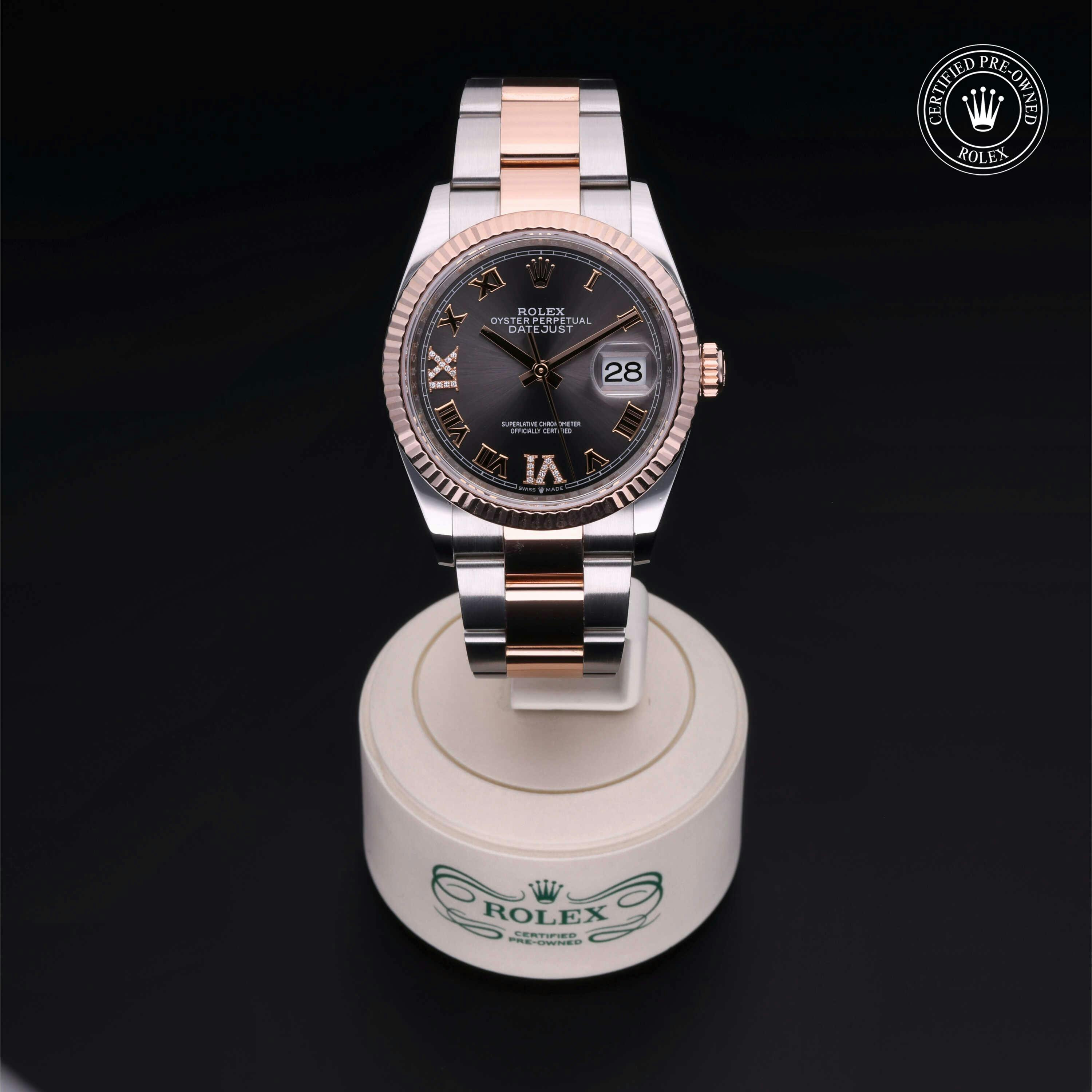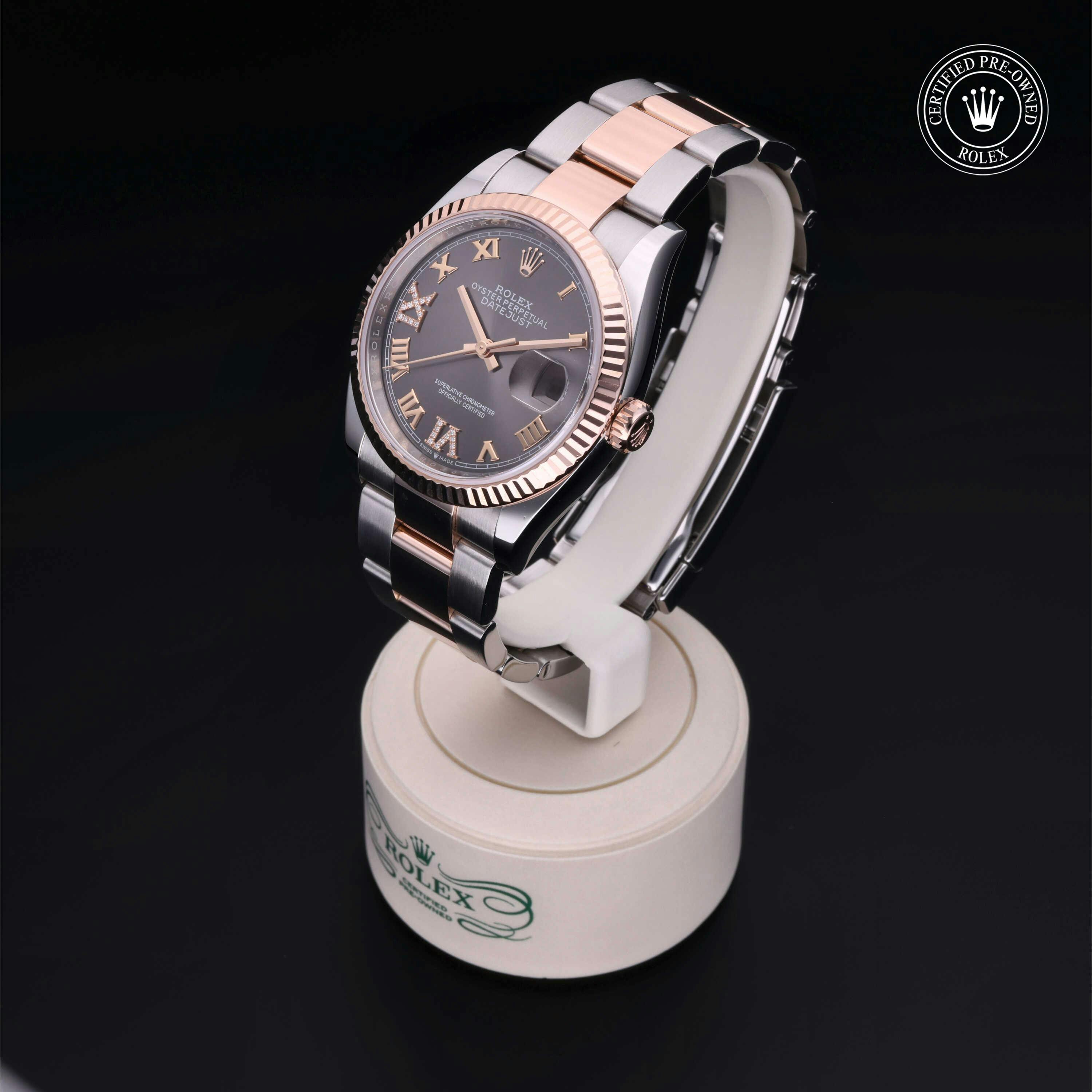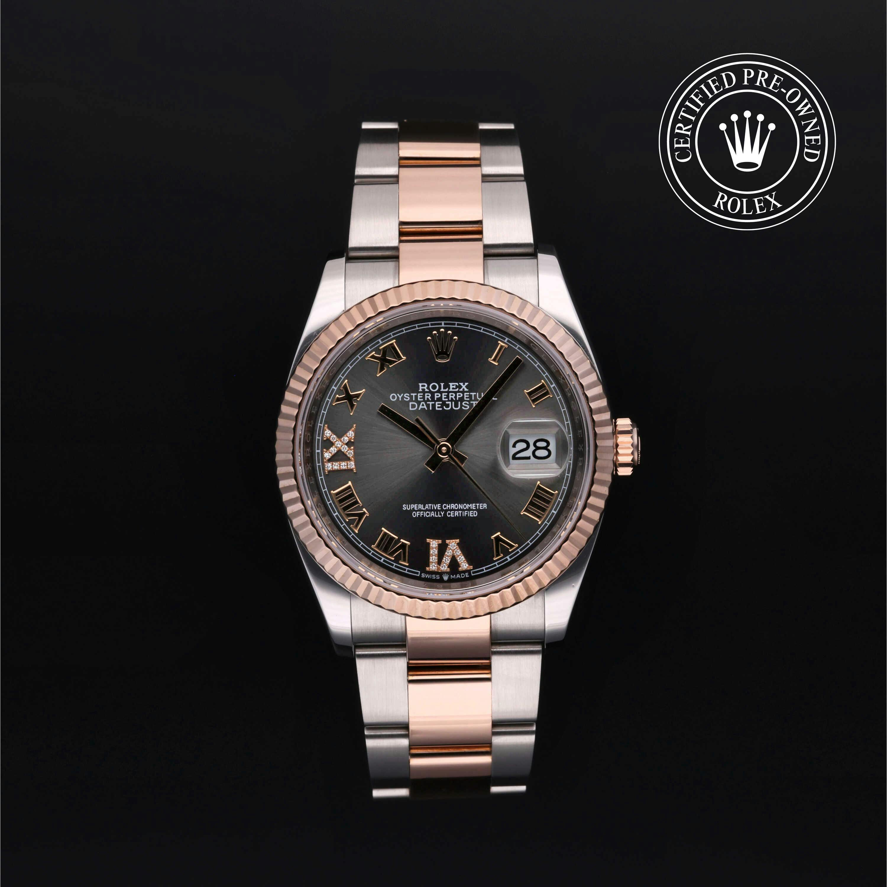 Rolex Certified Pre-Owned Datejust (126231) self - winding automatic watch, features a 36mm stainless steel case with an 18k rose gold fluted bezel surrounding a slate diamond set dial on a stainless steel and 18k rose gold oyster bracelet. Functions include hours, minutes, seconds and date. This watch has received Rolex-authorized service and certification. It comes with the original papers, and includes a custom Rolex Certified Pre-Owned hang tag, travel pouch and RCPO international warranty card.