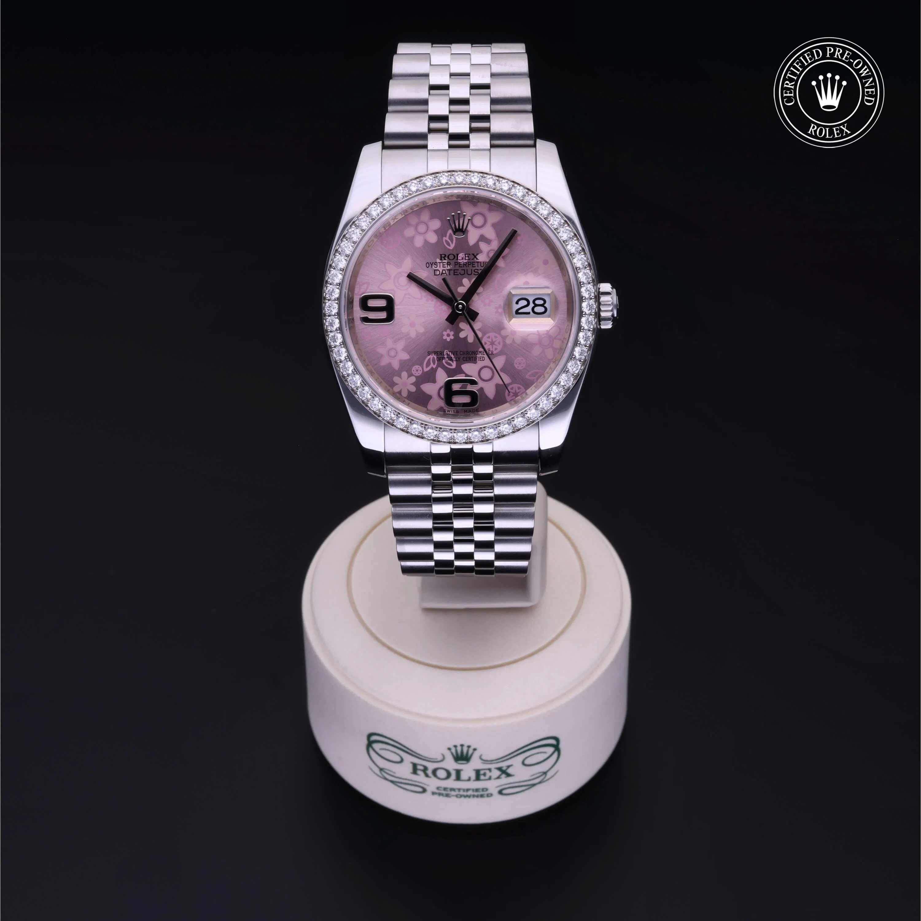 Rolex Certified Pre-Owned Datejust (116244) self - winding automatic watch, features a 36mm stainless steel case with an 18k white gold diamond set bezel surrounding a pink, floral motif dial on a stainless steel jubilee bracelet. Functions include hours, minutes, seconds and date. This watch has received Rolex-authorized service and certification. It comes with the original box, and includes a custom Rolex Certified Pre-Owned hang tag, travel pouch and RCPO international warranty card.