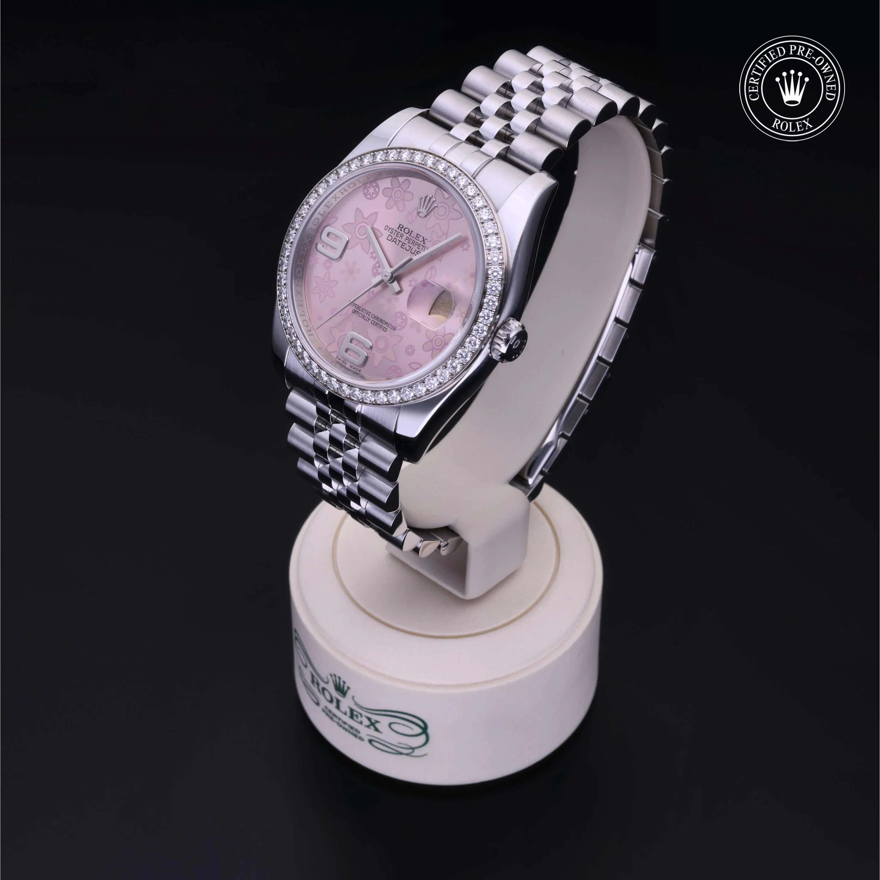 Rolex Certified Pre-Owned Datejust (116244) self - winding automatic watch, features a 36mm stainless steel case with an 18k white gold diamond set bezel surrounding a pink, floral motif dial on a stainless steel jubilee bracelet. Functions include hours, minutes, seconds and date. This watch has received Rolex-authorized service and certification. It comes with the original box, and includes a custom Rolex Certified Pre-Owned hang tag, travel pouch and RCPO international warranty card.
