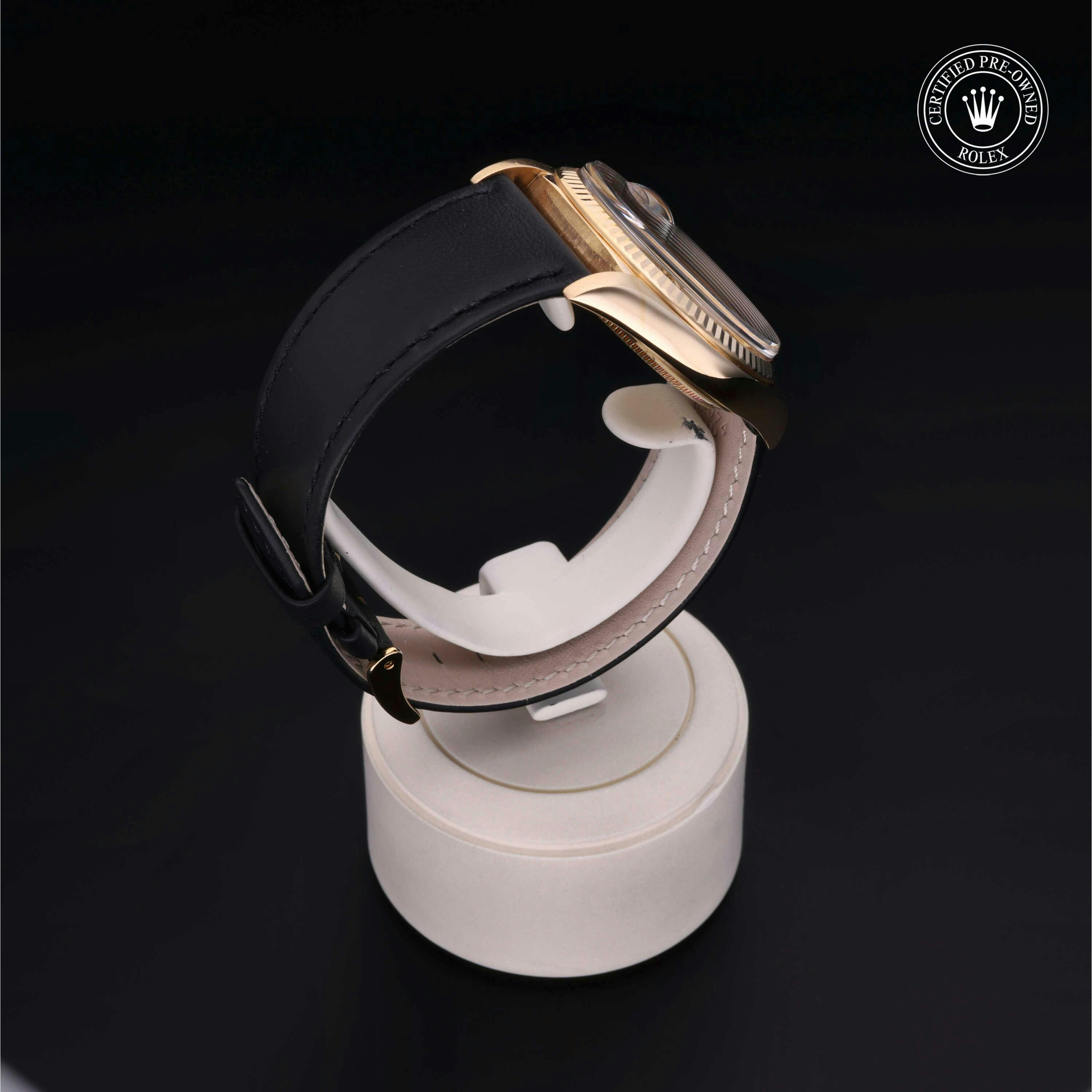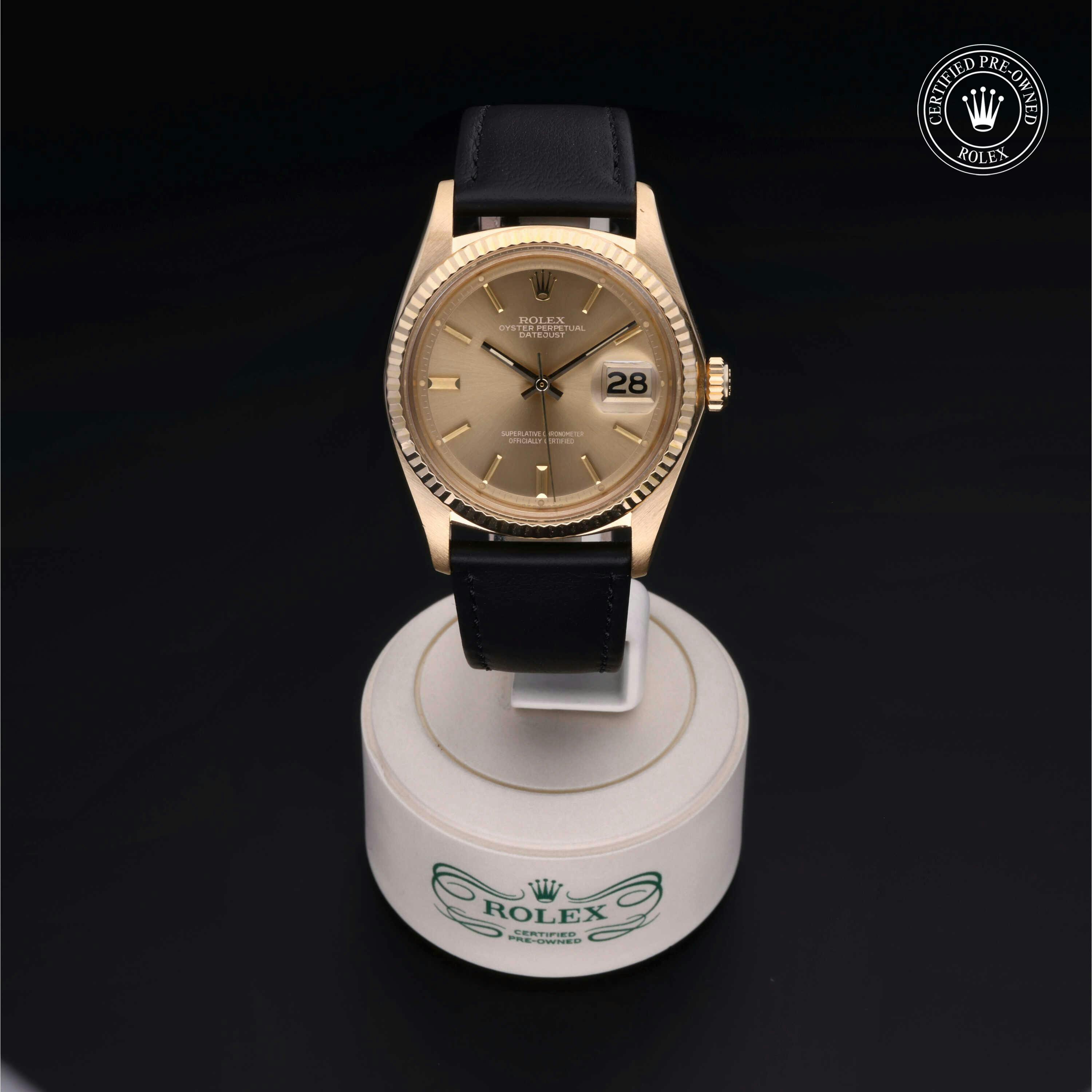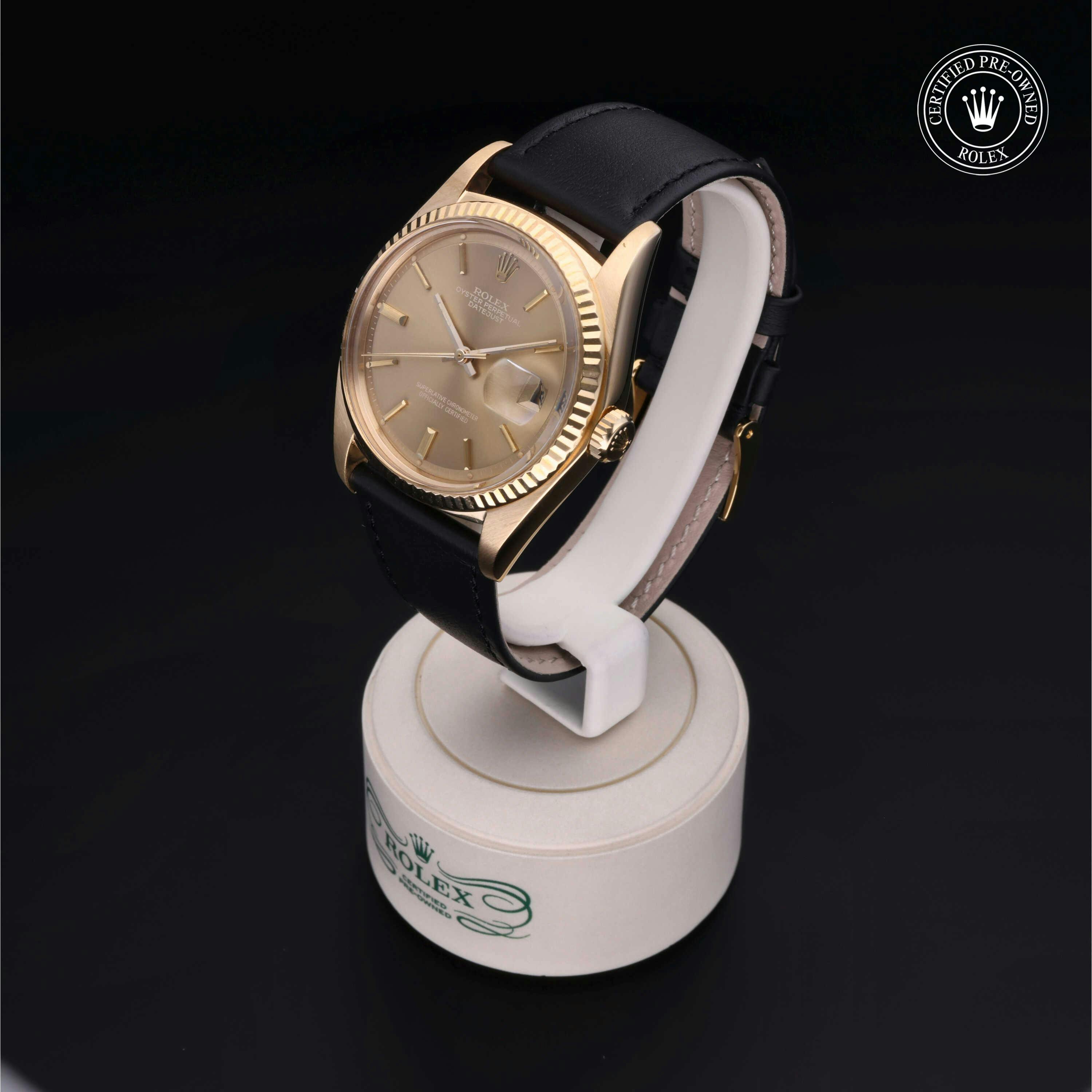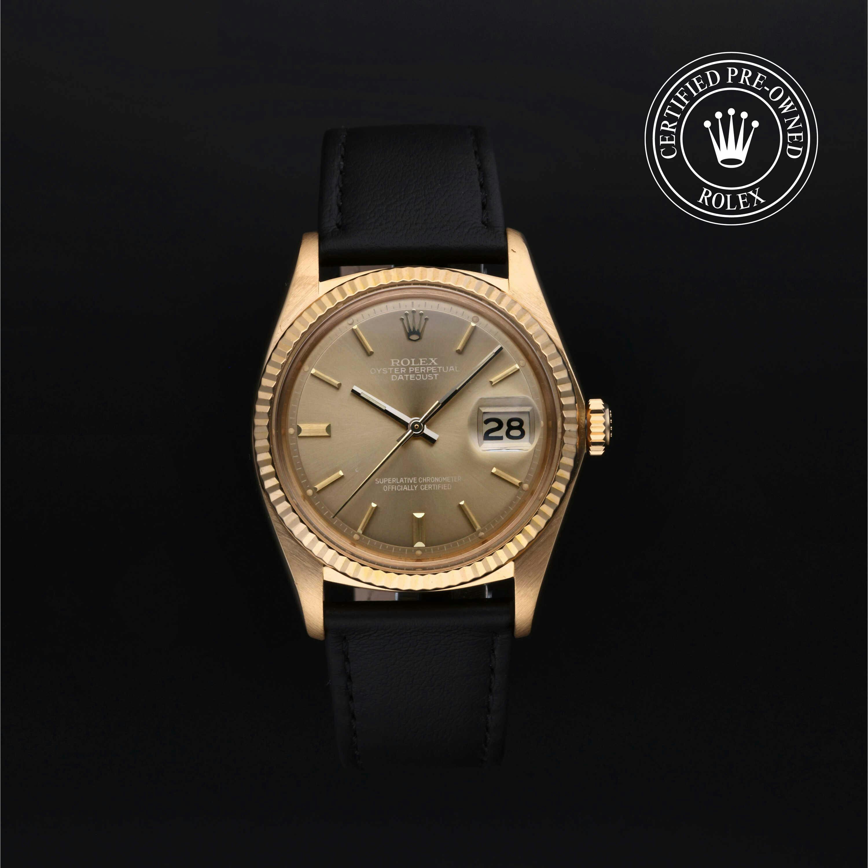 Rolex Certified Pre-Owned Datejust (1601) self - winding automatic watch, features a 36mm 18k yellow gold case and fluted bezel surrounding a bronze dial on a black buffalo strap with an 18k yellow gold tang buckle. Functions include hours, minutes, seconds and date. This watch has received Rolex-authorized service and certification. It does not come with the original box or papers, but includes a custom Rolex Certified Pre-Owned hang tag, travel pouch, and RCPO international warranty card.