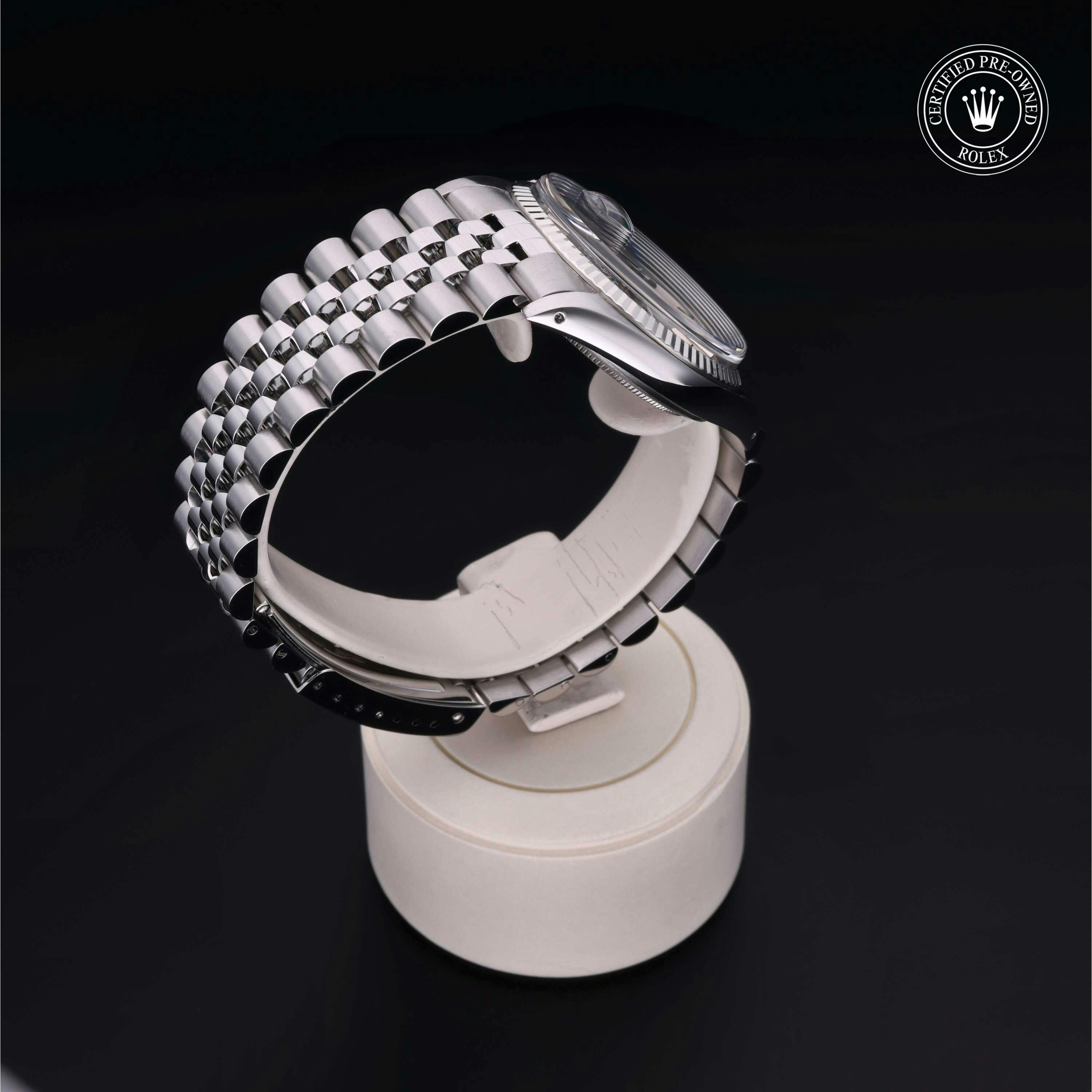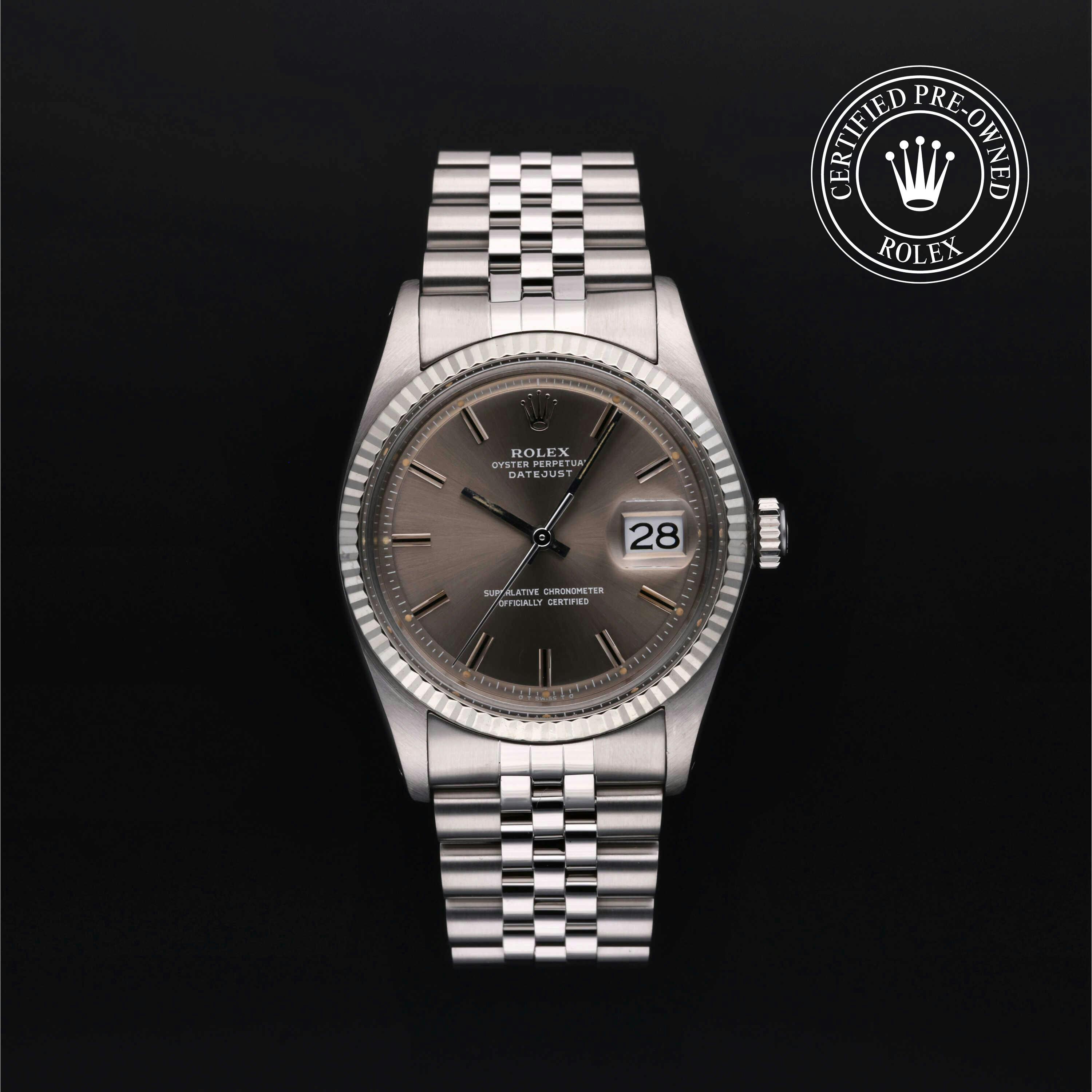 Rolex Certified Pre-Owned Datejust (1601) self - winding automatic watch, features a 36mm stainless steel case with an 18k white gold fluted bezel surrounding a gray dial on a stainless steel jubilee bracelet. Functions include hours, minutes and seconds. This watch has received Rolex-authorized service and certification. It does not come with the original box or papers, but includes a custom Rolex Certified Pre-Owned hang tag, travel pouch and RCPO international warranty card.