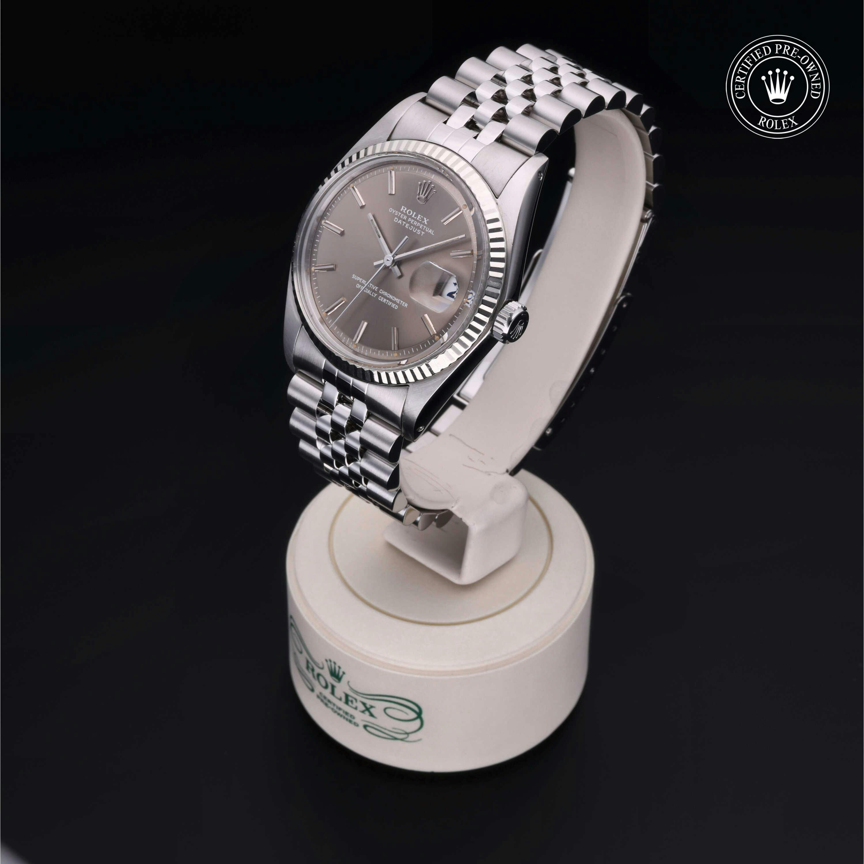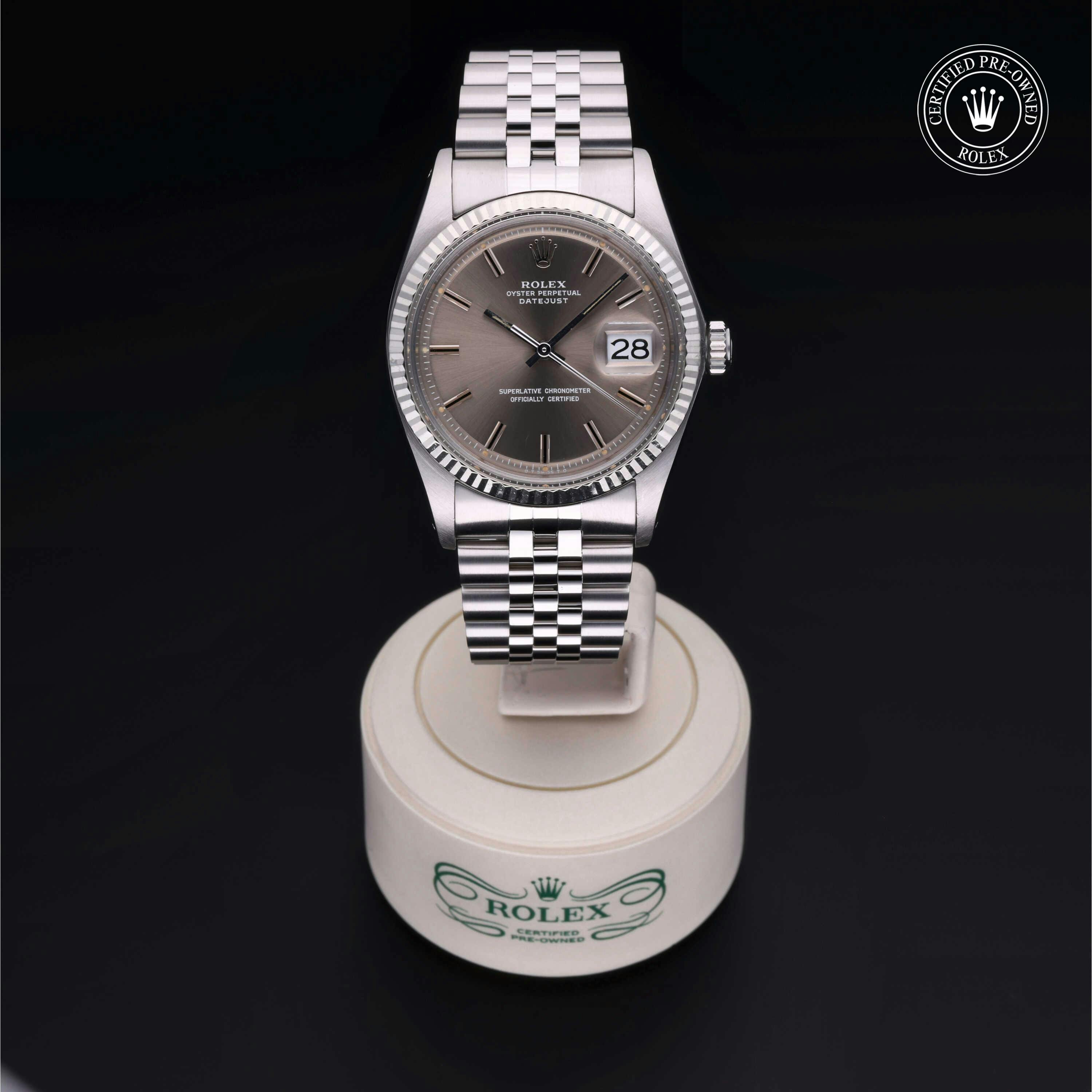Rolex Certified Pre-Owned Datejust (1601) self - winding automatic watch, features a 36mm stainless steel case with an 18k white gold fluted bezel surrounding a gray dial on a stainless steel jubilee bracelet. Functions include hours, minutes and seconds. This watch has received Rolex-authorized service and certification. It does not come with the original box or papers, but includes a custom Rolex Certified Pre-Owned hang tag, travel pouch and RCPO international warranty card.