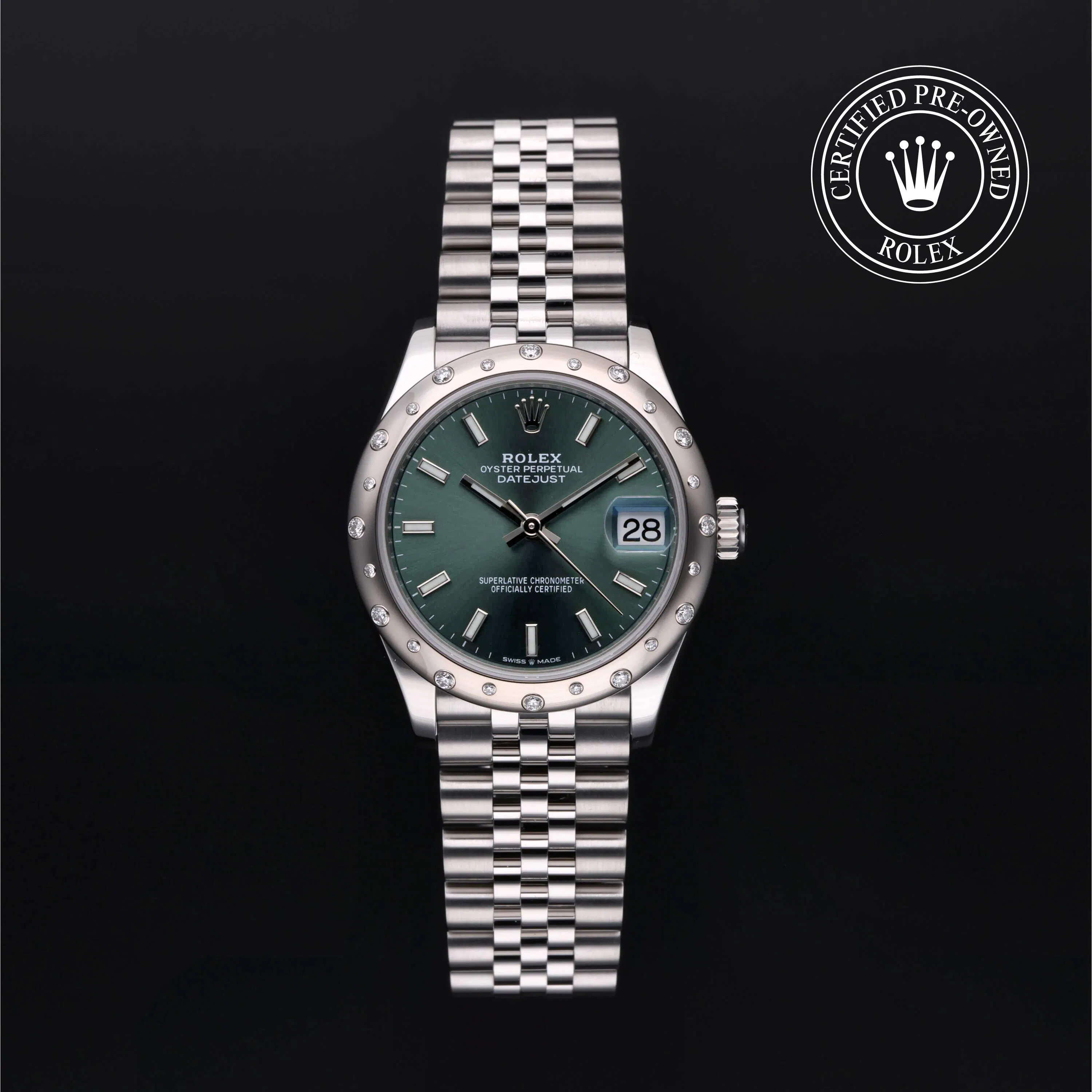 Rolex Certified Pre-Owned Datejust (278344RBR) self - winding automatic watch, features a 31mm stainless steel case with an 18k white gold domed diamond set bezel surrounding a mint green index dial. The watch is secured on a stainless steel Jubilee bracelet complete with a folding buckle. Functions include hours, minutes, seconds and date. This watch has been serviced by an authorized service center and certified by Rolex. It comes with the original box and papers as well as a custom Rolex Certified Pre-Owned hang tag, travel pouch and international warranty card.