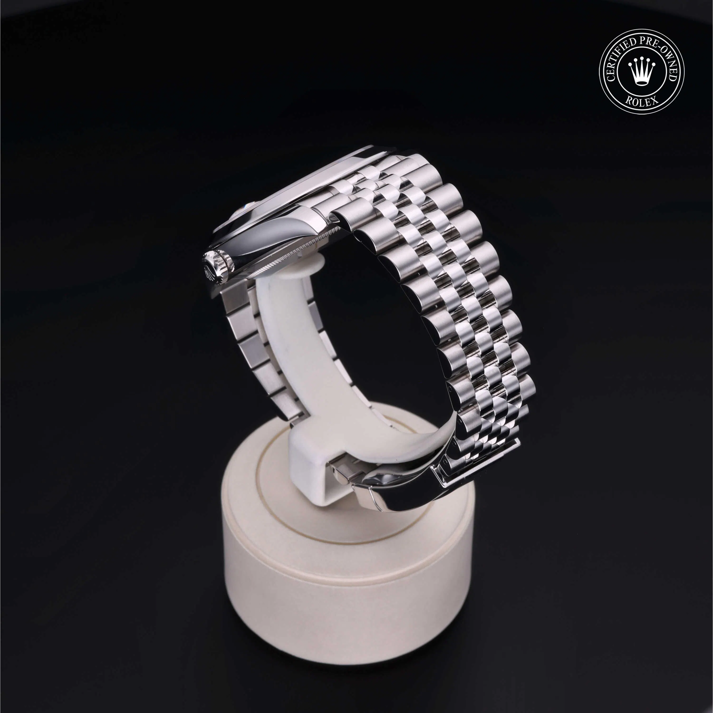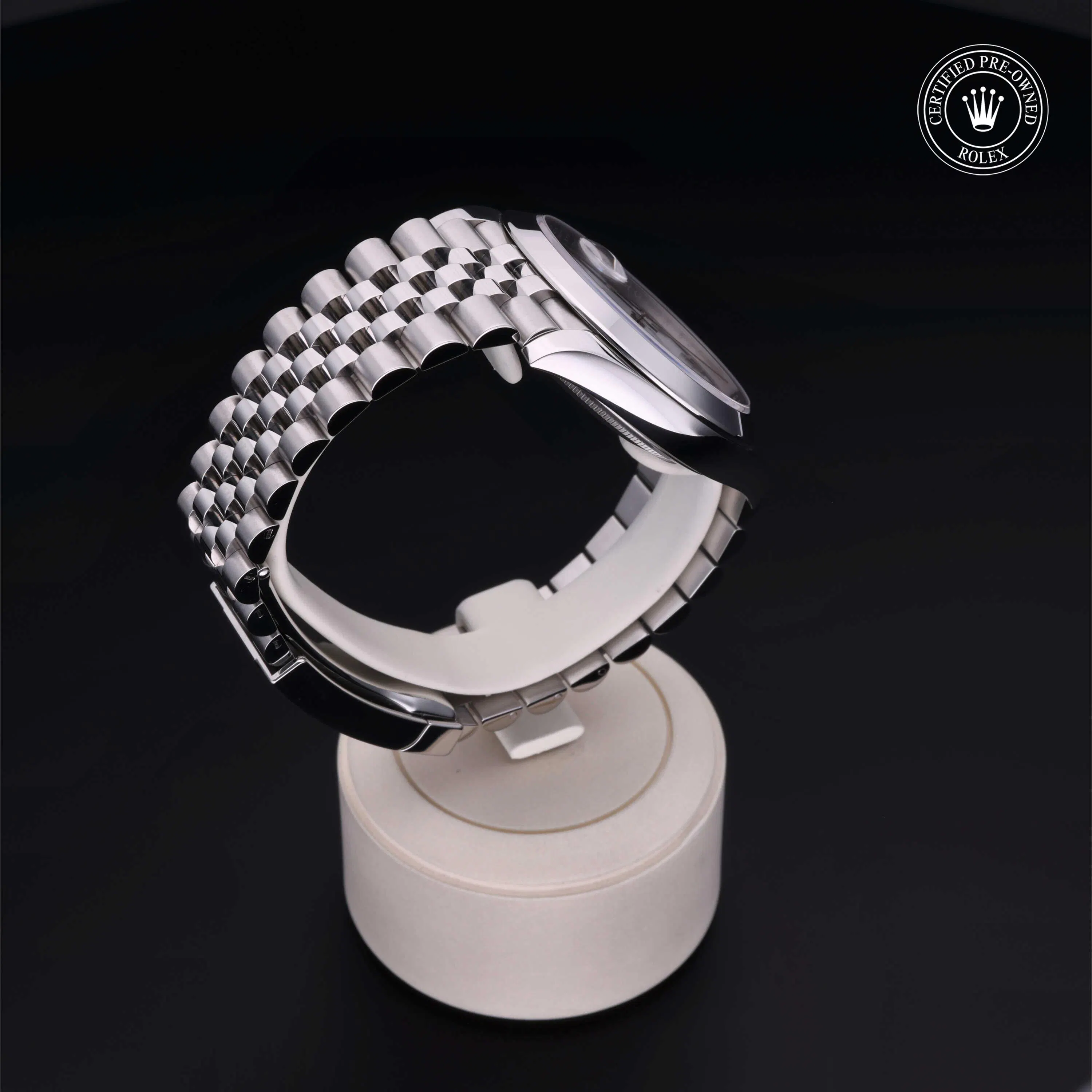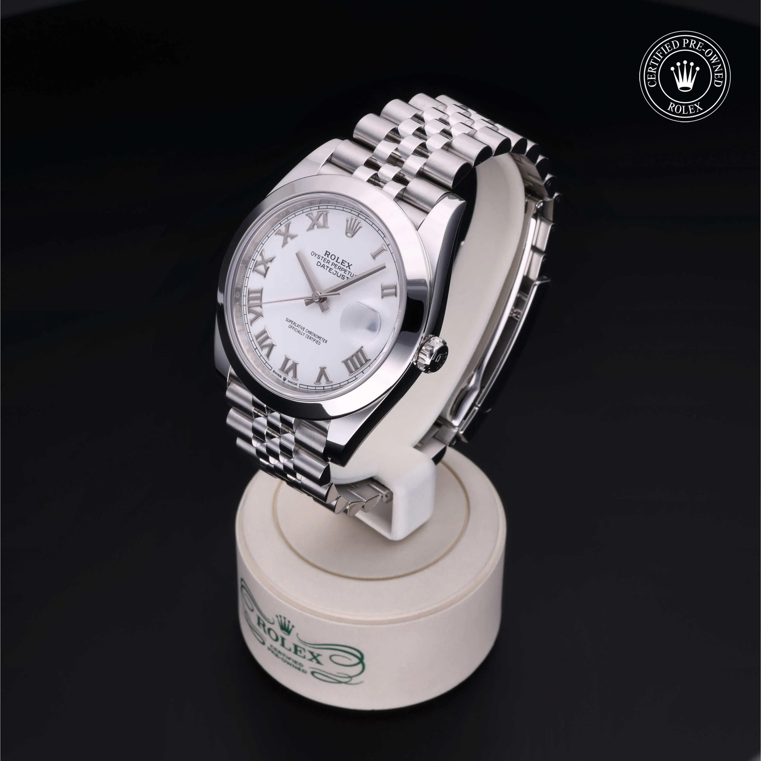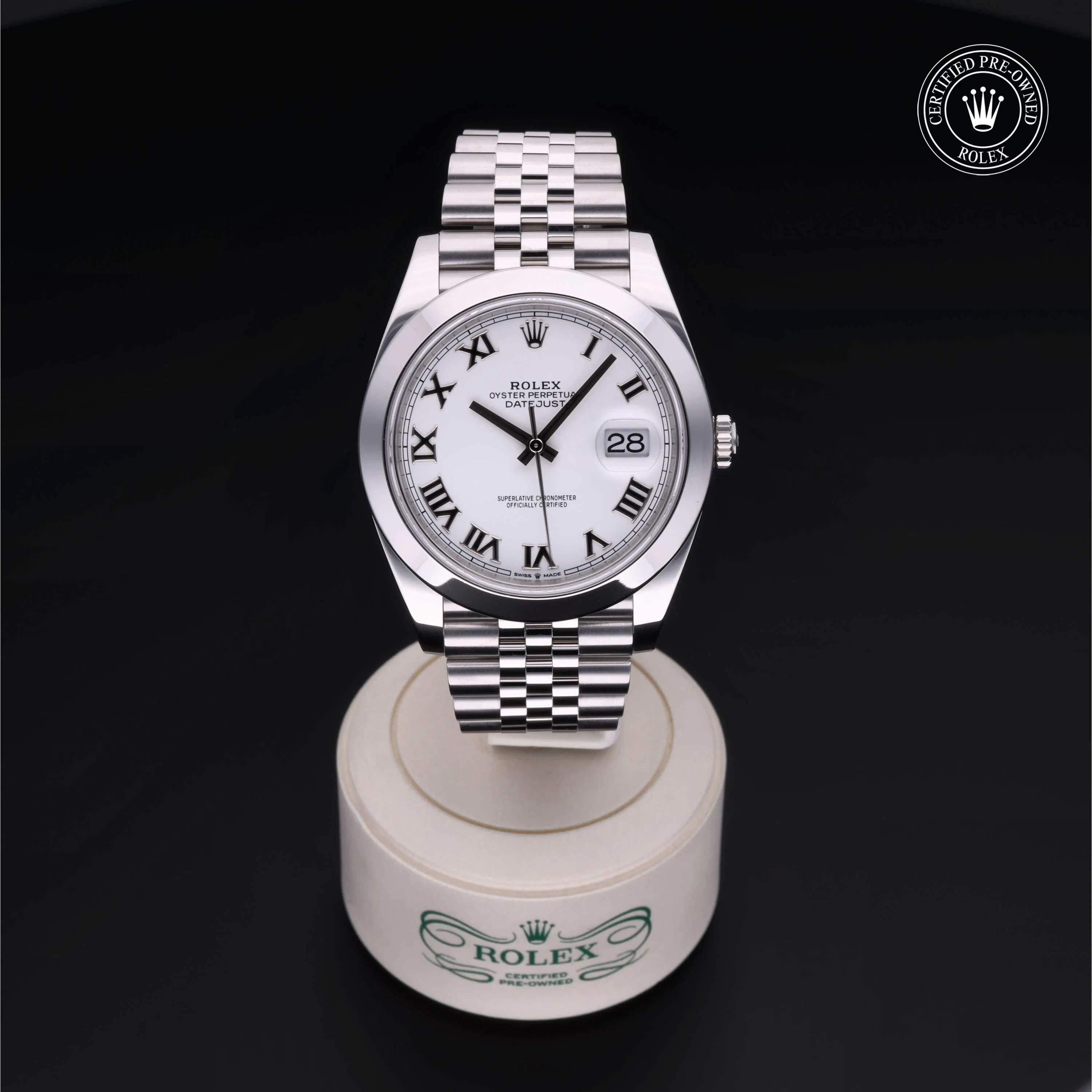 Rolex Certified Pre-Owned Datejust (126300) self - winding automatic watch, features a 41mm stainless steel case and smooth bezel surrounding a white dial on a stainless steel jubilee bracelet. Functions include hours, minutes, seconds and date. This watch has received Rolex-authorized service and certification. It comes with the original box and papers, and includes a custom Rolex Certified Pre-Owned hang tag, travel pouch and RCPO international warranty card.