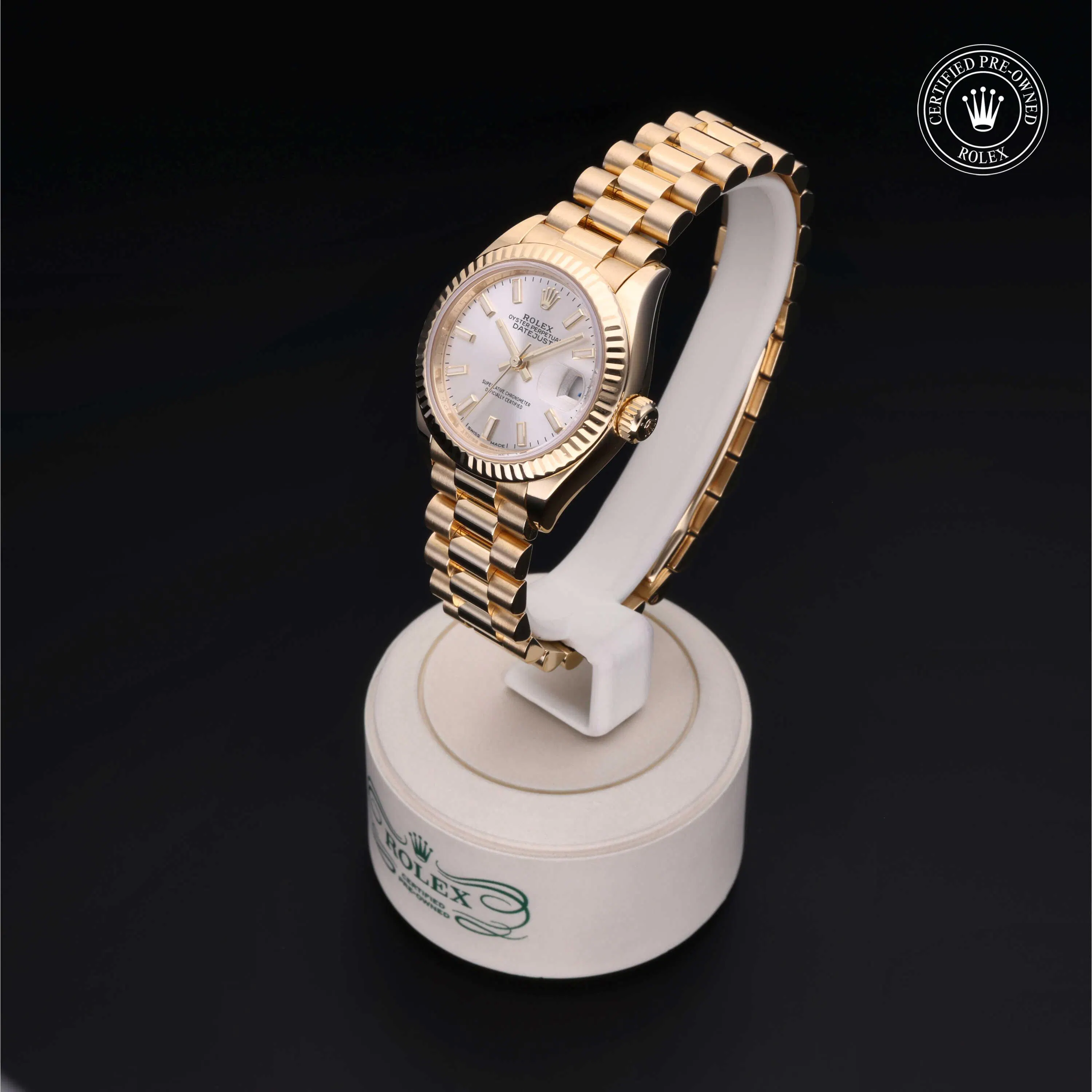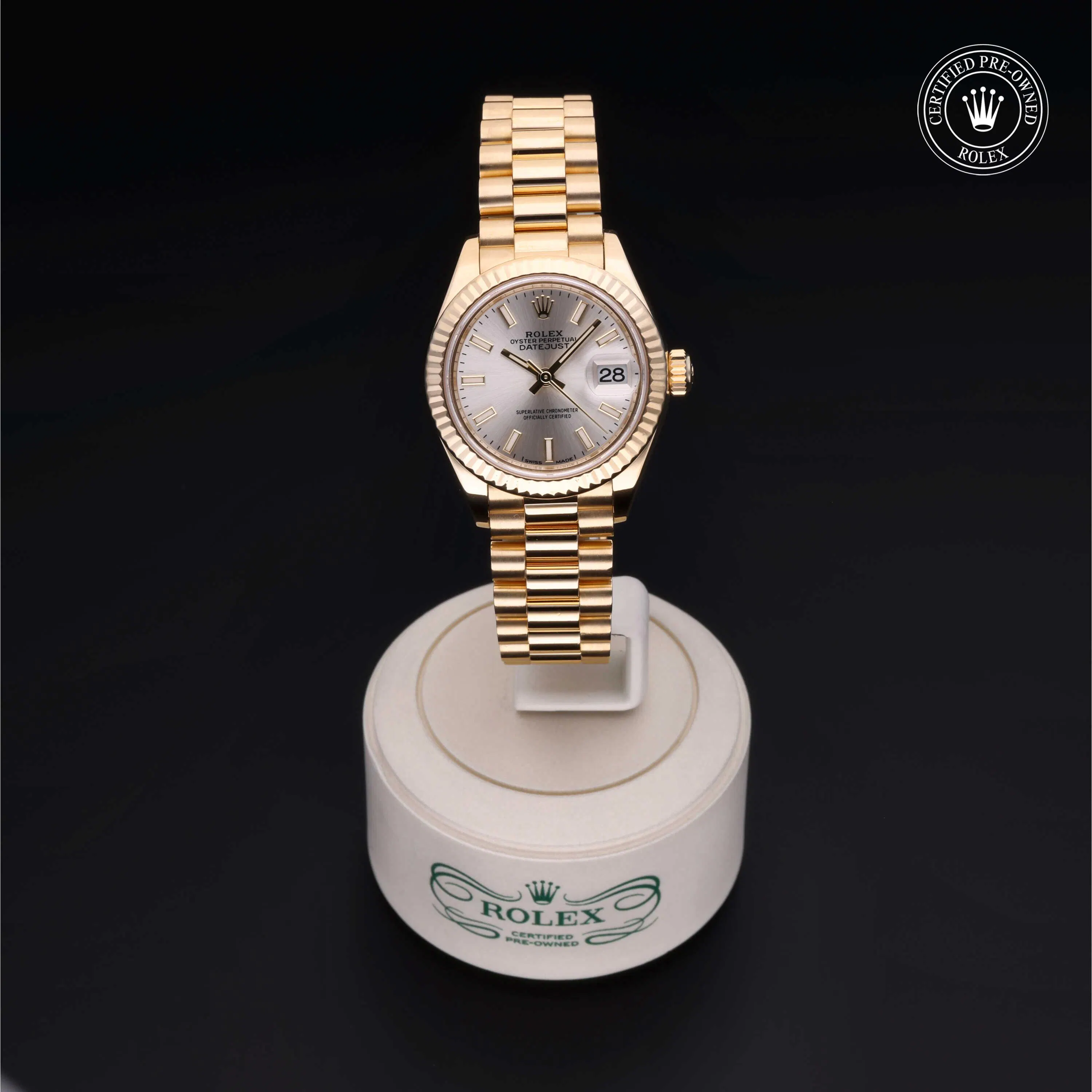 Rolex Certified Pre-Owned Datejust (279178) self - winding automatic watch, features a 28mm 18k yellow gold case and fluted bezel surrounding a silver dial on an 18k yellow gold president bracelet. Functions include hours, minutes, seconds and date. This watch has received Rolex-authorized service and certification. It does not come with the original box or papers, but includes a custom Rolex Certified Pre-Owned hang tag, travel pouch and RCPO international warranty card.