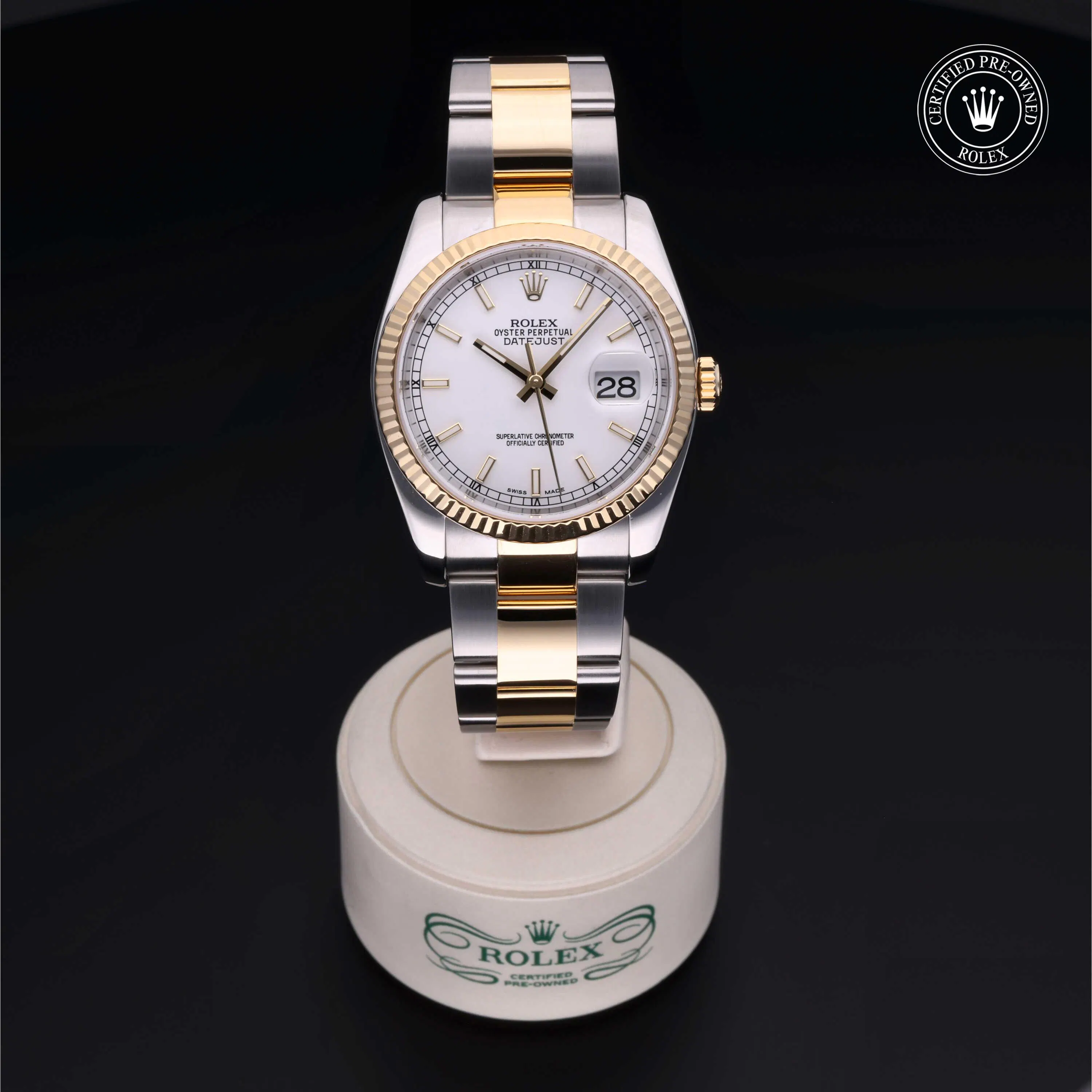 Rolex Certified Pre-Owned Datejust (116233) self - winding automatic watch, features a 36mm stainless steel case with an 18k yellow gold fluted bezel surrounding a white dial on a stainless steel and 18k yellow gold oyster bracelet. Functions include hours, minutes and seconds. This watch has received Rolex-authorized service and certification. It comes with the original box and papers, and includes a custom Rolex Certified Pre-Owned hang tag, travel pouch and RCPO international warranty card.