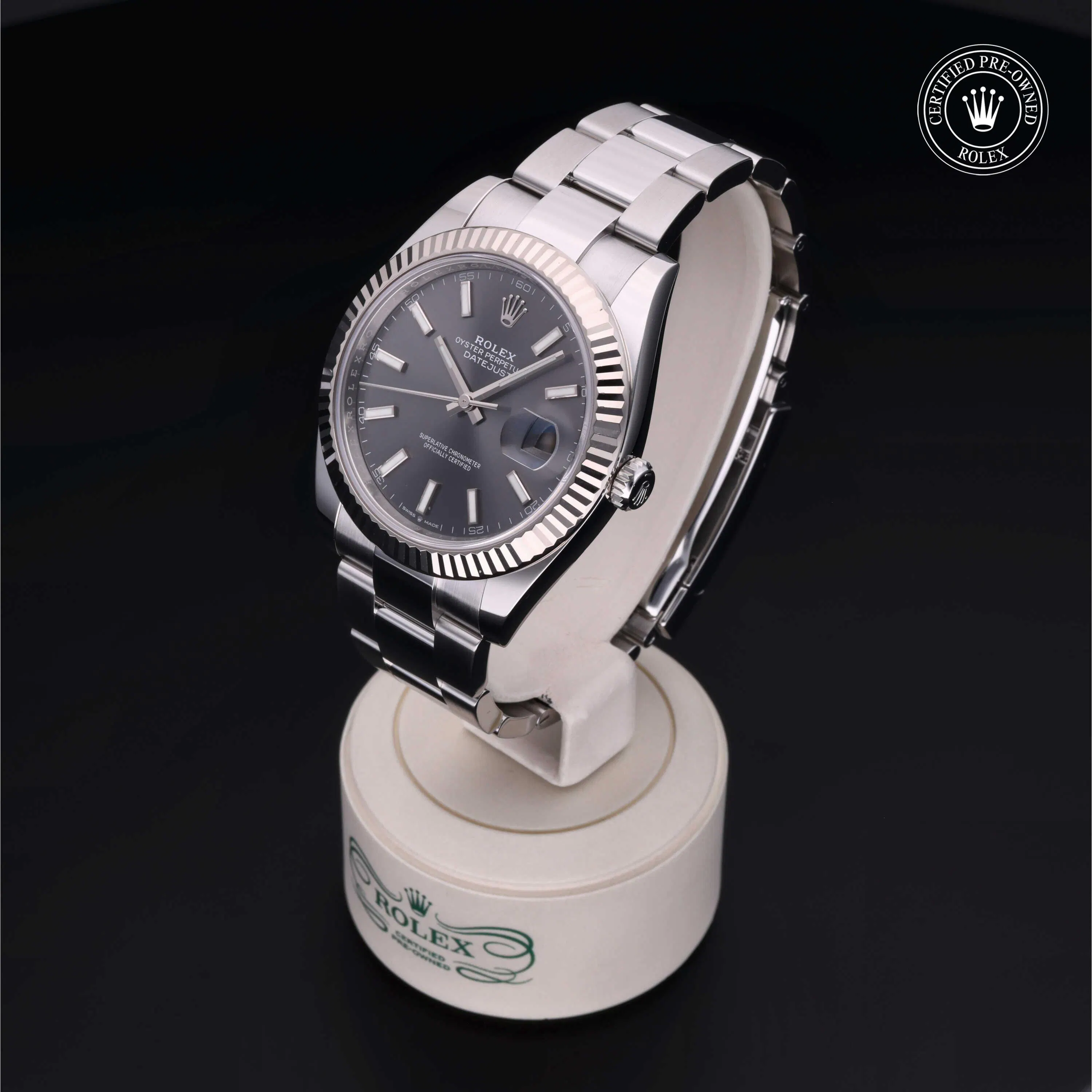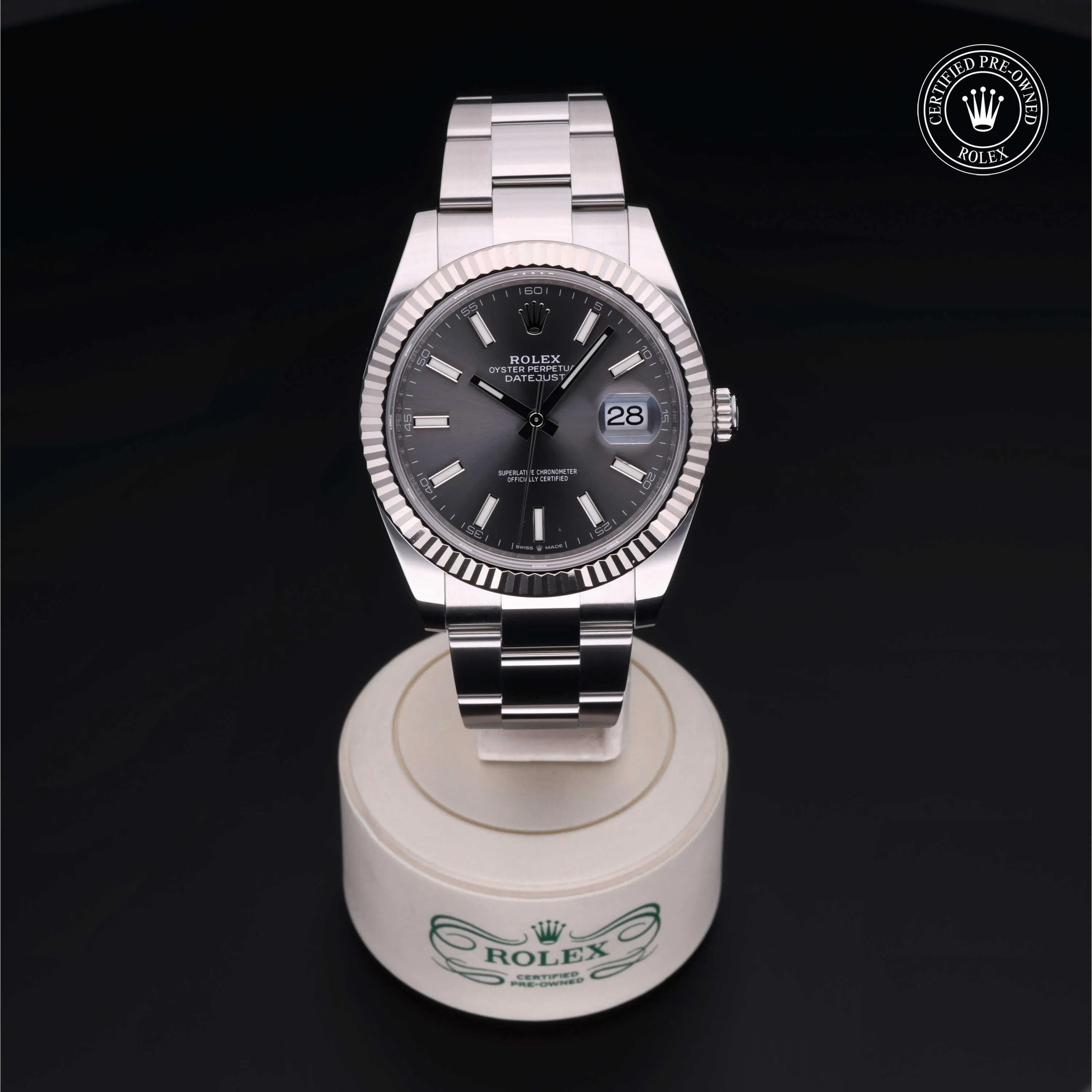 Rolex Certified Pre-Owned Datejust (126334) self - winding automatic watch, features a 41mm stainless steel case with an 18k white gold fluted bezel surrounding a slate dial on a stainless steel oyster bracelet. Functions include hours, minutes, seconds and date. This watch has received Rolex-authorized service and certification. It comes with the original box and papers, and includes a custom Rolex Certified Pre-Owned hang tag, travel pouch and RCPO international warranty card.