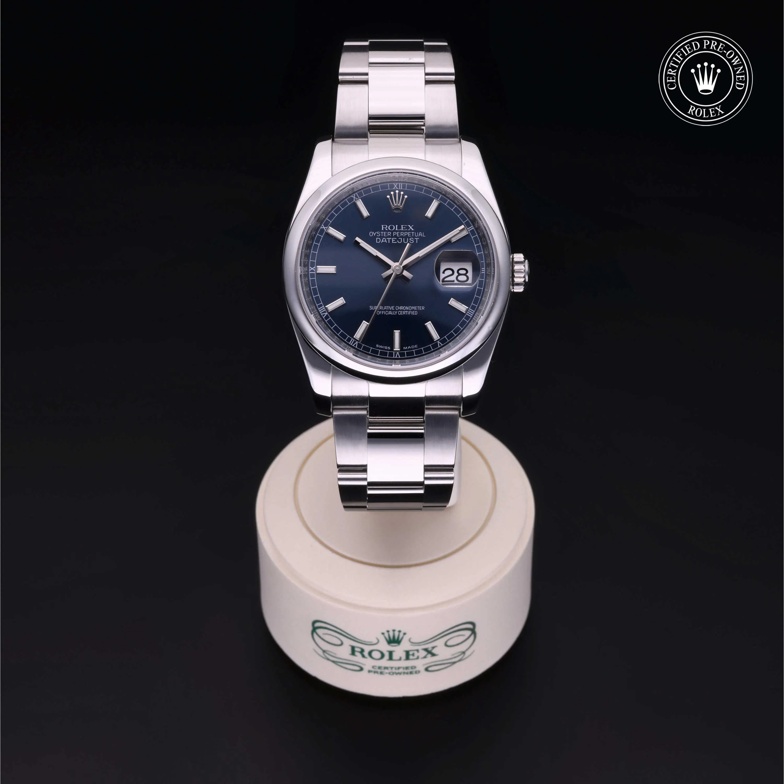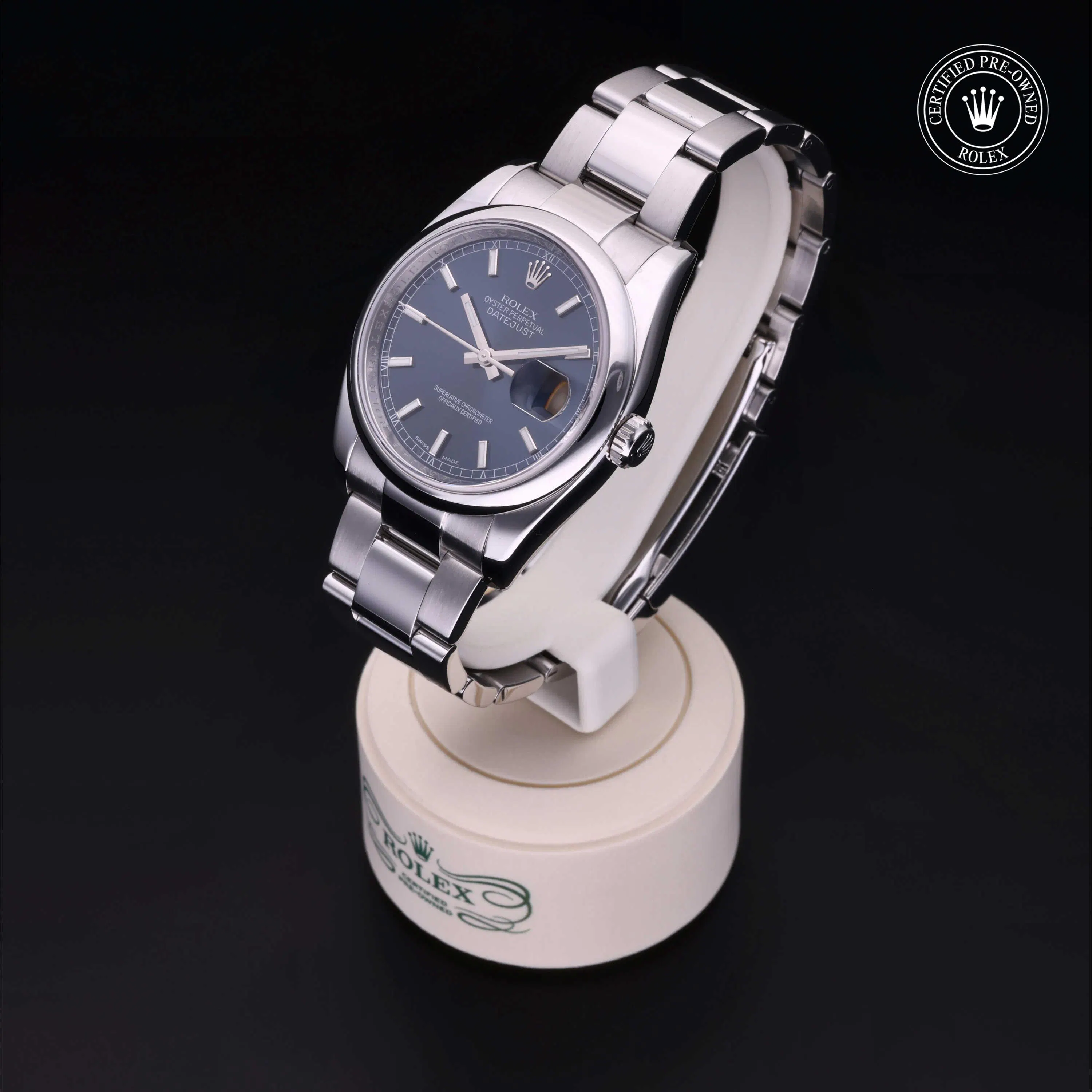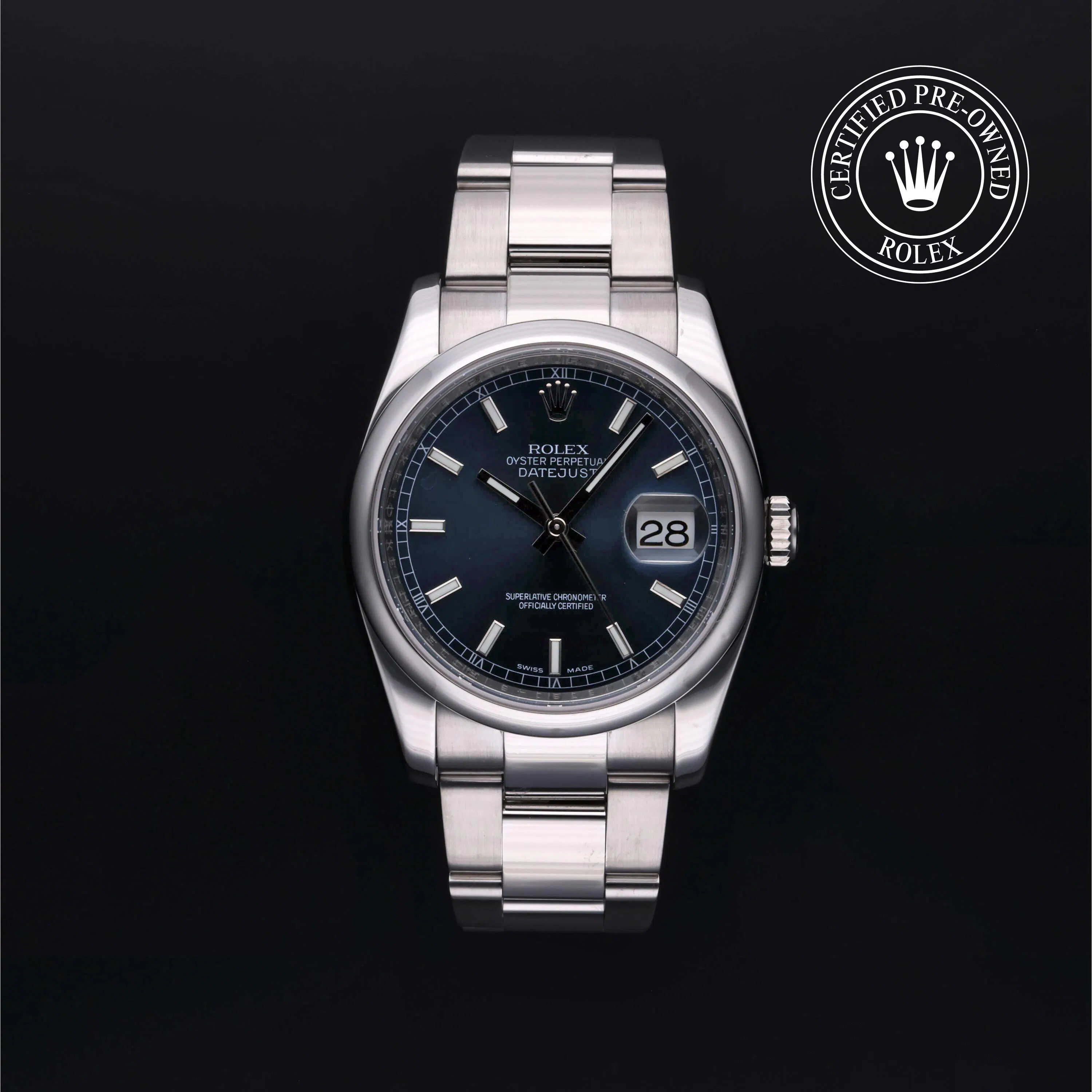 Rolex Certified Pre-Owned Datejust (116200) self - winding automatic watch, features a 36mm stainless steel case and domed bezel surrounding a blue dial on a stainless steel oyster bracelet. Functions include hours, minutes, seconds and date. This watch has received Rolex-authorized service and certification. It comes with the original box and papers, and includes a custom Rolex Certified Pre-Owned hang tag, travel pouch and RCPO international warranty card.
