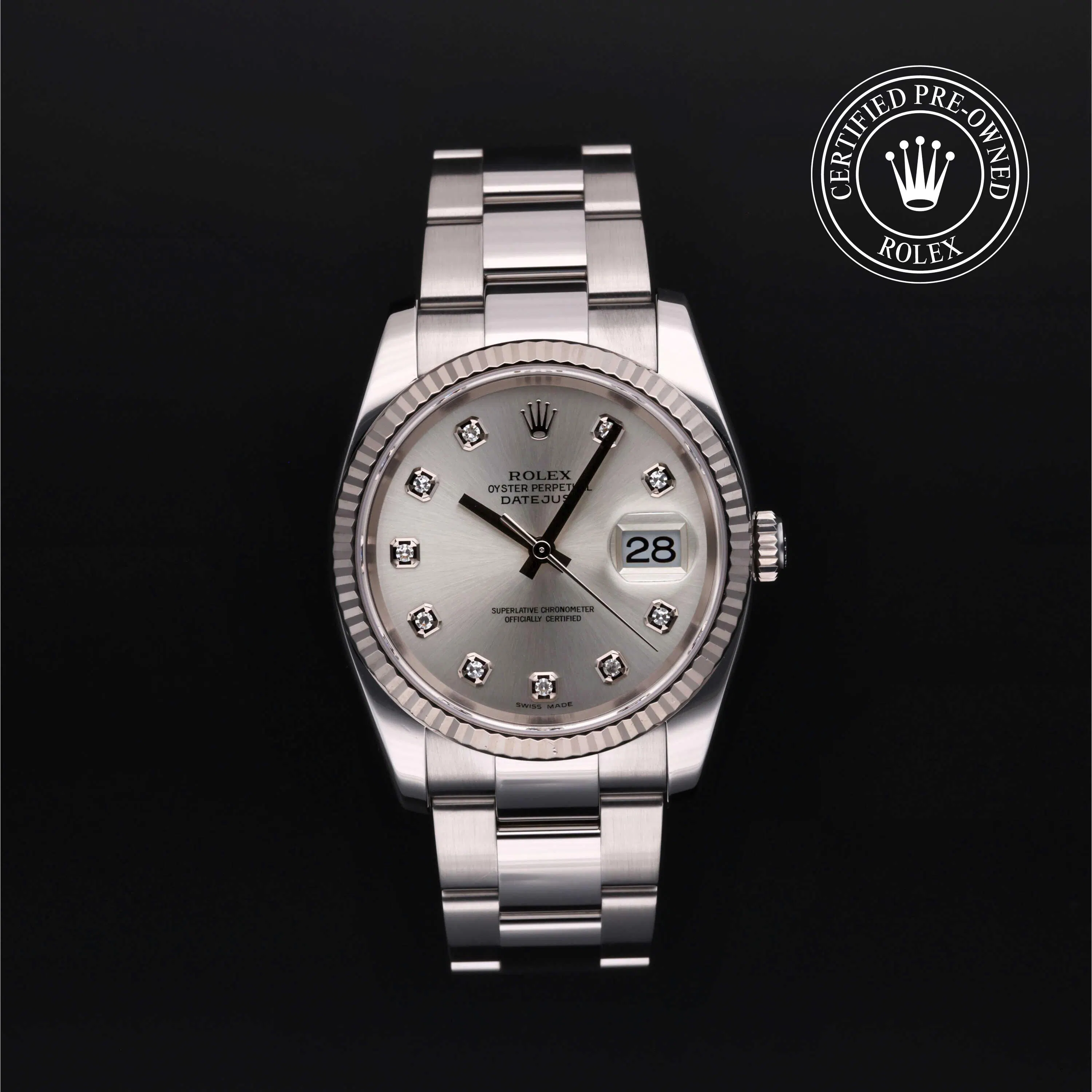 Rolex Certified Pre-Owned Datejust (116234) self - winding automatic watch, features a 36mm stainless steel case with an 18k white gold fluted bezel surrounding a silver diamond set dial on a stainless steel Oyster bracelet. Functions include hours, minutes, seconds and date. This watch has received Rolex-authorized service and certification. It comes with the original box, and includes a custom Rolex Certified Pre-Owned hang tag, travel pouch and RCPO international warranty card.
