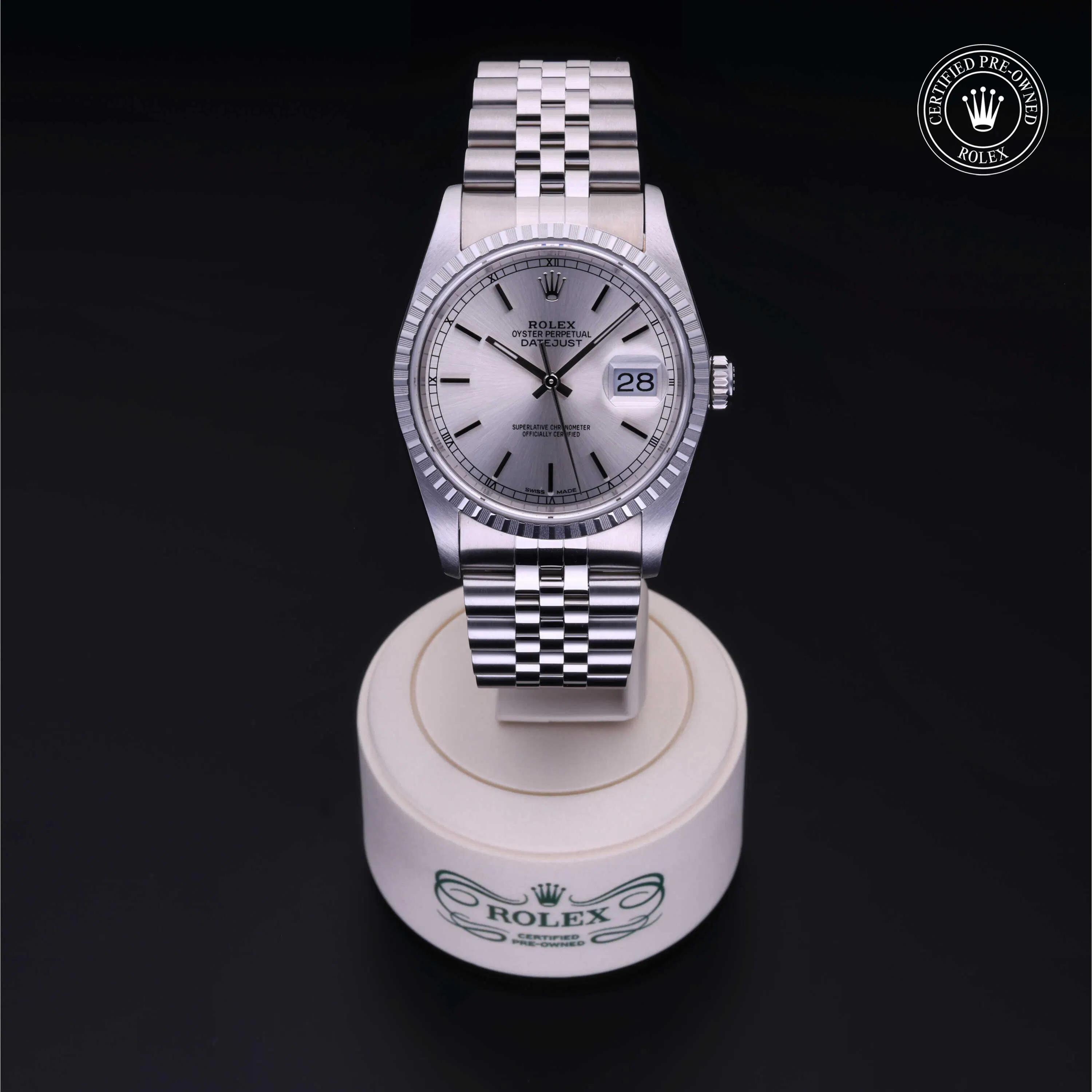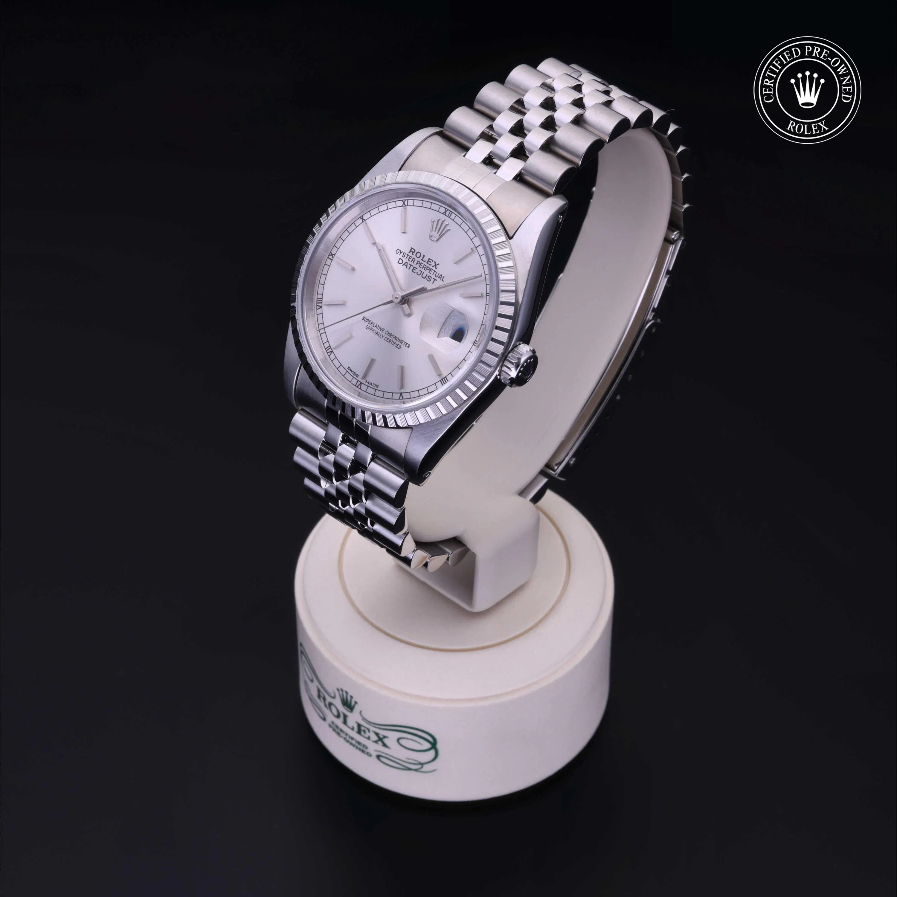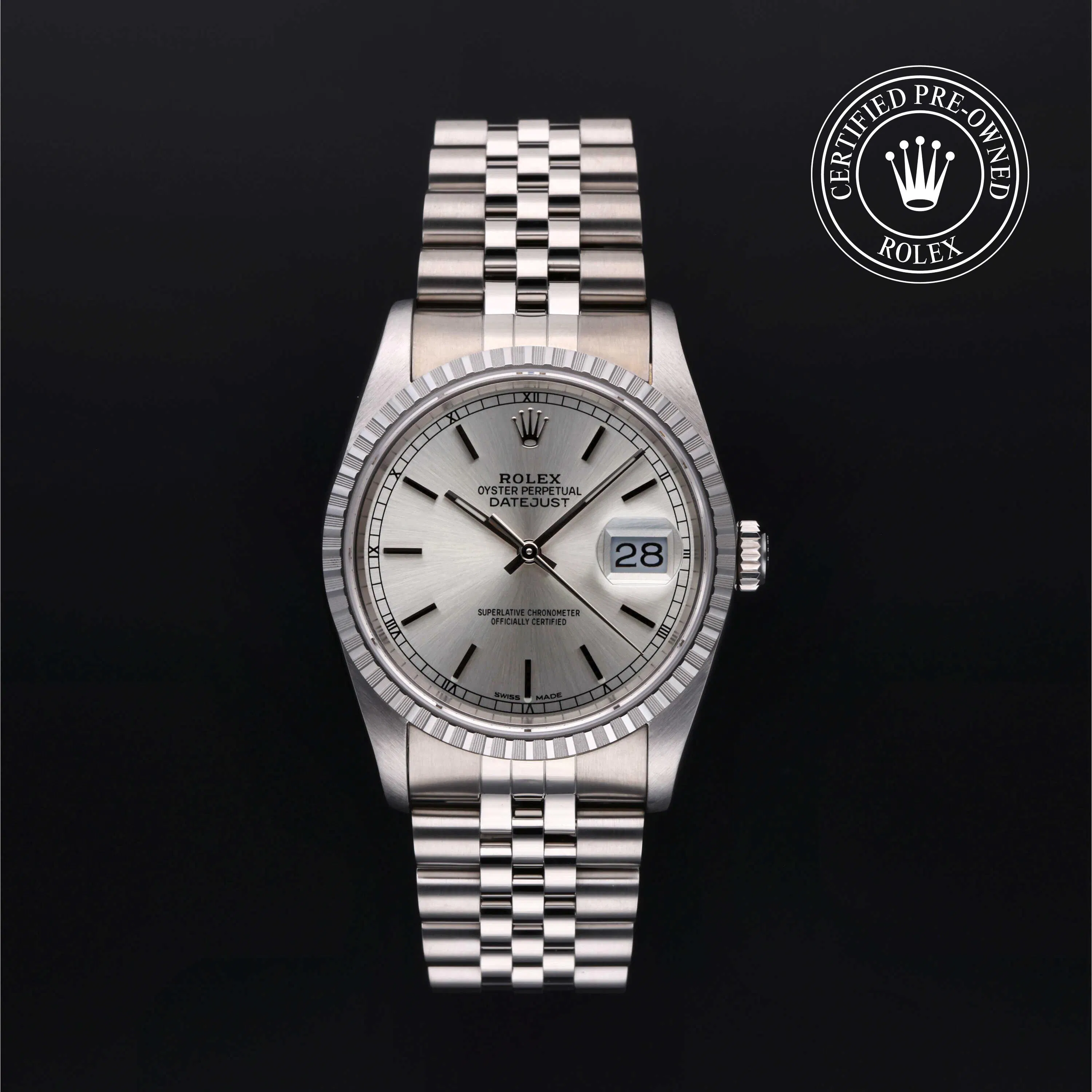 Rolex Certified Pre-Owned Datejust (16220) self - winding automatic watch, features a 36mm stainless steel case and engine-turned bezel surrounding a silver dial on a stainless steel jubilee bracelet. Functions include hours, minutes, seconds and date. This watch has received Rolex-authorized service and certification. It comes with the original box, and includes a custom Rolex Certified Pre-Owned hang tag, travel pouch and RCPO international warranty card.