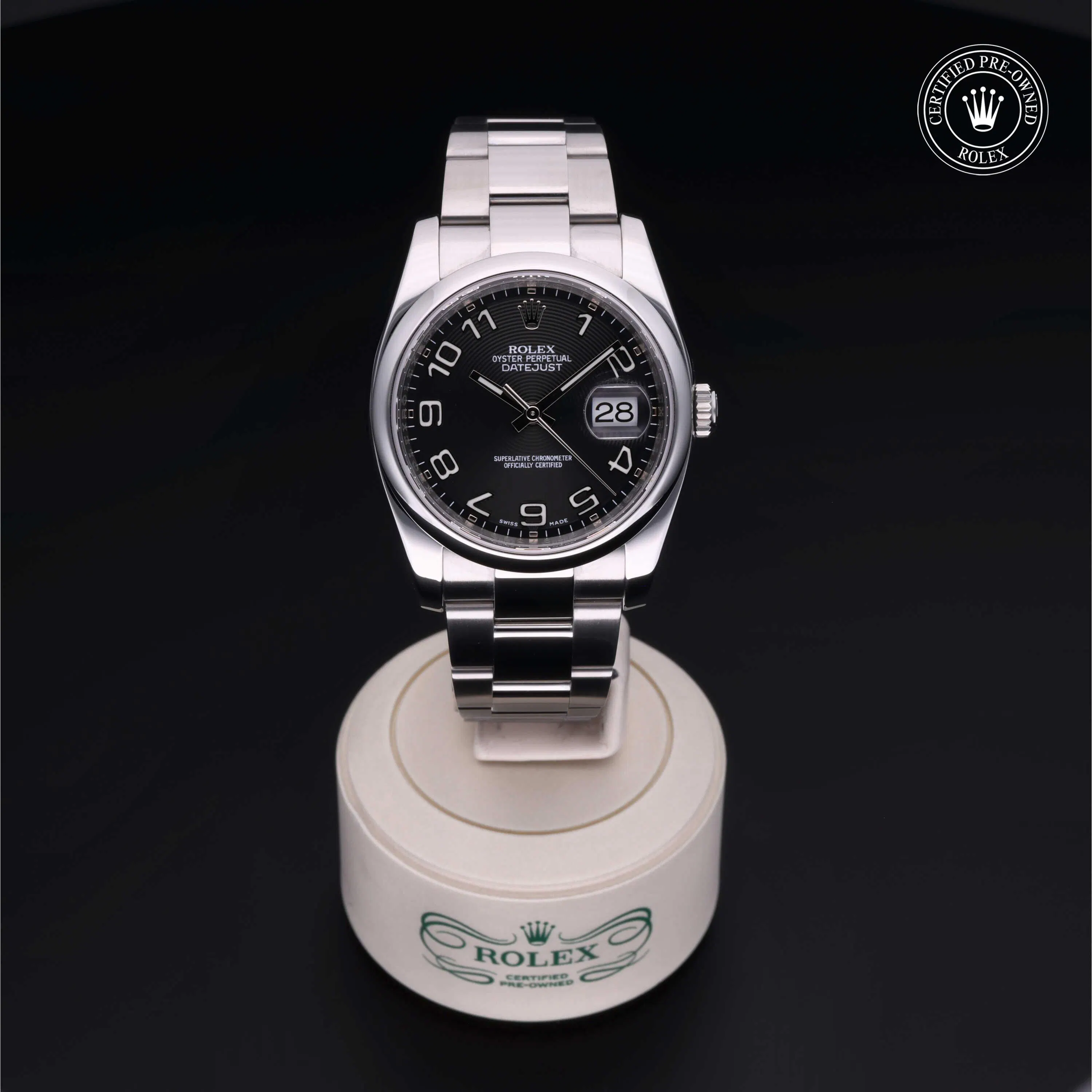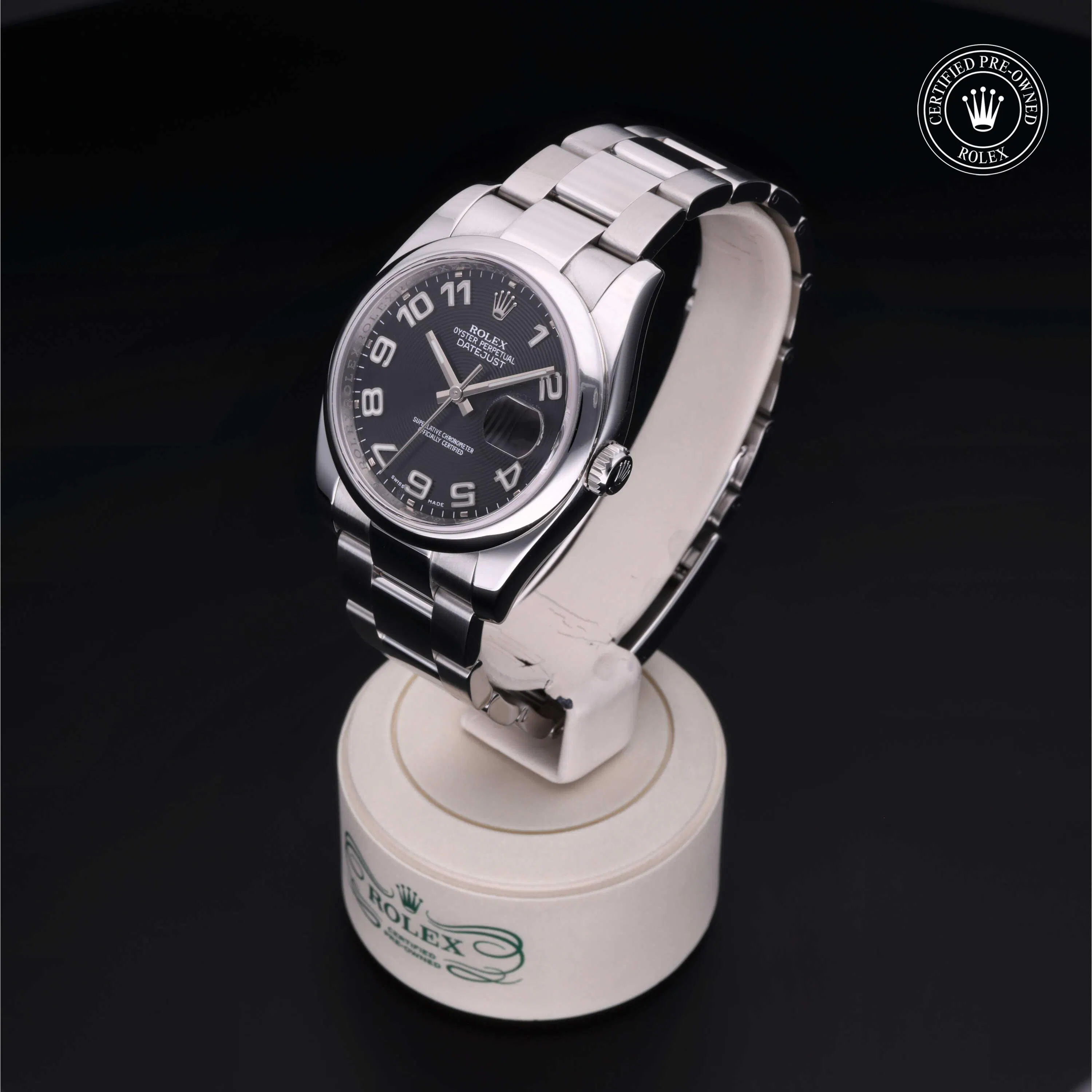 Rolex Certified Pre-Owned Datejust (116200) self - winding automatic watch, features a 36mm stainless steel case and domed bezel surrounding a black Concentric dial on a stainless steel oyster bracelet. Functions include hours, minutes, seconds and date. This watch has received Rolex-authorized service and certification. It comes with the original box, and includes a custom Rolex Certified Pre-Owned hang tag, travel pouch and RCPO international warranty card.