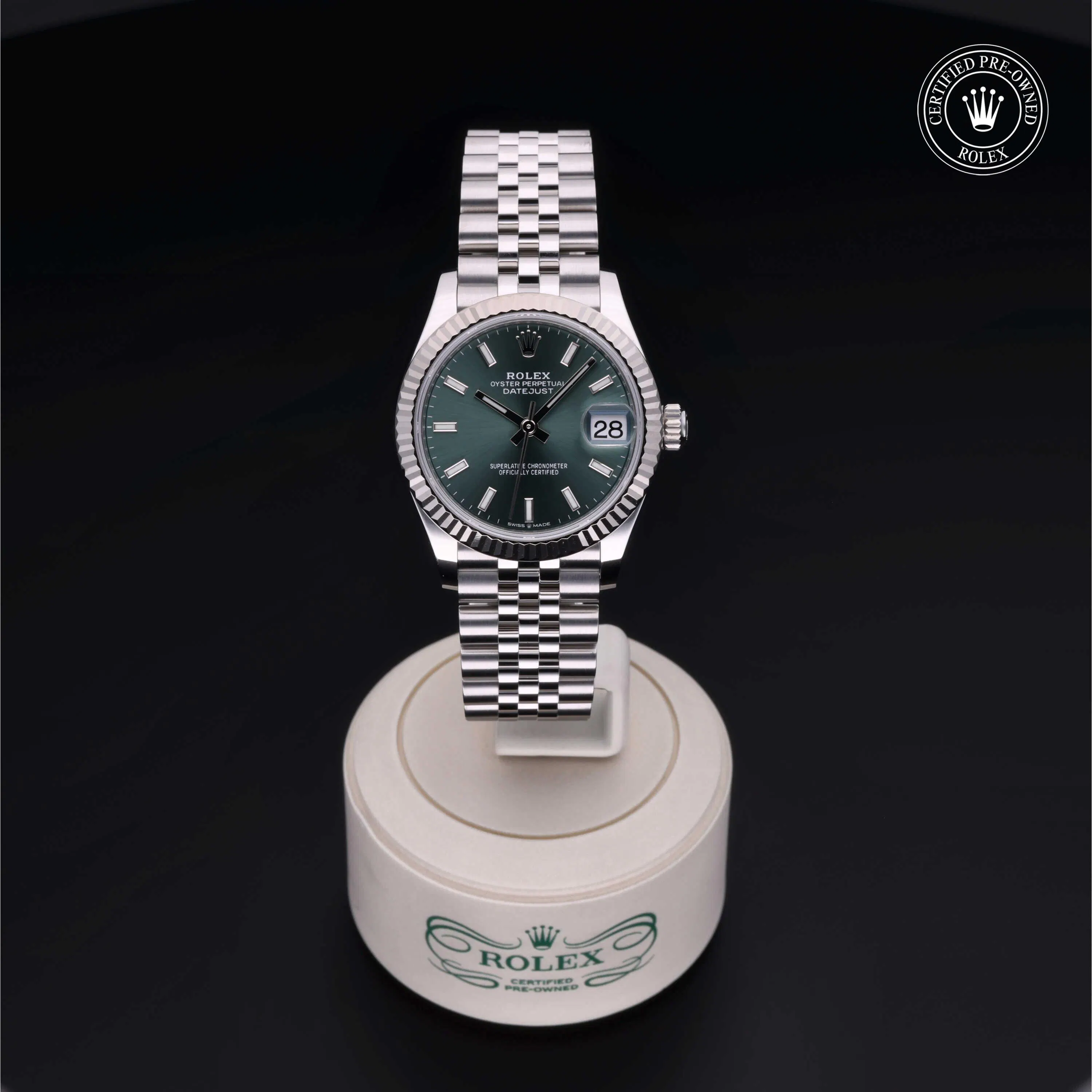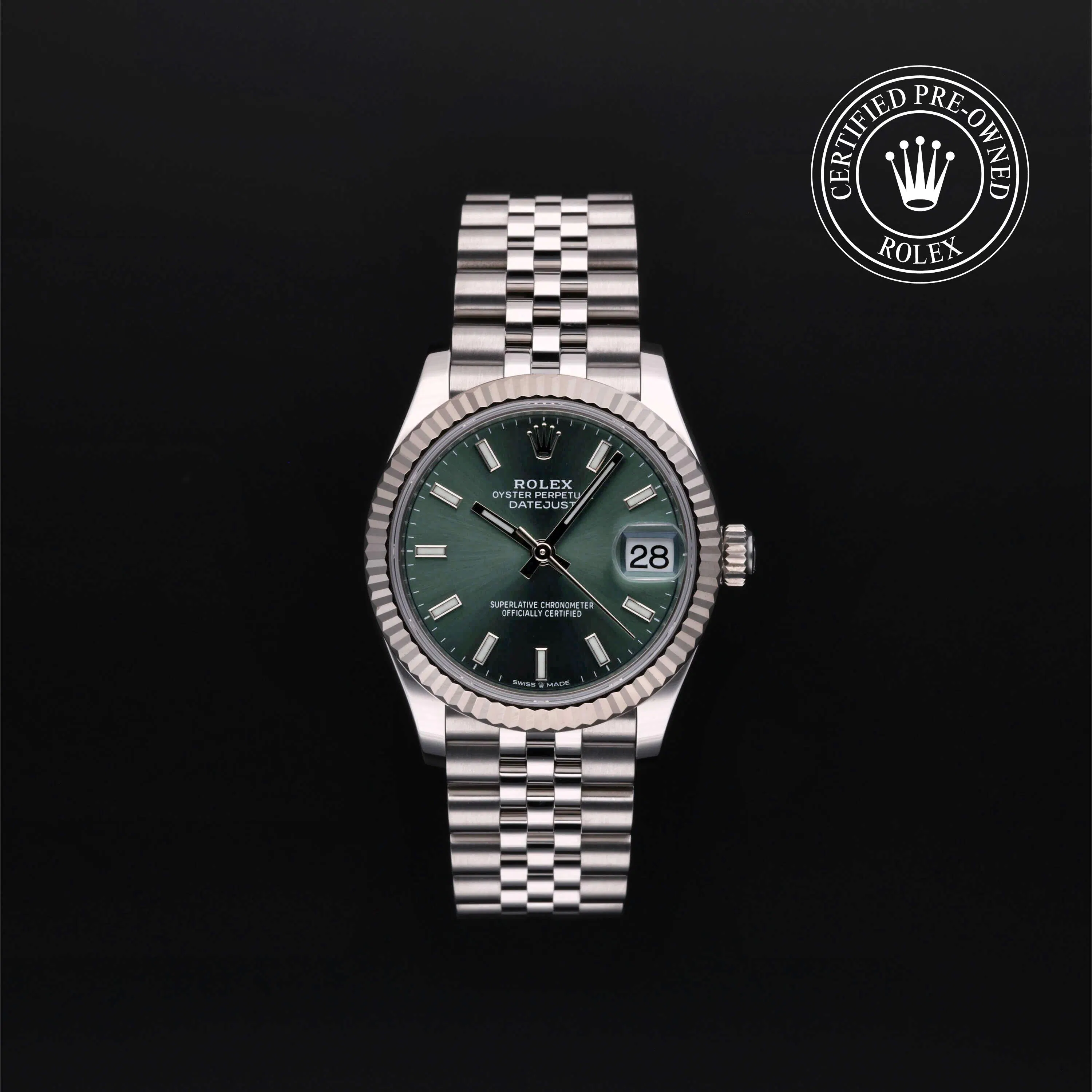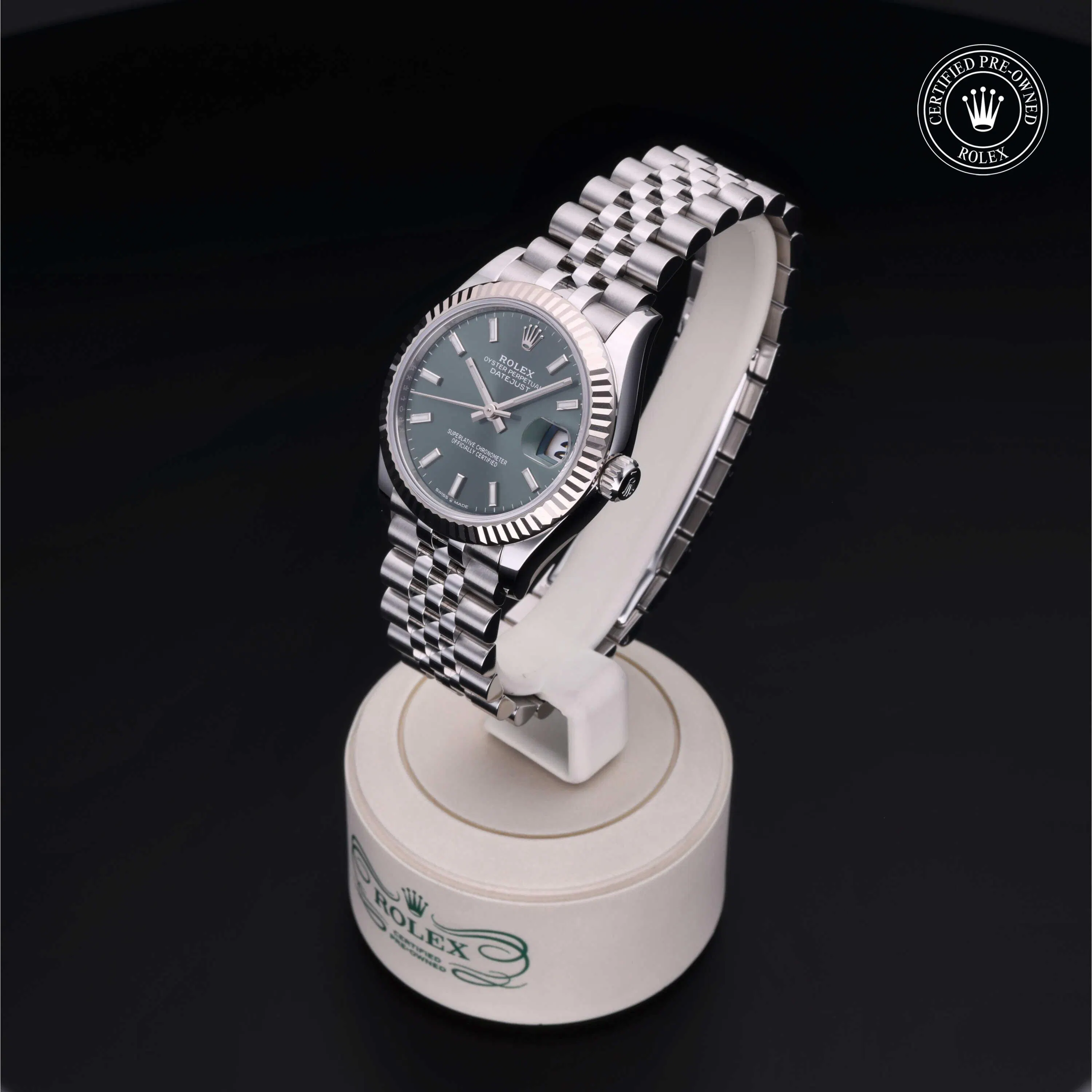 Rolex Certified Pre-Owned Datejust (278274) self - winding automatic watch, features a 31mm stainless steel case with an 18k white gold fluted bezel surrounding a Mint green dial on a stainless steel jubilee bracelet. Functions include hours, minutes, seconds and date. This watch has received Rolex-authorized service and certification. It comes with the original box and papers, and includes a custom Rolex Certified Pre-Owned hang tag, travel pouch and RCPO international warranty card.
