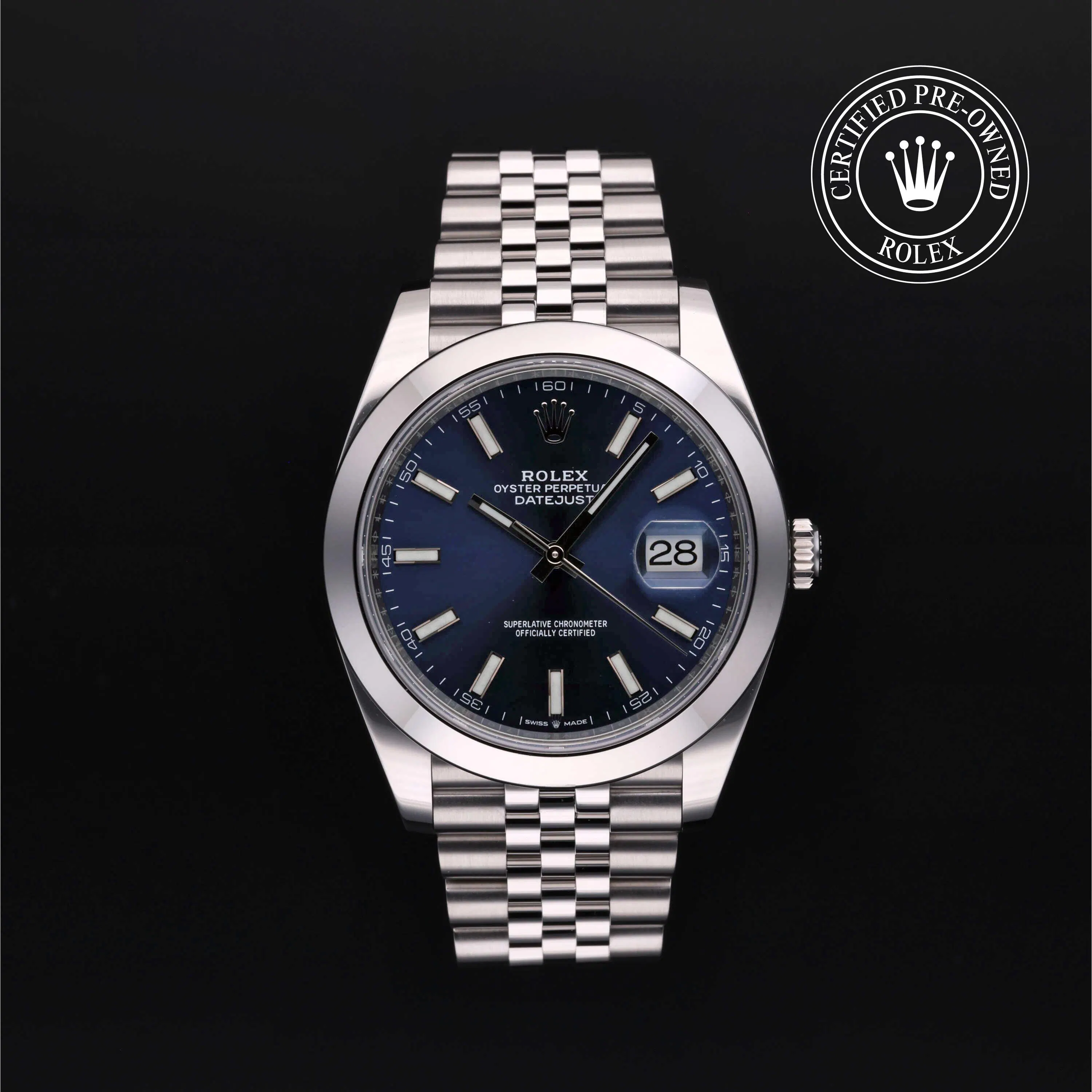 Rolex Certified Pre-Owned Datejust (126300) self - winding automatic watch, features a 41mm stainless steel case and smooth bezel surrounding a bright blue dial on a stainless steel jubilee bracelet. Functions include hours, minutes, seconds and date. This watch has received Rolex-authorized service and certification. It comes with the original box and papers, and includes a custom Rolex Certified Pre-Owned hang tag, travel pouch and RCPO international warranty card.