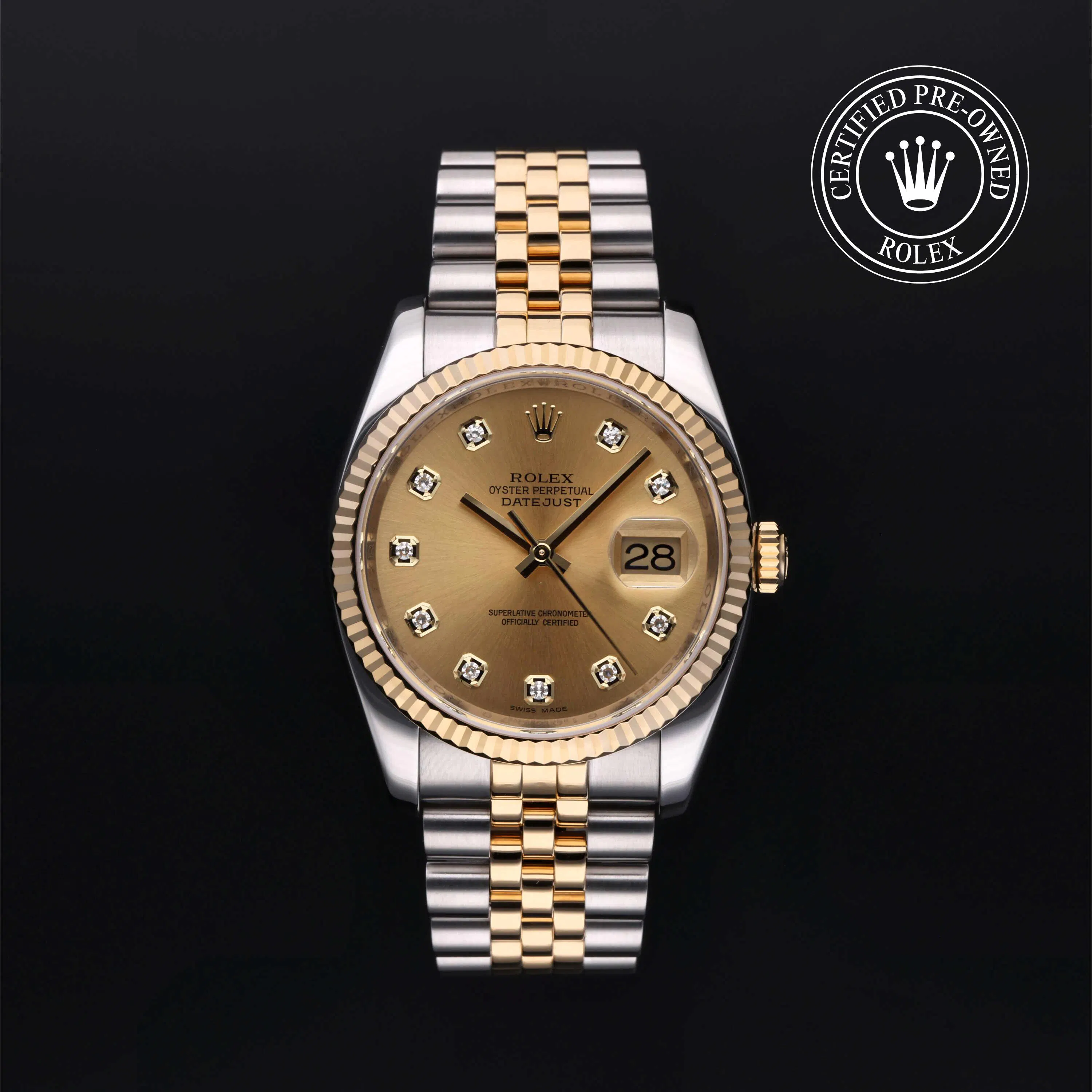 Rolex Certified Pre-Owned Datejust (116233) self - winding automatic watch, features a 36mm stainless steel case with an 18k yellow gold fluted bezel surrounding a champagne diamond set dial on a stainless steel and 18k yellow gold Jubilee bracelet. Functions include hours, minutes, seconds and date. This watch has received Rolex-authorized service and certification. It does not come with the original box or papers, but includes a custom Rolex Certified Pre-Owned hang tag, travel pouch and RCPO international warranty card.