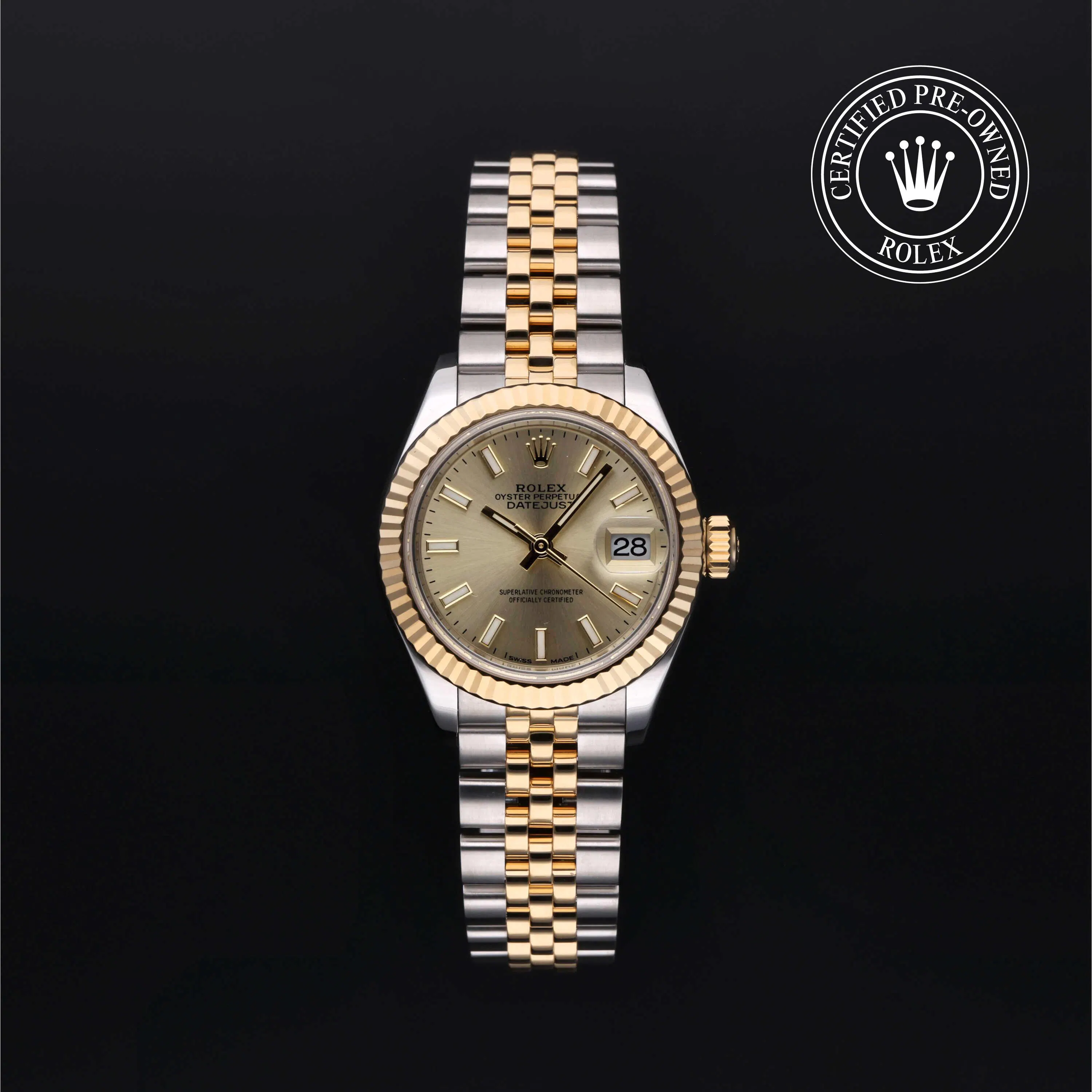 Rolex Certified Pre-Owned Datejust (279173) self - winding automatic watch, features a 28mm stainless steel case and 18k yellow gold fluted bezel surrounding a champagne index dial. The watch is secured on a stainless steel and 18k yellow gold Jubilee bracelet complete with a folding buckle. Functions include hours, minutes, seconds and date. This watch has been serviced by an authorized service center and certified by Rolex. It comes with the original papers and includes a custom Rolex Certified Pre-Owned hang tag, travel pouch and international warranty card.