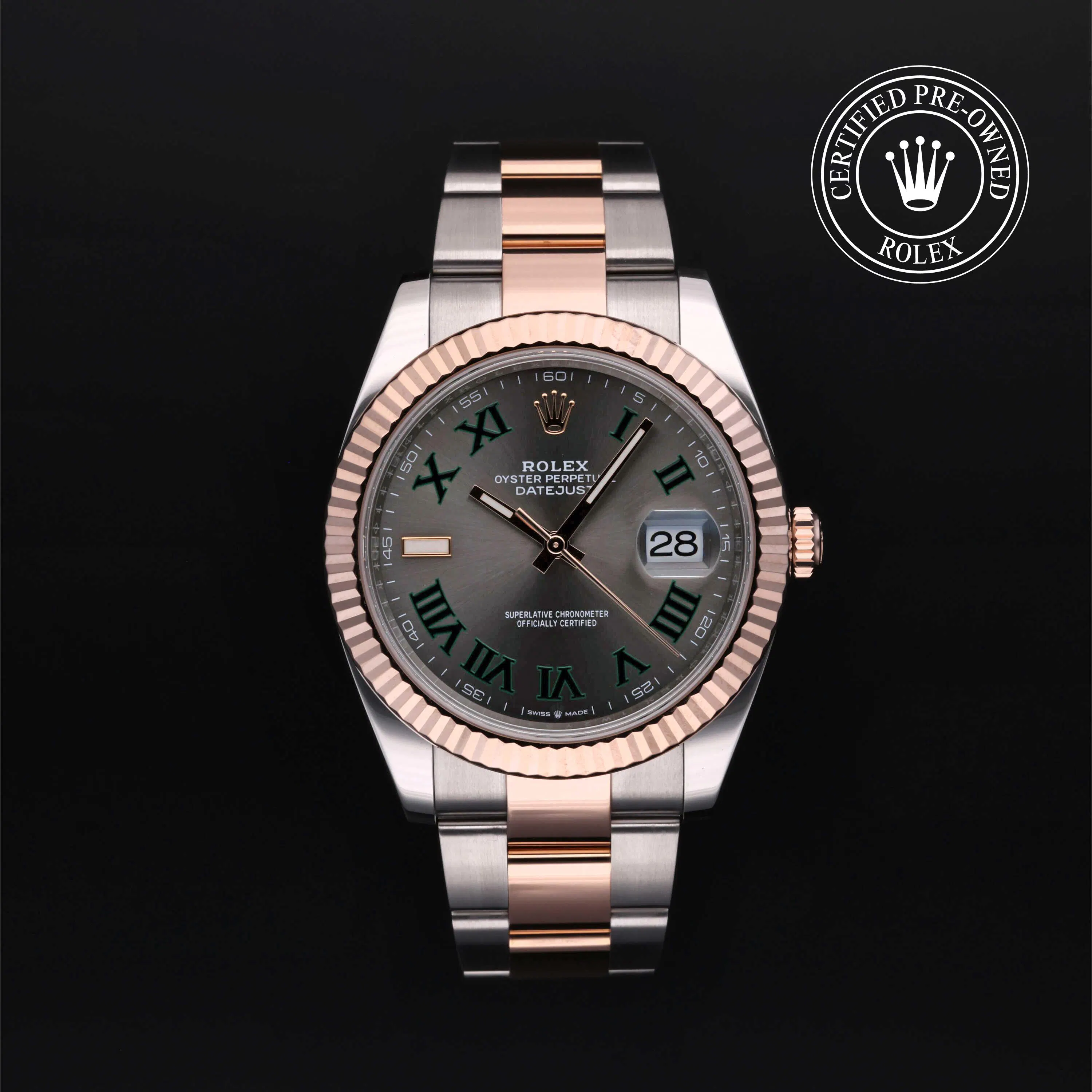 Rolex Certified Pre-Owned Datejust (126331) self - winding automatic watch, features a 41mm stainless steel case with an 18k rose gold fluted bezel surrounding a gray dial with green roman markers and a rose gold applied white index at 9 o'clock. The watch is secured on a stainless steel and 18k rose gold Oyster bracelet complete with a folding buckle. Functions include hours, minutes, seconds and date. This watch has been serviced by an authorized service center and certified by Rolex. It comes with the original papers and includes a custom Rolex Certified Pre-Owned hang tag, travel pouch and international warranty card.