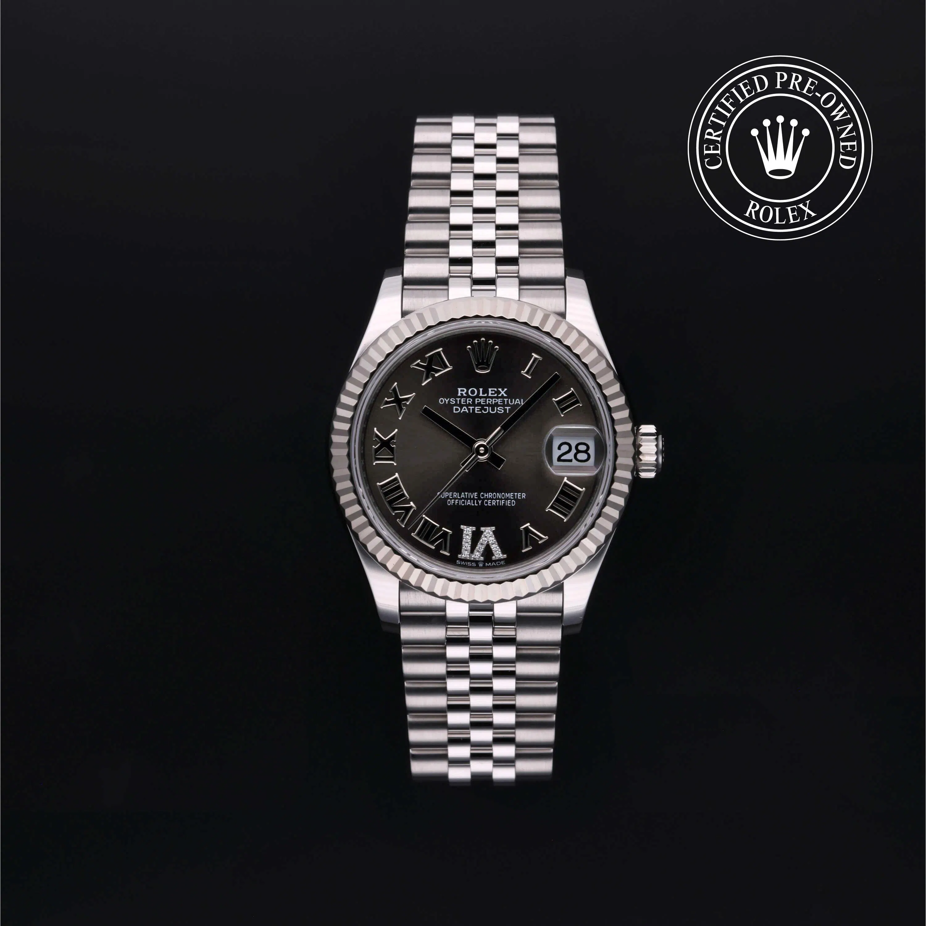 Rolex Certified Pre-Owned Datejust (278274) self - winding automatic watch, features a 31mm stainless steel case with an 18k white gold fluted bezel surrounding a dark grey diamond set dial on a stainless steel Jubilee bracelet. Functions include hours, minutes and seconds. This watch has received Rolex-authorized service and certification. It does not come with the original box or papers, but includes a custom Rolex Certified Pre-Owned hang tag, travel pouch and RCPO international warranty card.