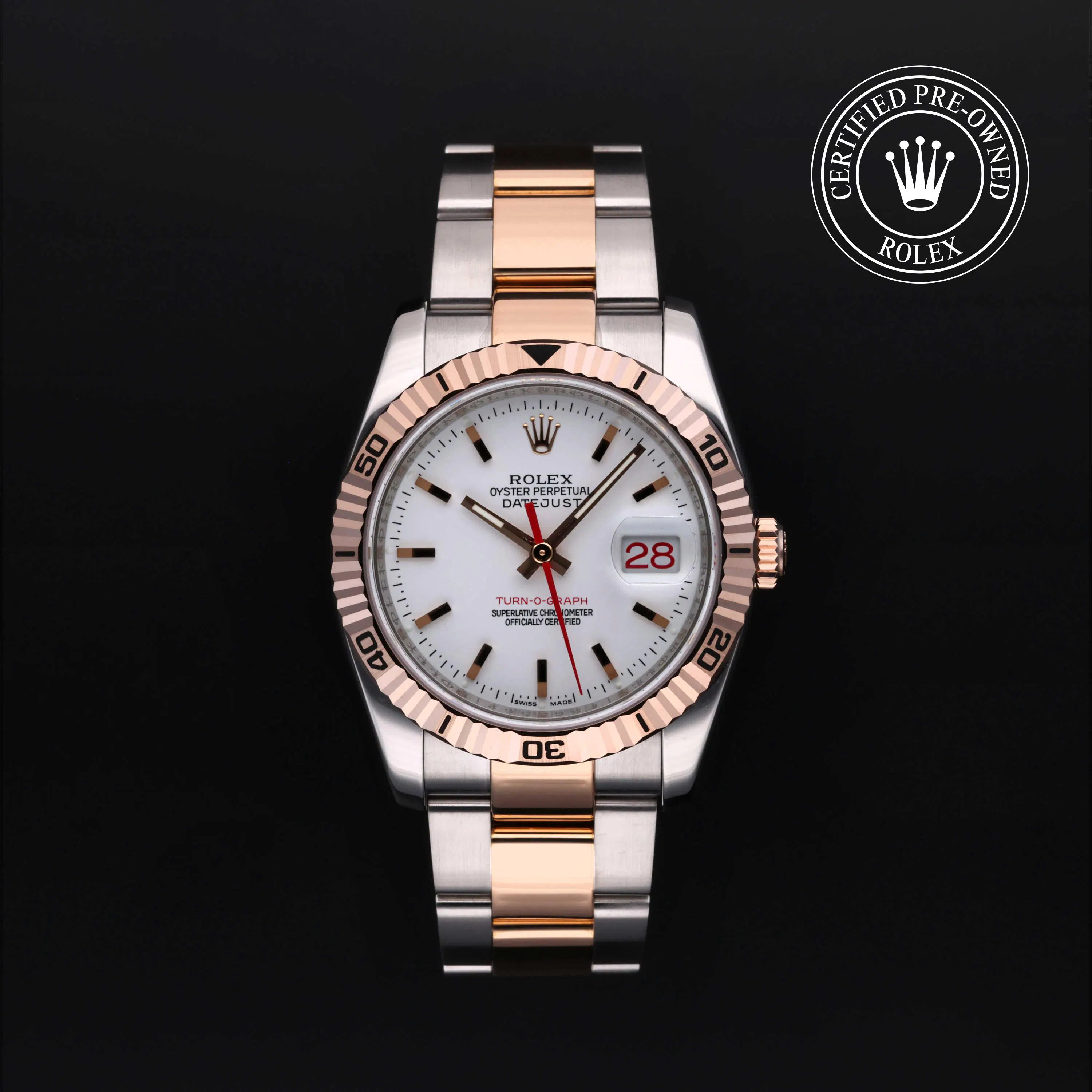 Rolex Certified Pre-Owned Datejust Turn-O-Graph (116261) self - winding automatic watch, features a 36mm stainless case with an 18k rose gold, fluted Turn-O-Graph bezel surrounding a white dial on a stainless steel and 18k rose gold Oyster bracelet. Functions include hours, minutes, seconds and date. This watch has received Rolex-authorized service and certification. It comes with the original papers, and includes a custom Rolex Certified Pre-Owned hang tag, travel pouch and RCPO international warranty card.