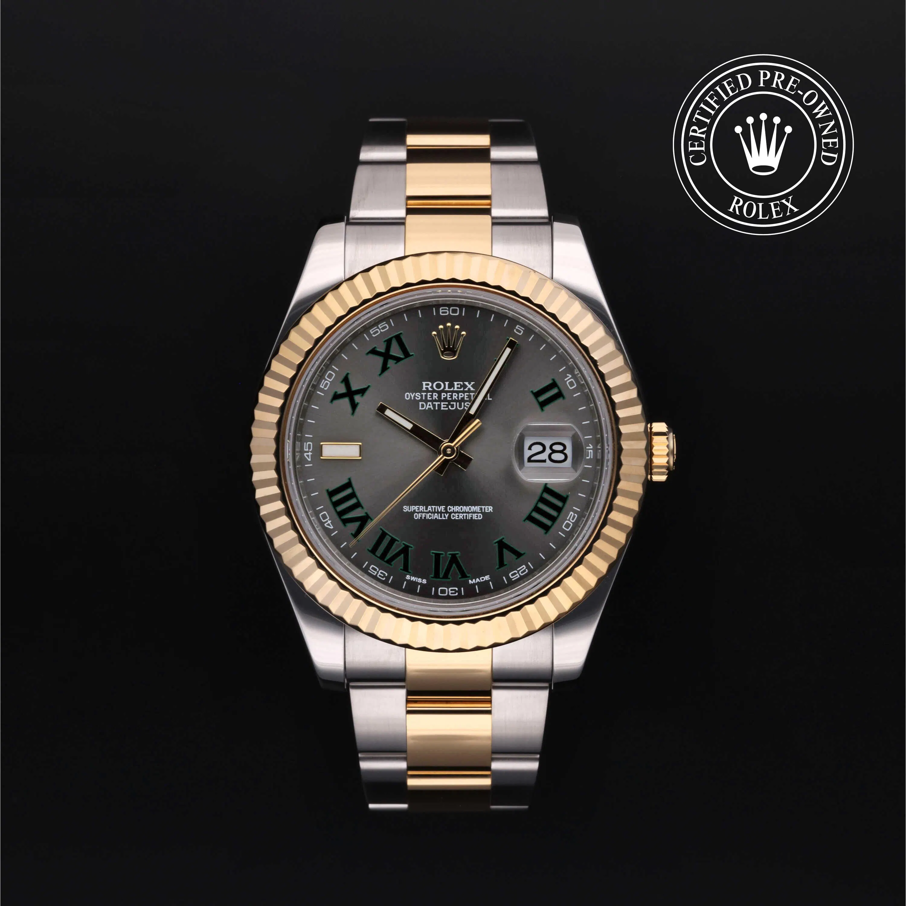 Rolex Certified Pre-Owned Datejust II (116333) self - winding automatic watch, features a 41mm stainless steel case with an 18k yellow gold fluted bezel surrounding a slate dial on a stainless steel and 18k yellow gold Oyster bracelet. Functions include hours, minutes, seconds and date. This watch has received Rolex-authorized service and certification. It comes with the original box and papers, and includes a custom Rolex Certified Pre-Owned hang tag, travel pouch and RCPO international warranty card.