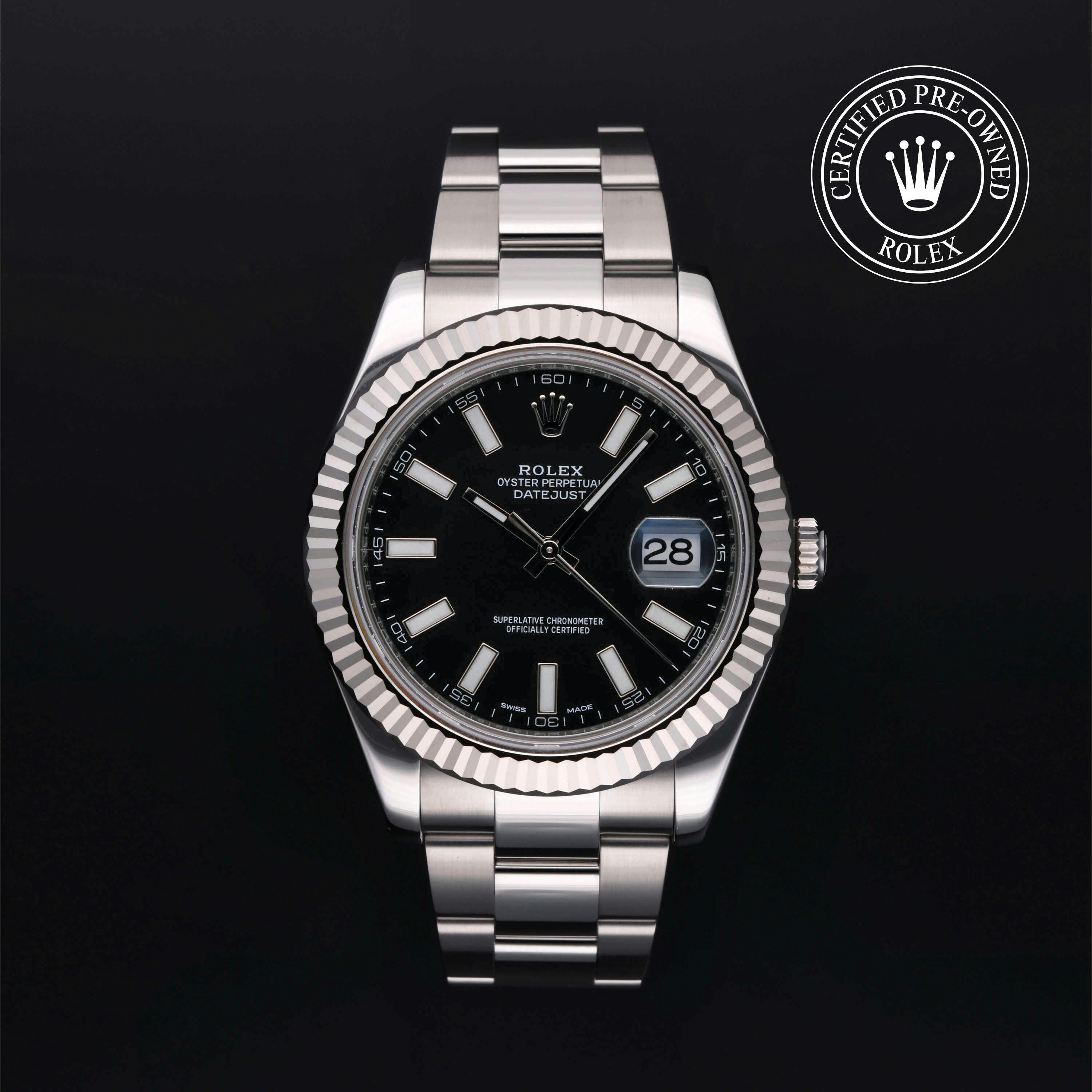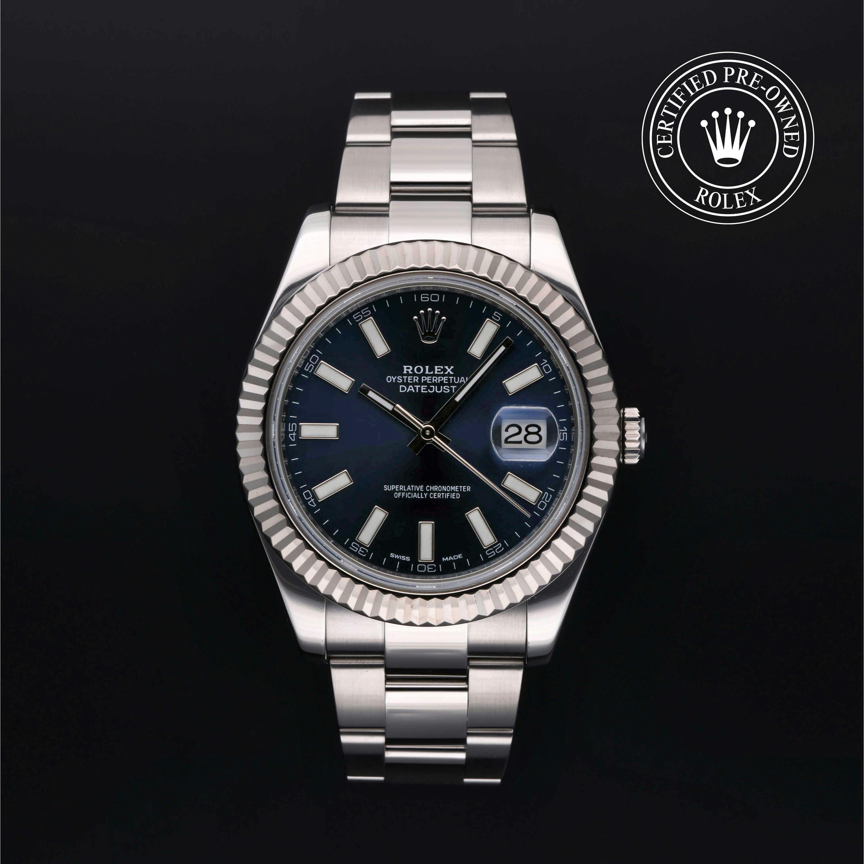 The Oyster Perpetual Datejust 41 reference 126334 measures 41mm and features an Oystersteel case with an 18k white gold fluted bezel. Some models include mother-of-pearl dials with diamond hour markers, while others showcase more minimal sunburst finishes. All are highly desirable in any pre-owned Rolex Datejust 41 collection.