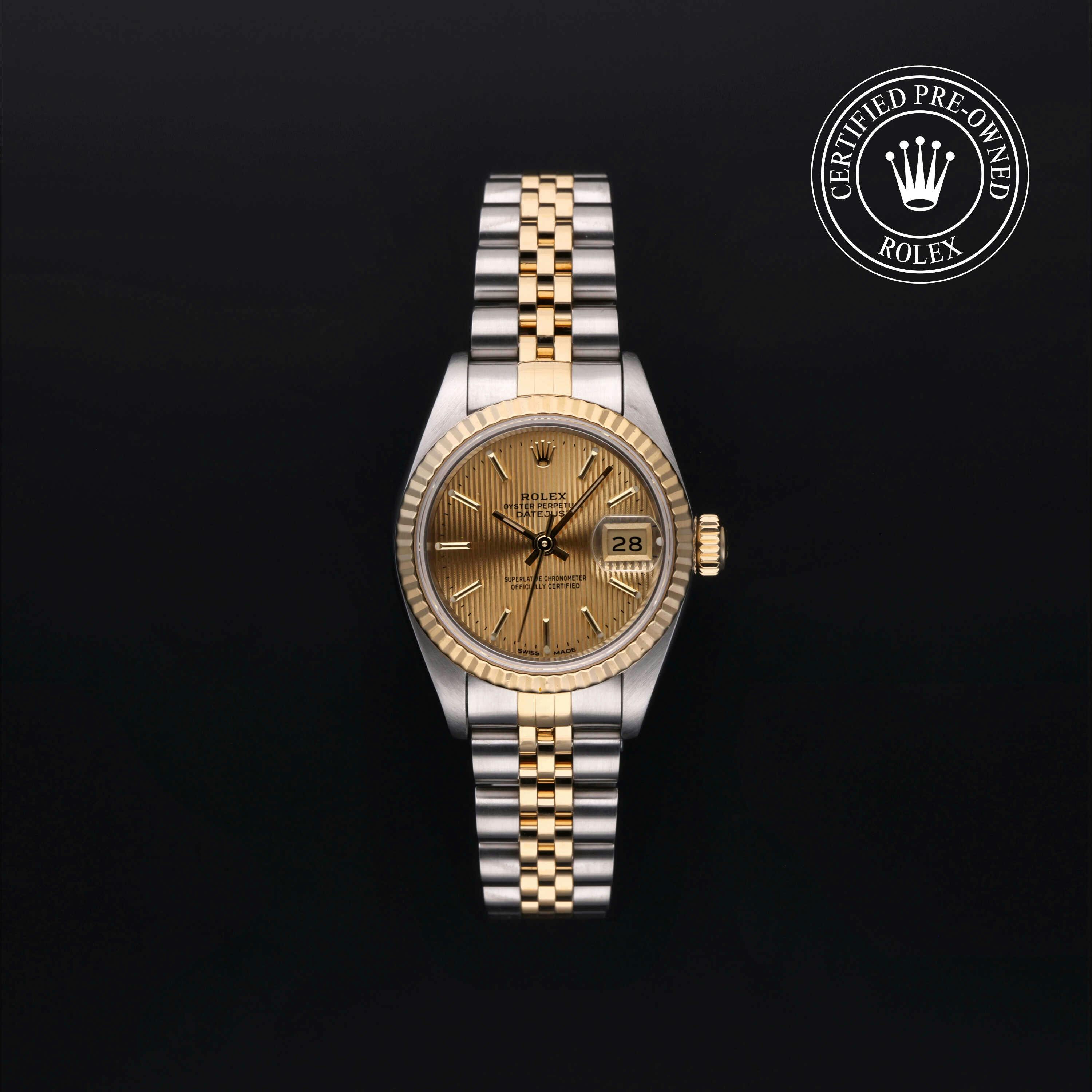 The Rolesor (two-tone) stainless steel and yellow gold Datejust reference 16203 features a sapphire crystal, smooth yellow gold bezel, and Oyster bracelet. This reference remains a cornerstone in the pre-owned Rolex Datejust collection.