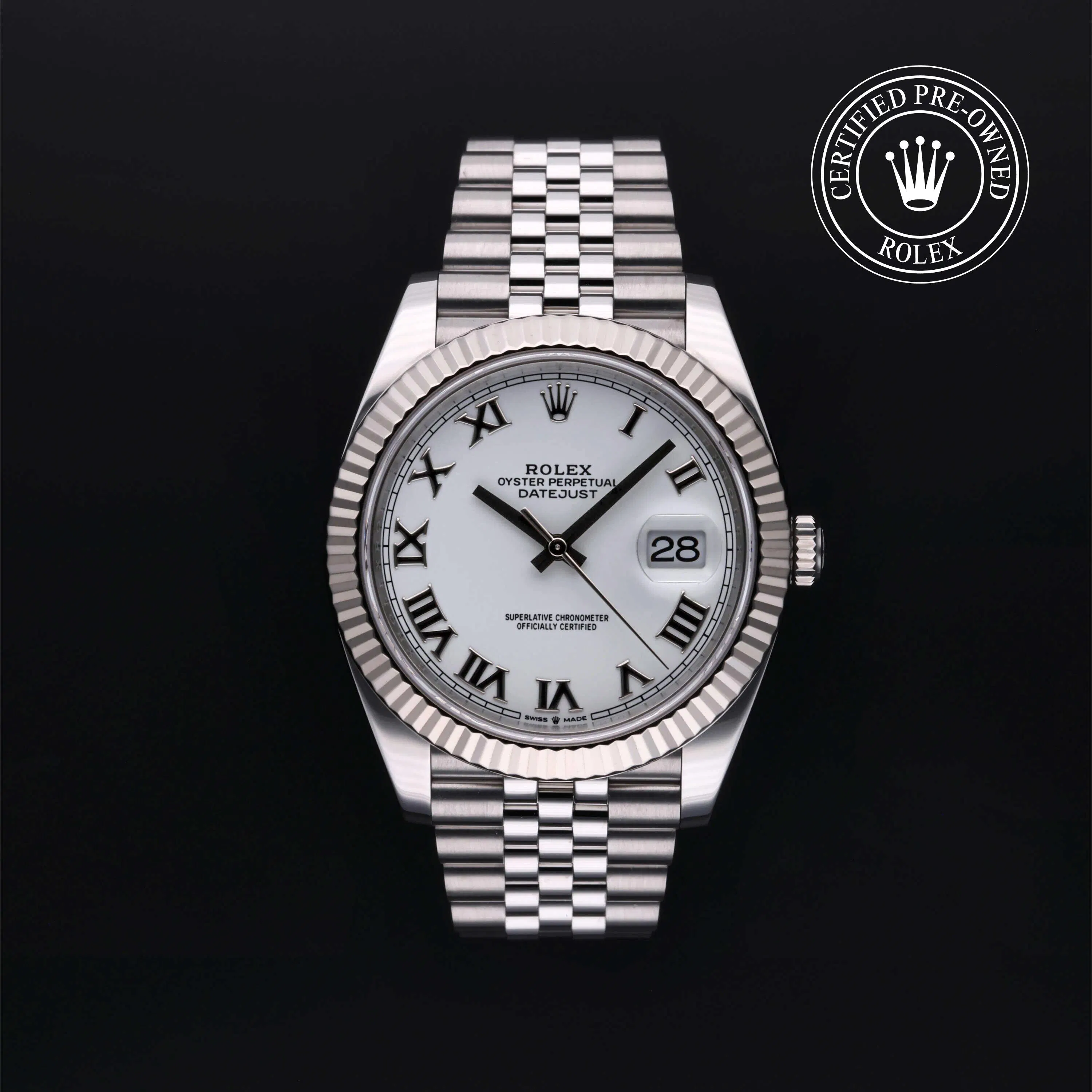 The Oyster Perpetual Datejust 41 reference 126334 measures 41mm and features an Oystersteel case with an 18k white gold fluted bezel. Some models include mother-of-pearl dials with diamond hour markers, while others showcase more minimal sunburst finishes. All are highly desirable in any pre-owned Rolex Datejust 41 collection.