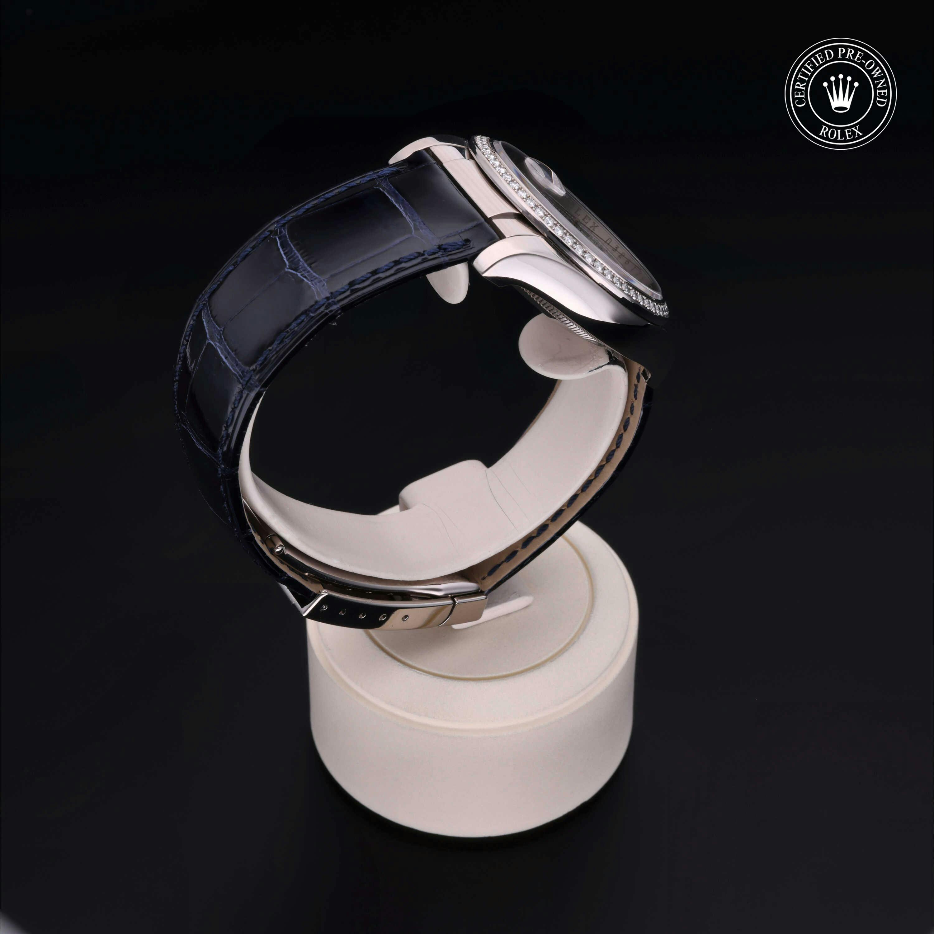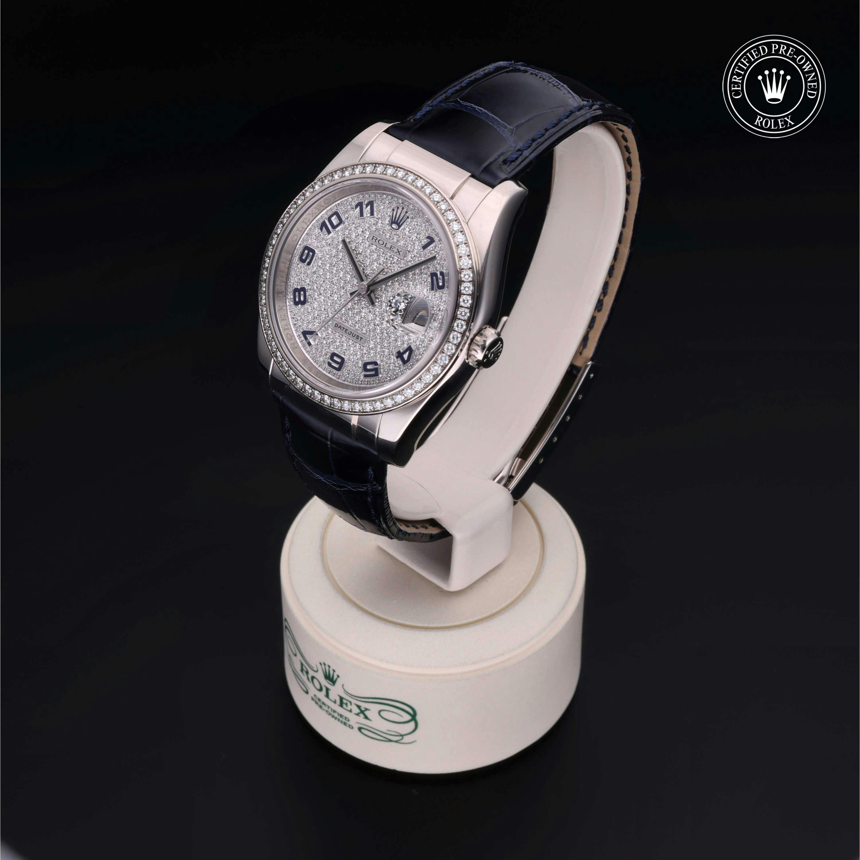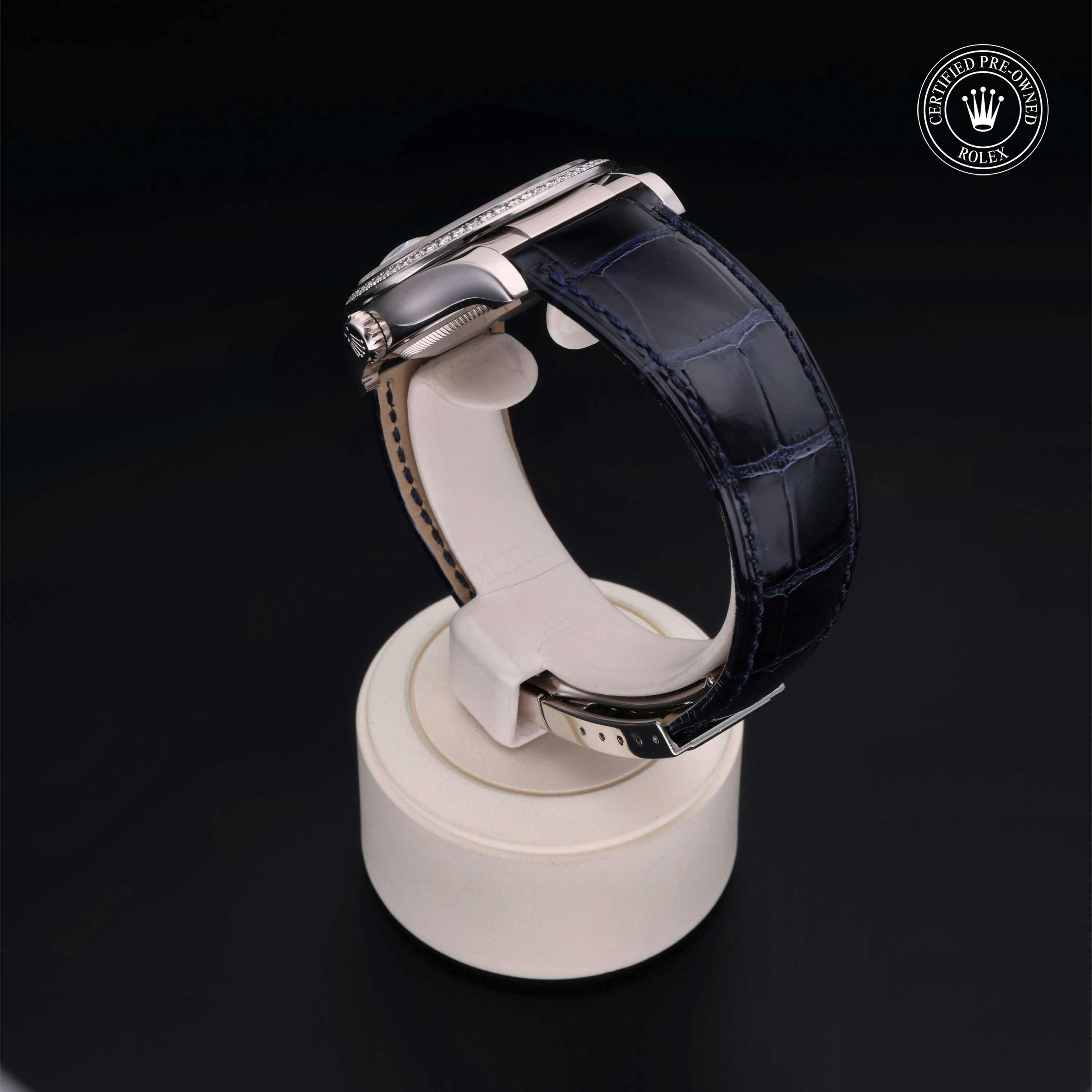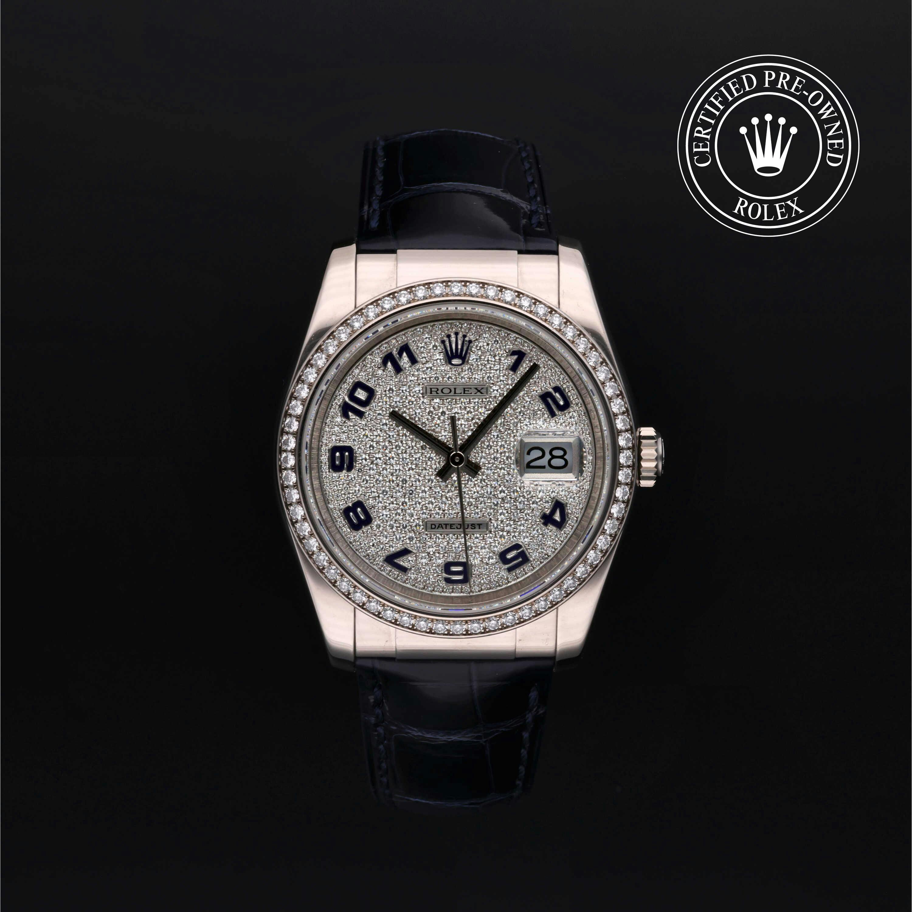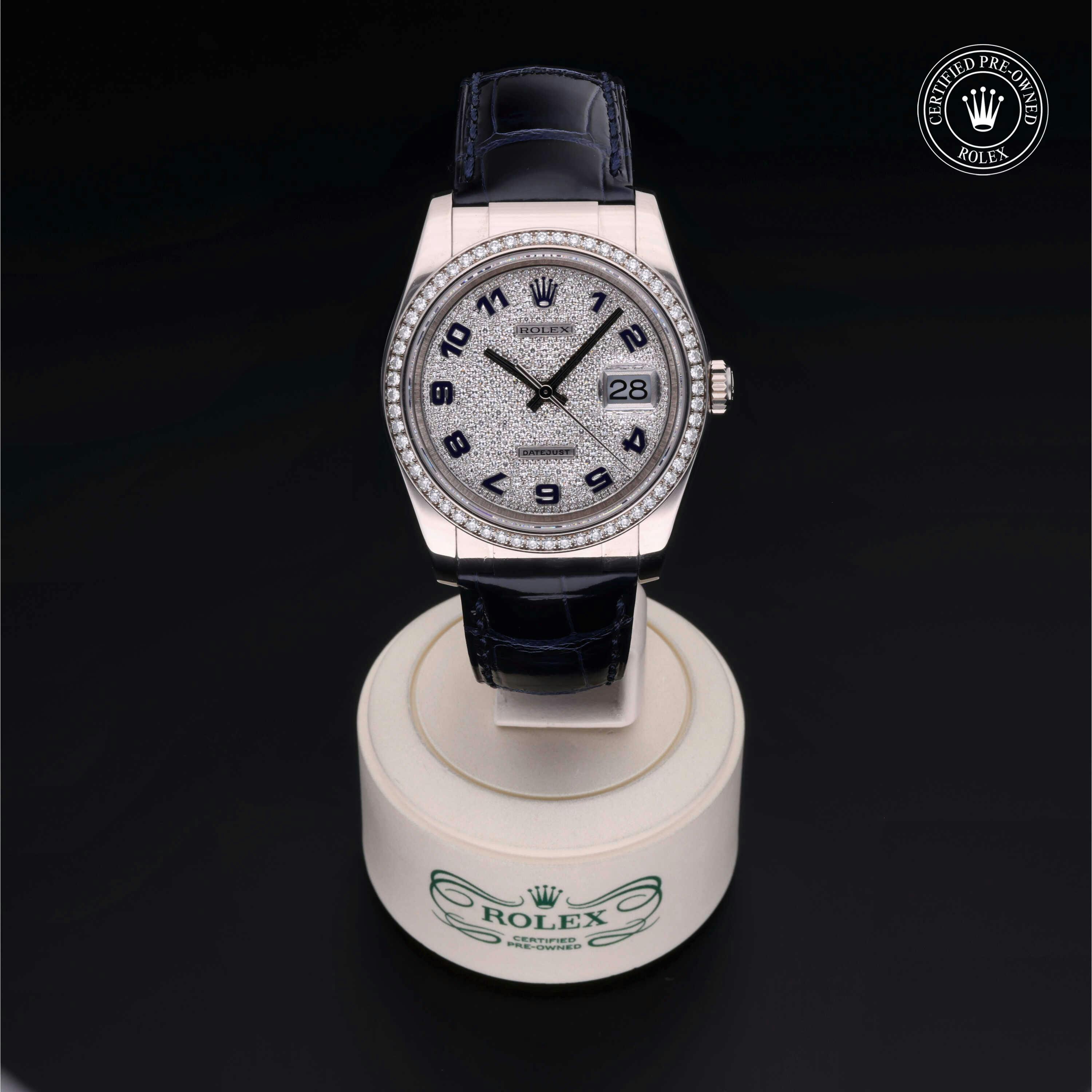 Rolex Certified Pre-Owned Datejust (116189) self - winding automatic watch, features a 36mm 18k white gold case with a diamond set bezel surrounding a pave diamond set dial with blue enamel on a blue alligator strap with an 18k white gold deployant buckle. Functions include hours, minutes, seconds and date. This watch has received Rolex-authorized service and certification. It comes with the original box, and includes a custom Rolex Certified Pre-Owned hang tag, travel pouch and RCPO international warranty card.