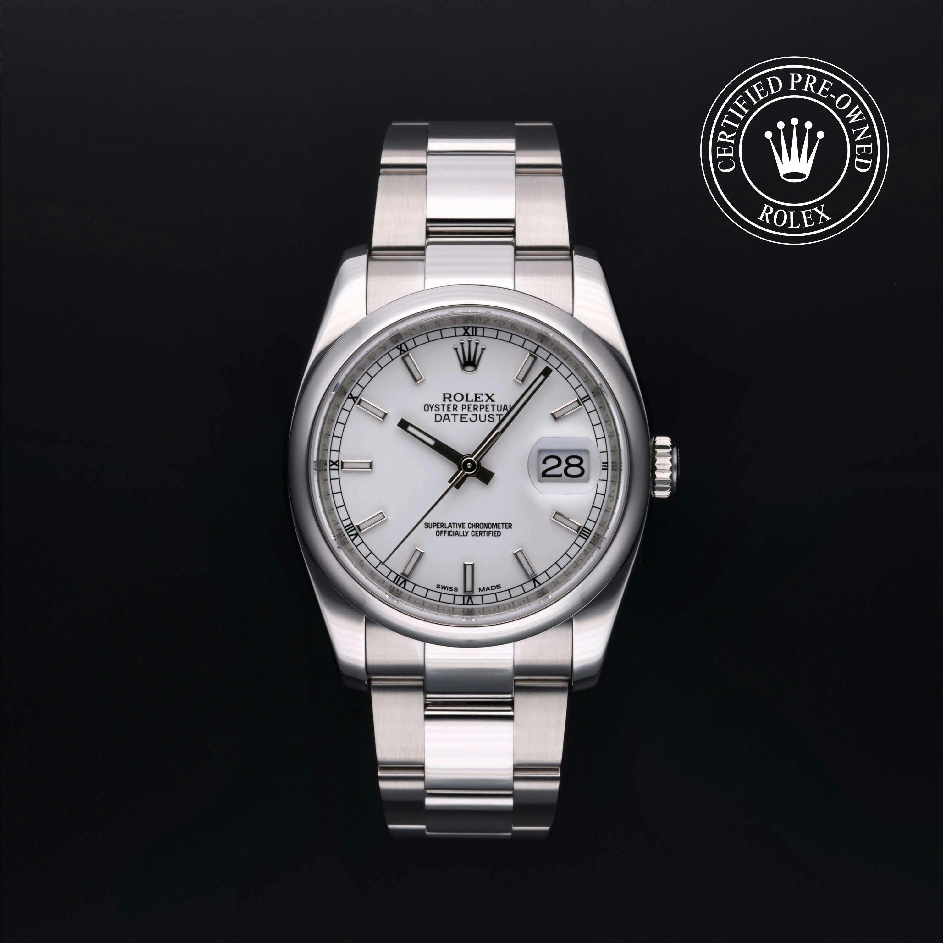 Pre-Owned Rolex Datejust (116200) self - winding automatic watch, features a 36mm stainless steel case surrounding a white dial on a strap. Functions include hours, minutes, seconds This watch has been serviced and comes with papers. Time remaining on the Manufacturer's service warranty! This watch will be ready to ship in 5-7 days!