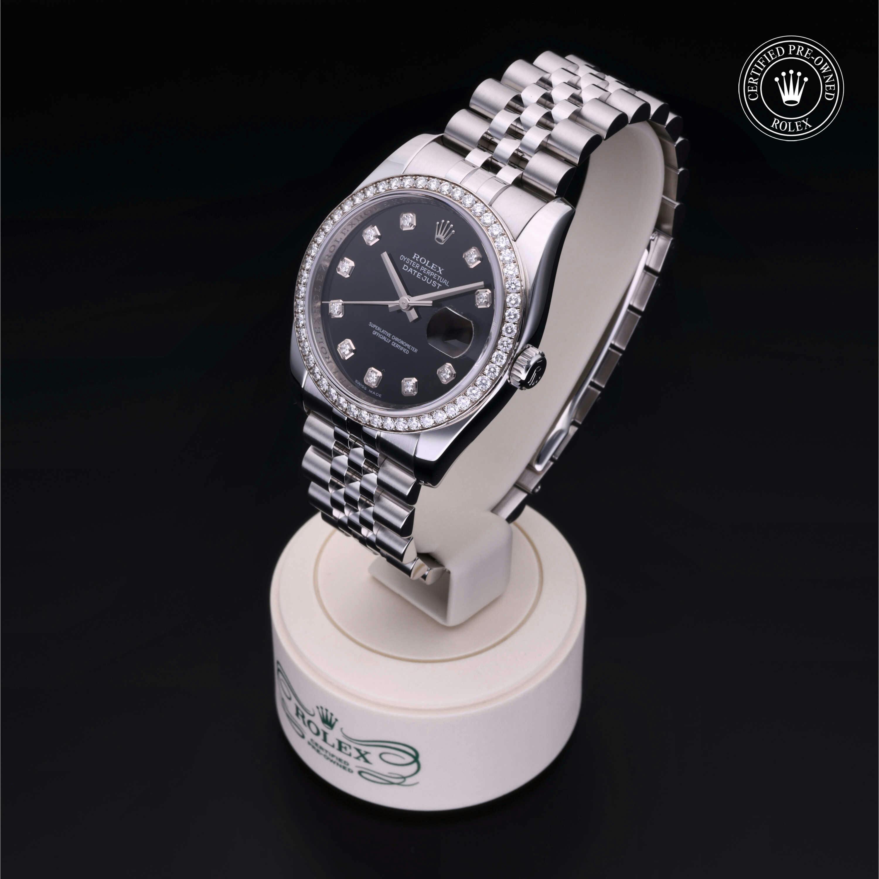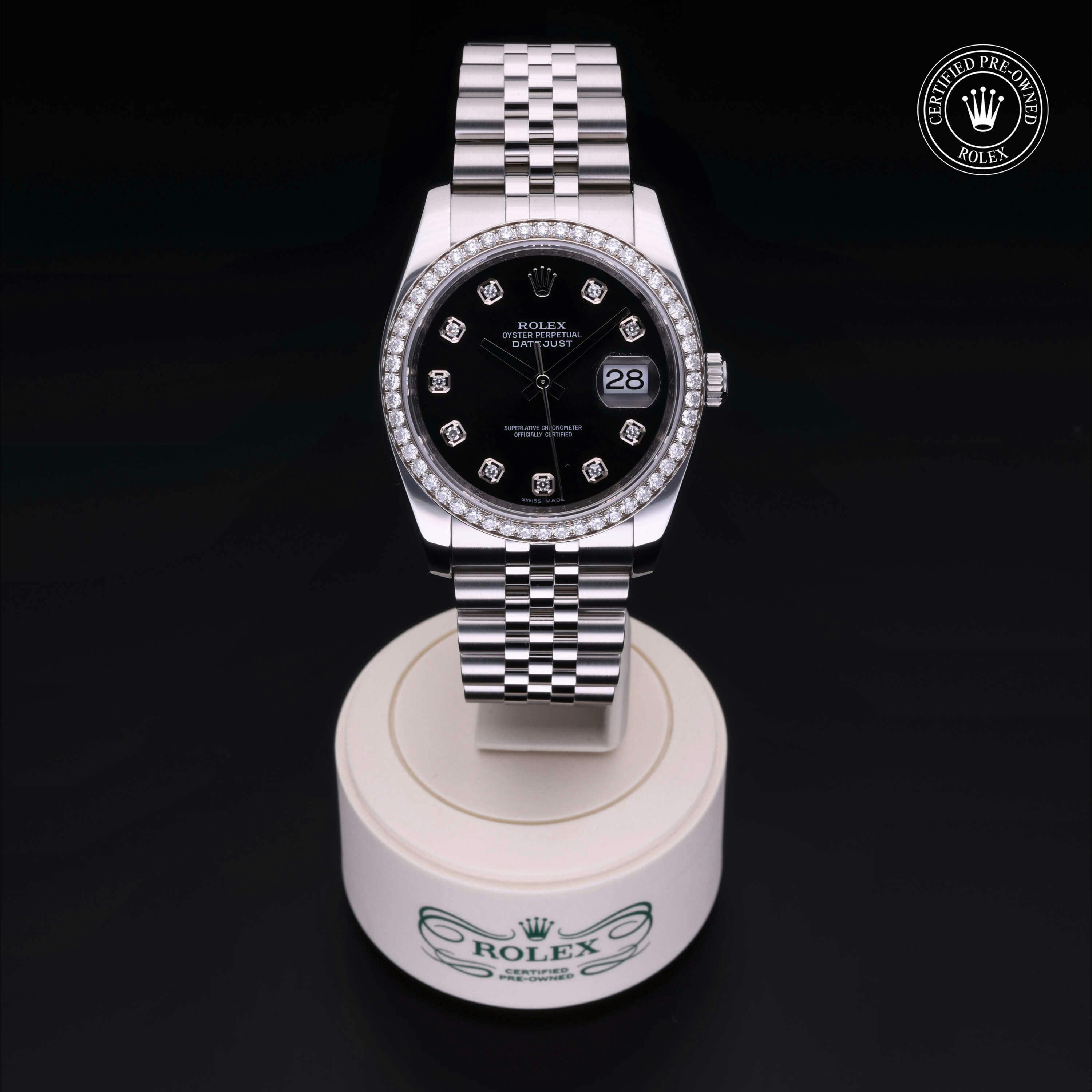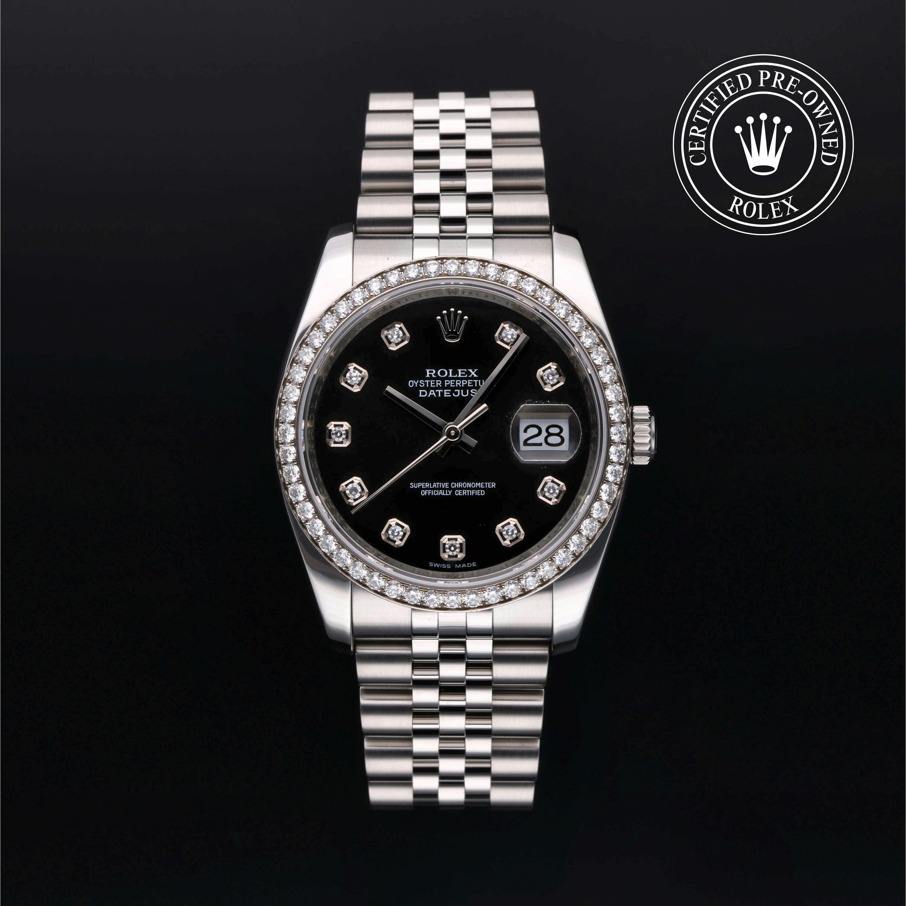 Pre-Owned Rolex Datejust (116244) self - winding automatic watch, features a 36mm stainless steel case surrounding a black dial on a strap. Functions include hours, minutes, seconds, date This watch has been serviced and does not come with box or papers. Time remaining on the Manufacturer's service warranty!