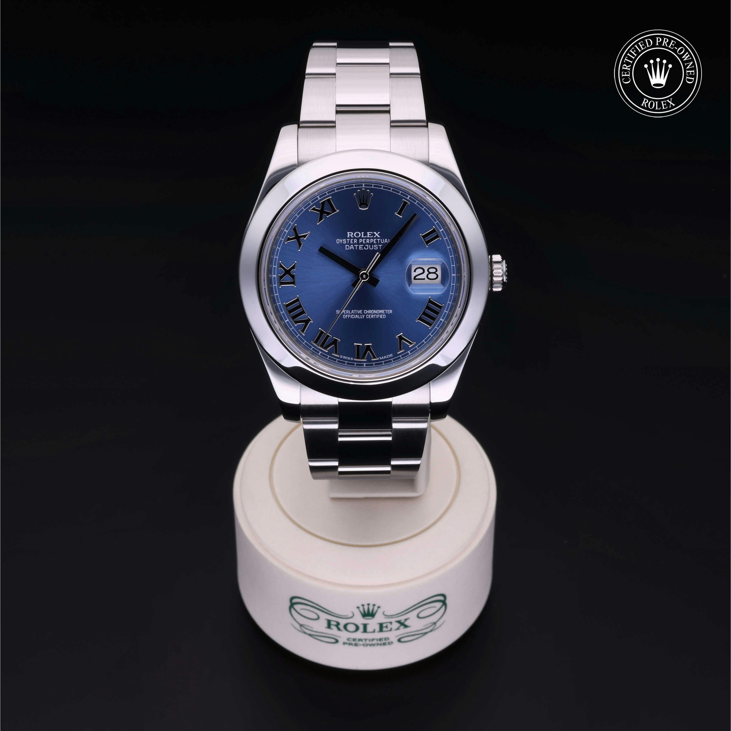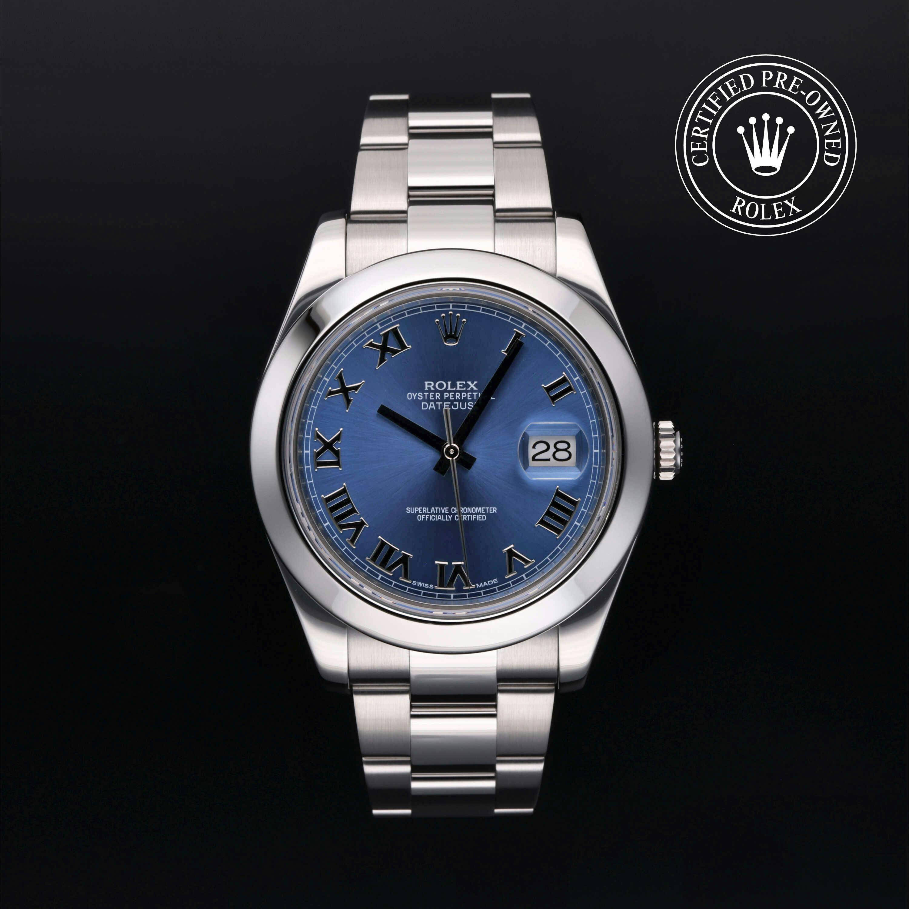 Rolex Certified Pre-Owned Datejust II (116300) self - winding automatic watch, features a 41mm stainless steel case and smooth bezel surrounding an Azzurro blue dial on a stainless steel oyster bracelet. Functions include hours, minutes, seconds and date. This watch has received Rolex-authorized service and certification. It does not come with the original box or papers, but includes a custom Rolex Certified Pre-Owned hang tag, travel pouch and RCPO international warranty card.