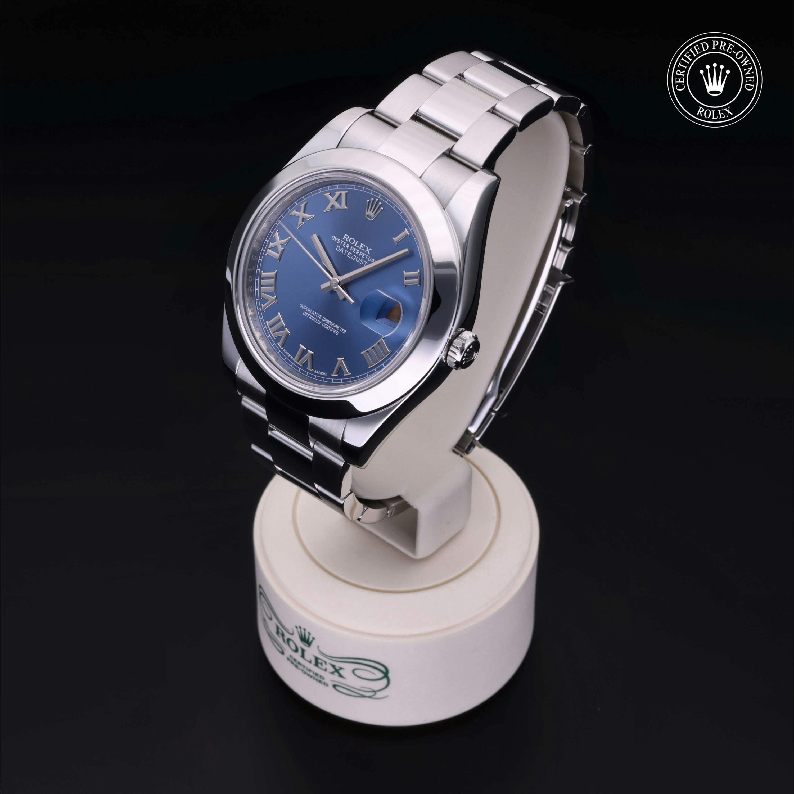 Rolex Certified Pre-Owned Datejust II (116300) self - winding automatic watch, features a 41mm stainless steel case and smooth bezel surrounding an Azzurro blue dial on a stainless steel oyster bracelet. Functions include hours, minutes, seconds and date. This watch has received Rolex-authorized service and certification. It does not come with the original box or papers, but includes a custom Rolex Certified Pre-Owned hang tag, travel pouch and RCPO international warranty card.