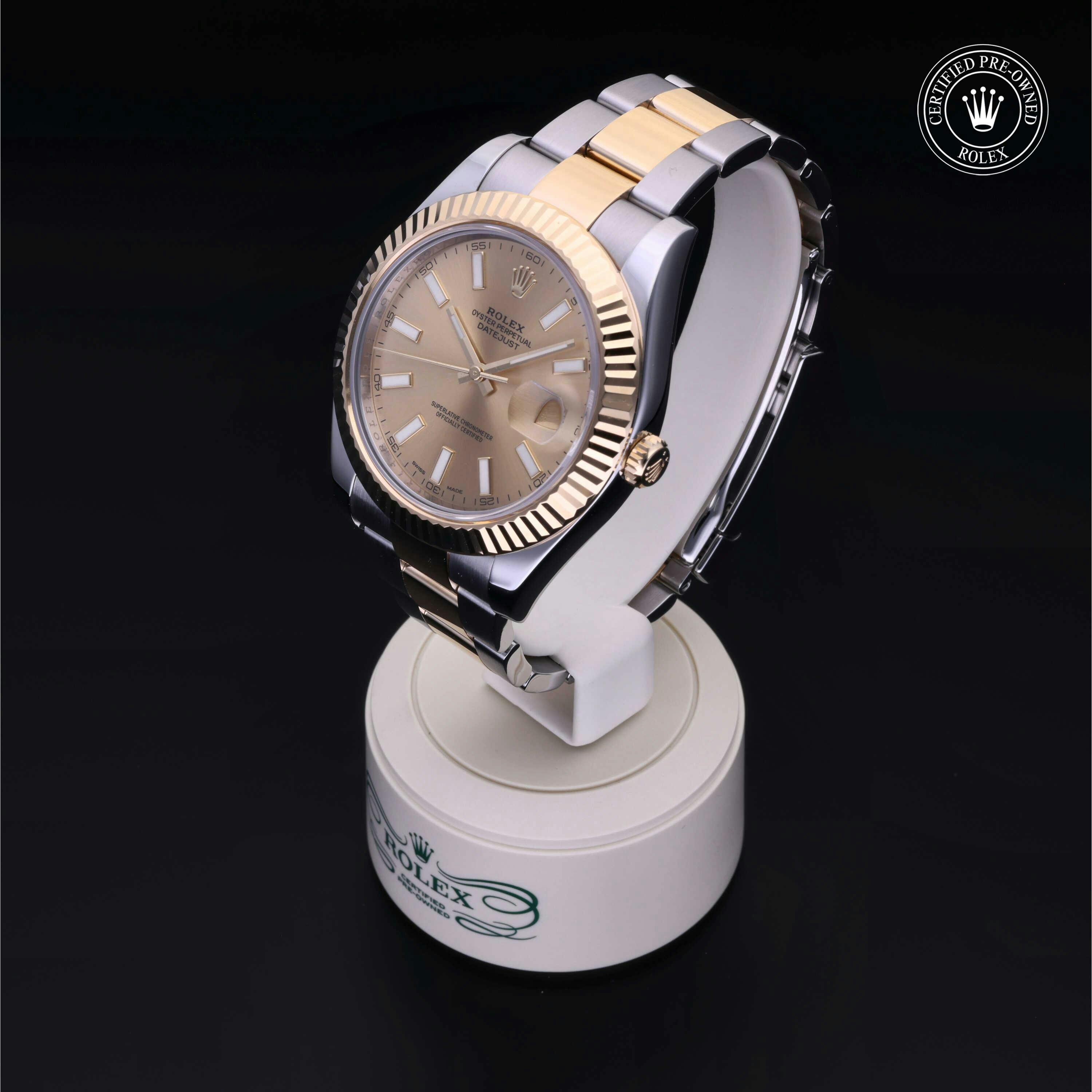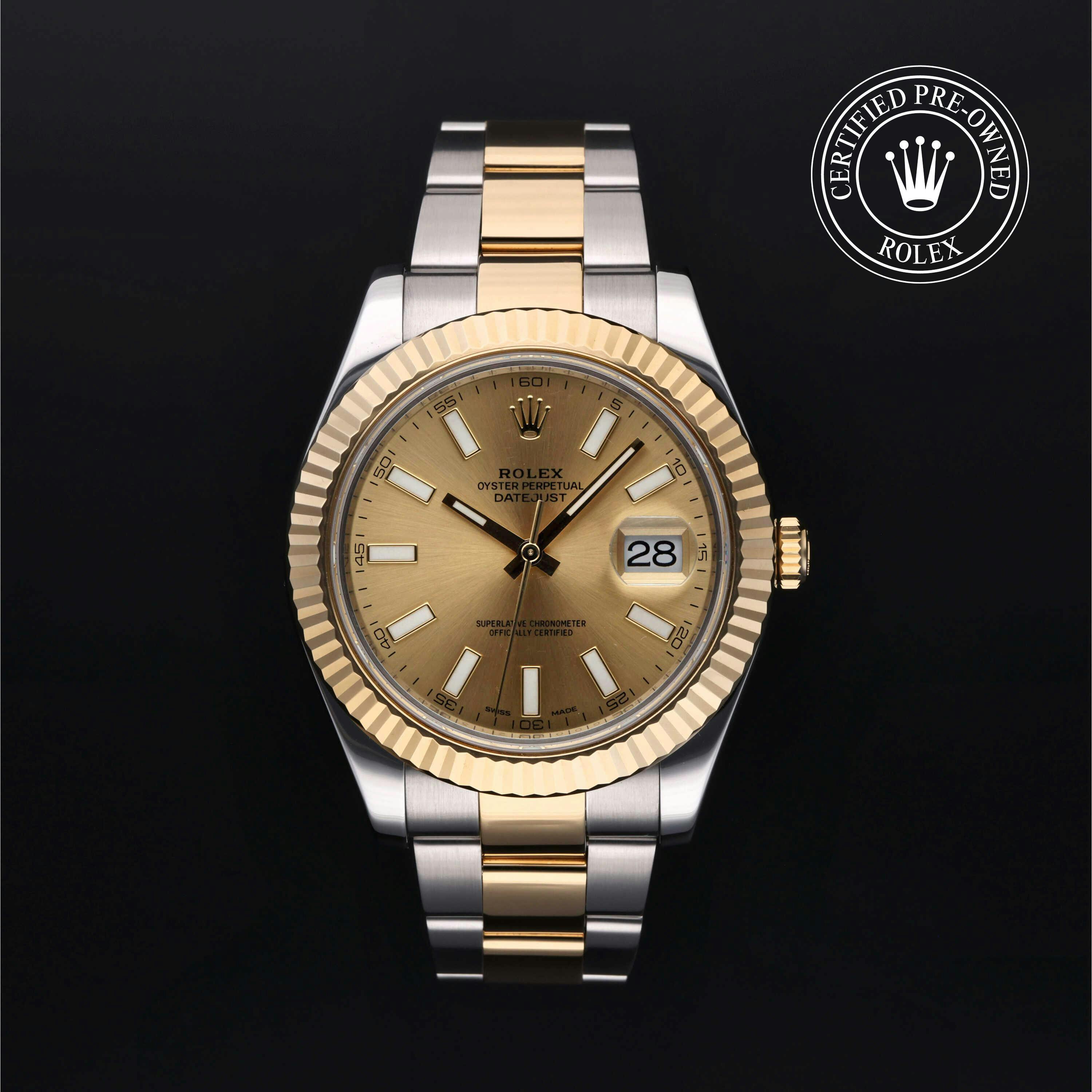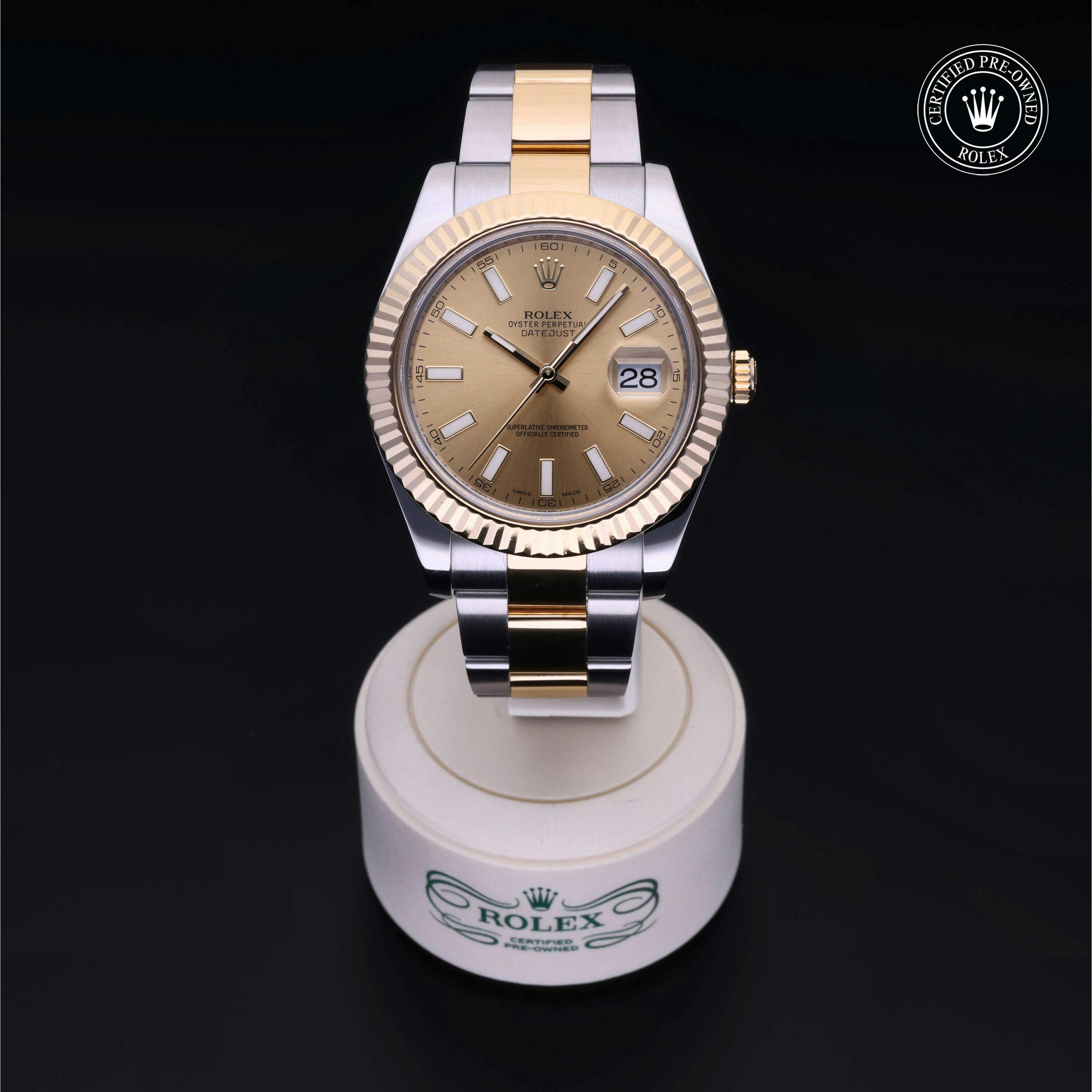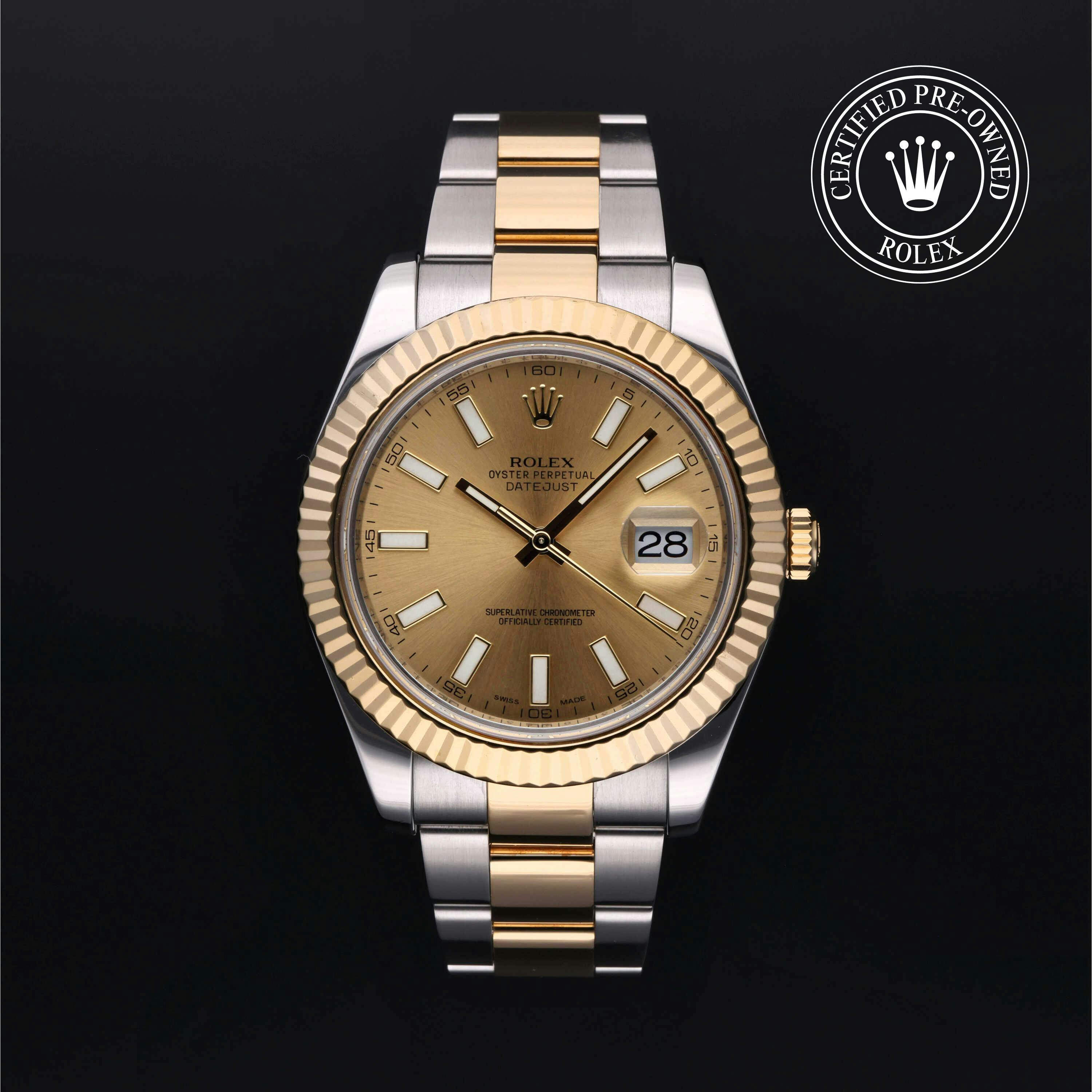 Rolex Certified Pre-Owned Datejust II (116333) self - winding automatic watch, features a 41mm stainless steel case with an 18k yellow gold fluted bezel surrounding a champagne dial on a stainless steel and 18k yellow gold oyster bracelet. Functions include hours, minutes, seconds and date. This watch has received Rolex-authorized service and certification. It does not come with the original box or papers, but includes a custom Rolex Certified Pre-Owned hang tag, travel pouch and RCPO international warranty card.