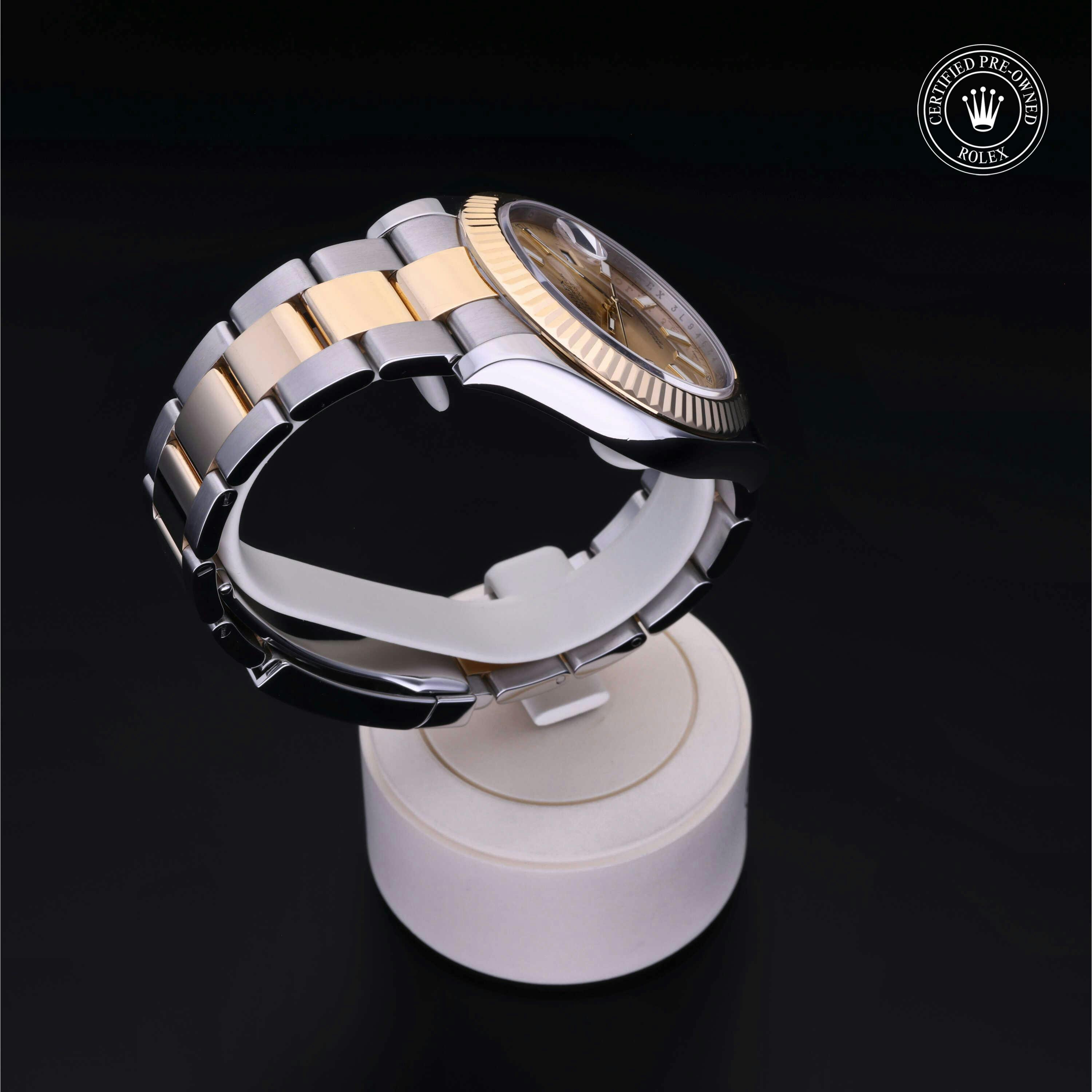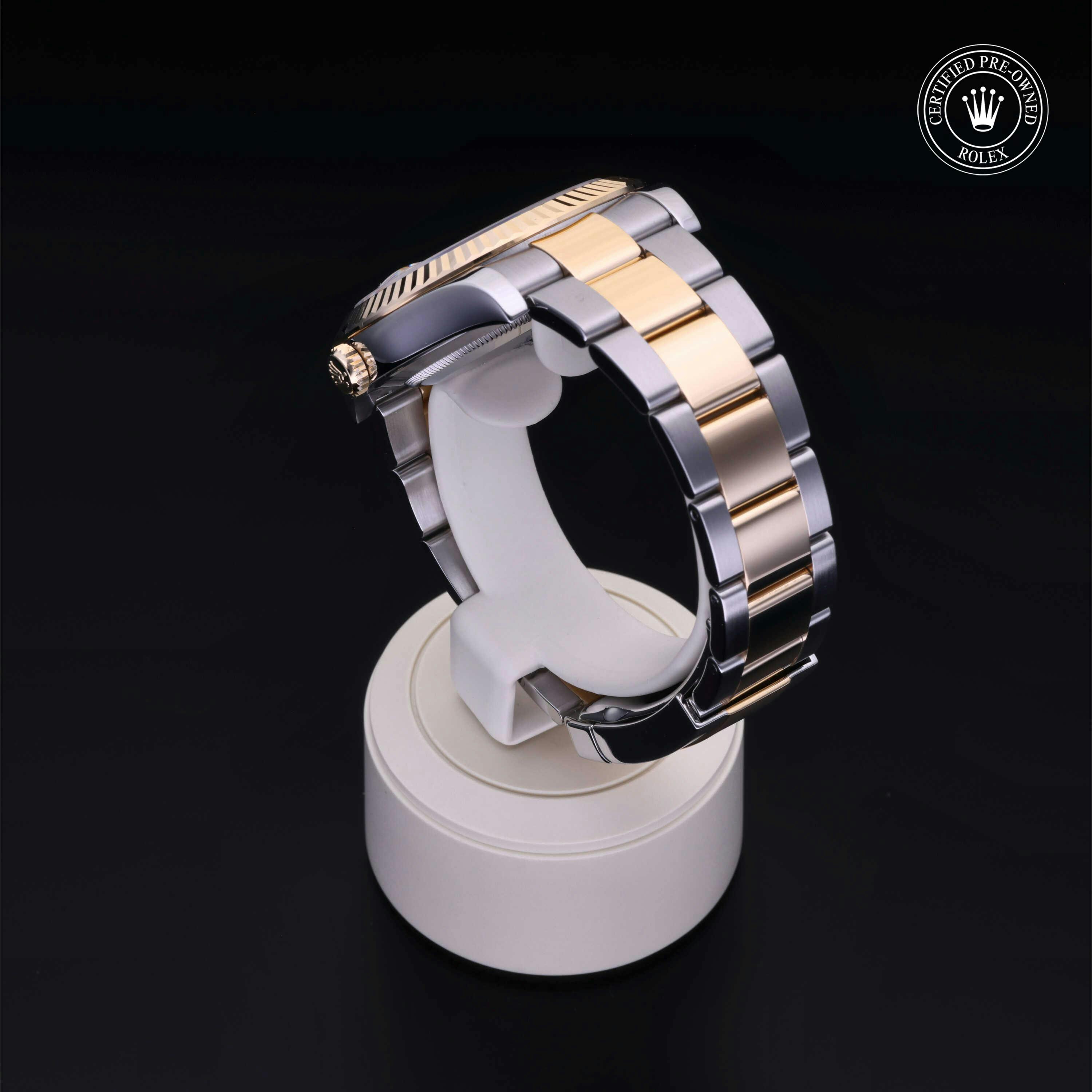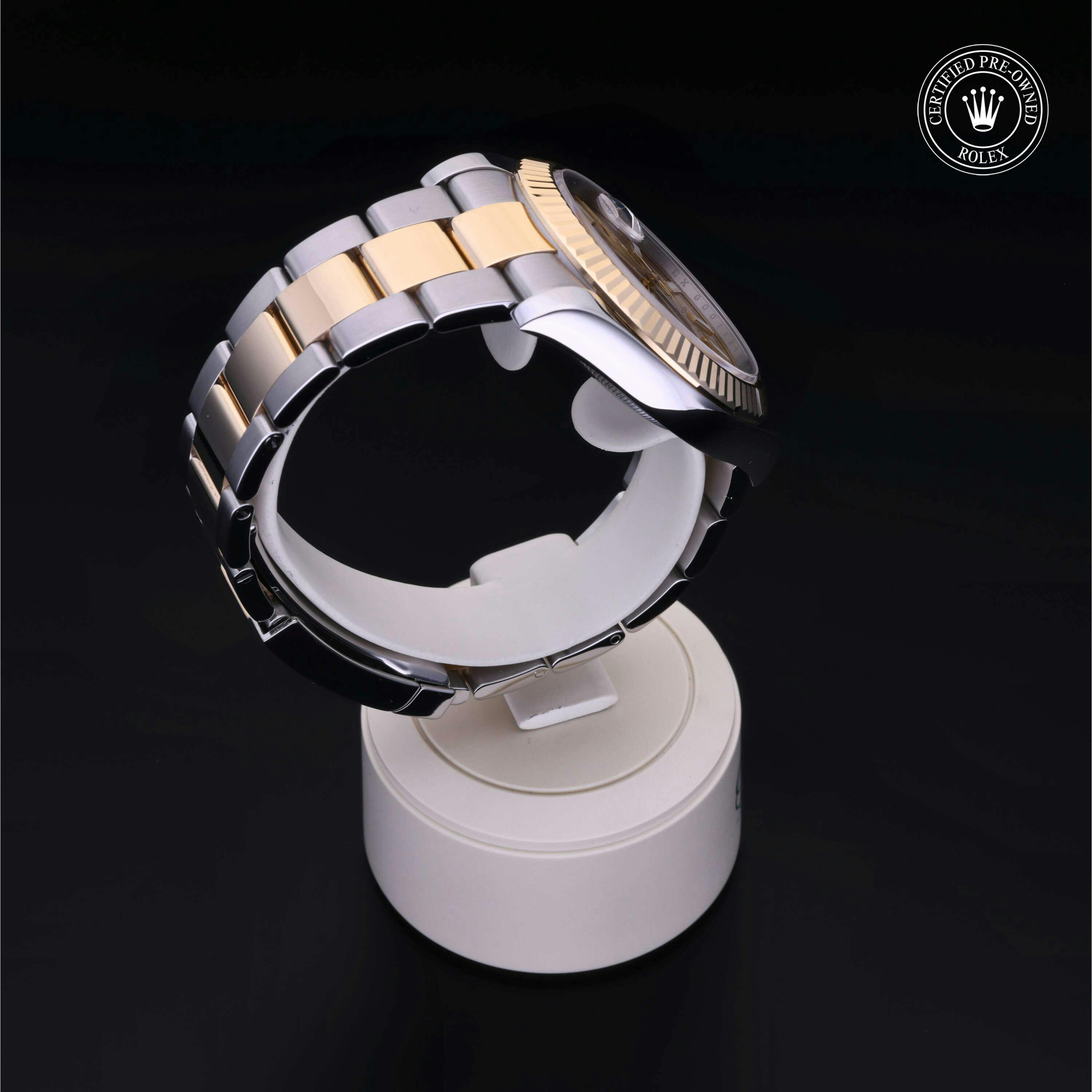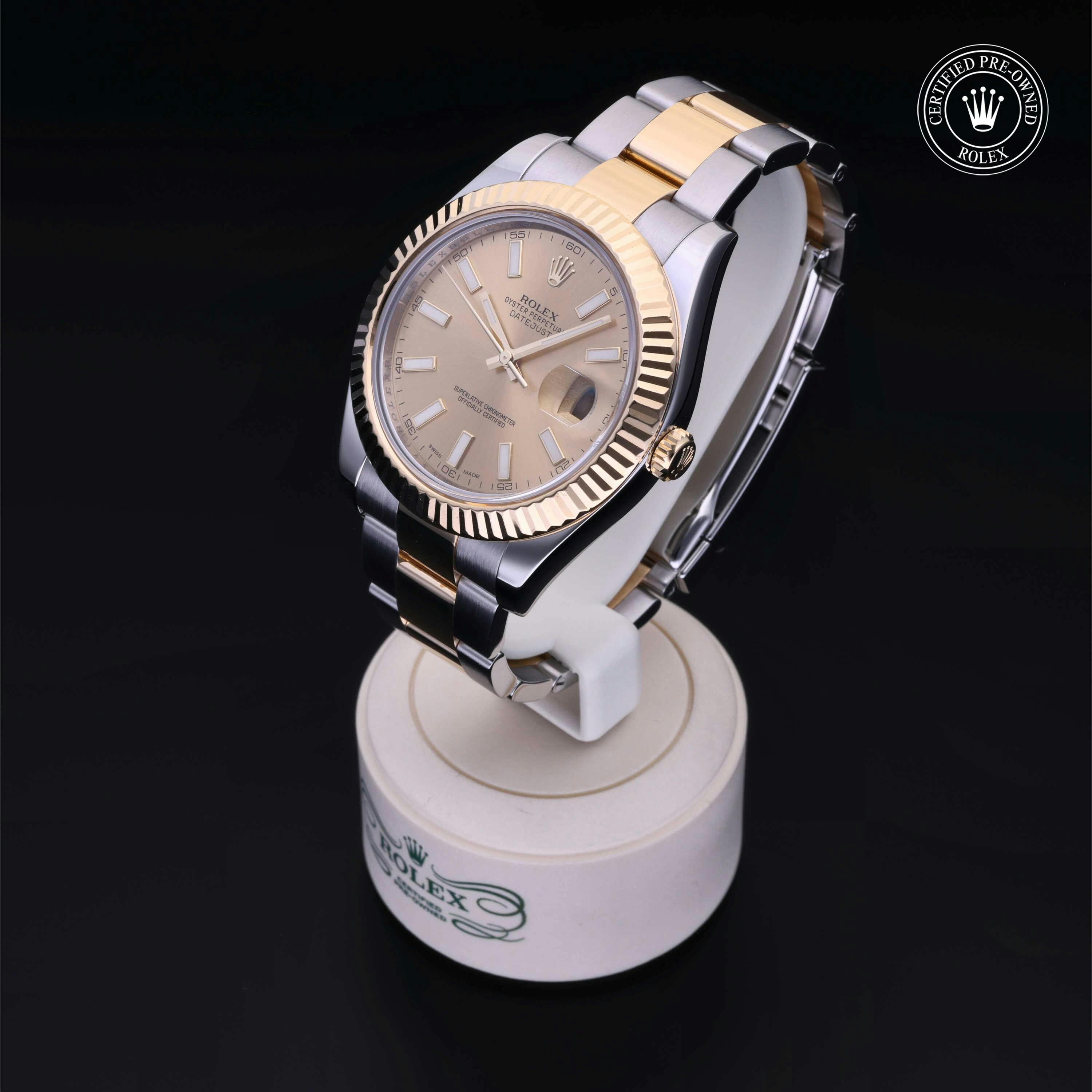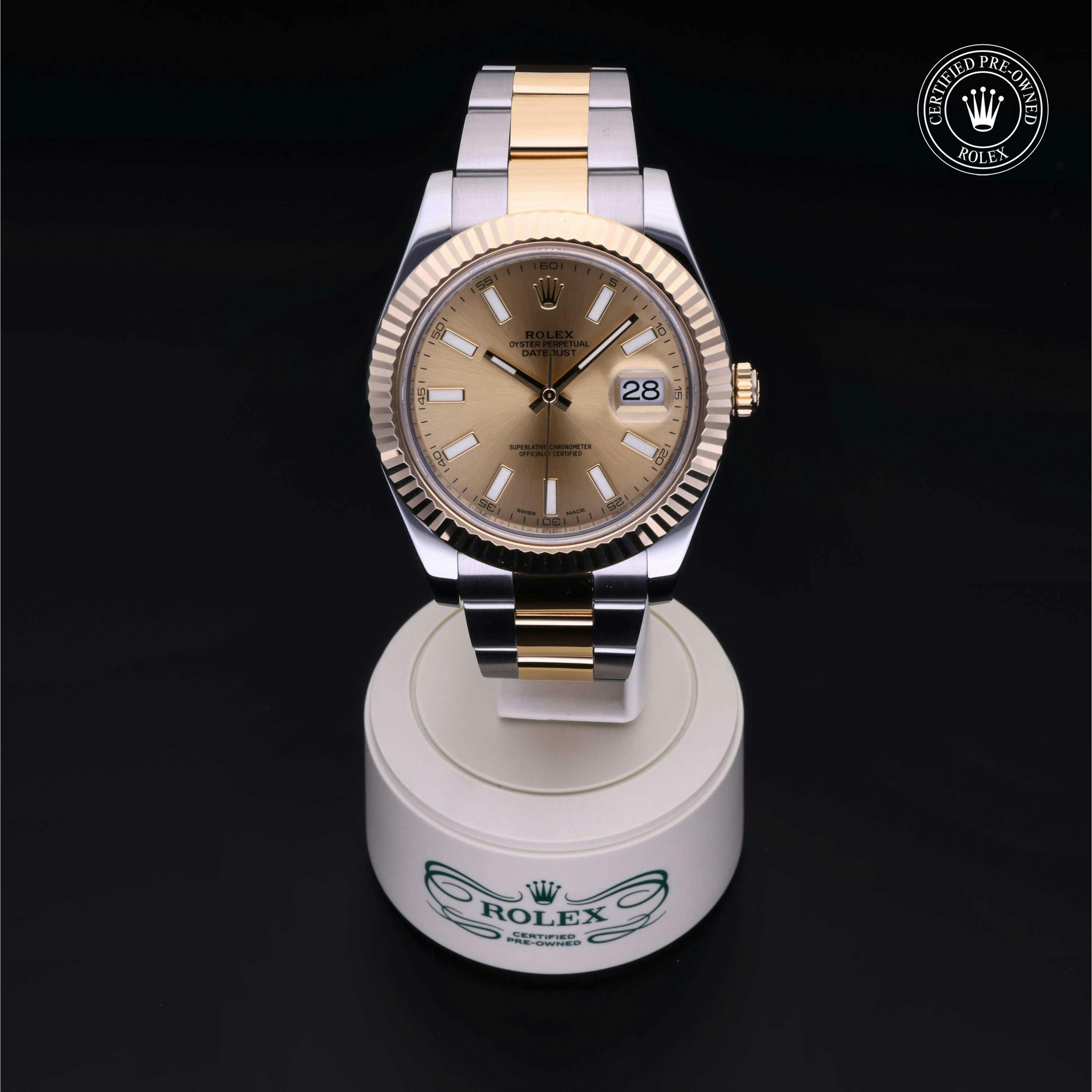 Rolex Certified Pre-Owned Datejust II (116333) self - winding automatic watch, features a 41mm stainless steel case with an 18k yellow gold fluted bezel surrounding a champagne dial on a stainless steel and 18k yellow gold oyster bracelet. Functions include hours, minutes, seconds and date. This watch has received Rolex-authorized service and certification. It does not come with the original box or papers, but includes a custom Rolex Certified Pre-Owned hang tag, travel pouch and RCPO international warranty card.