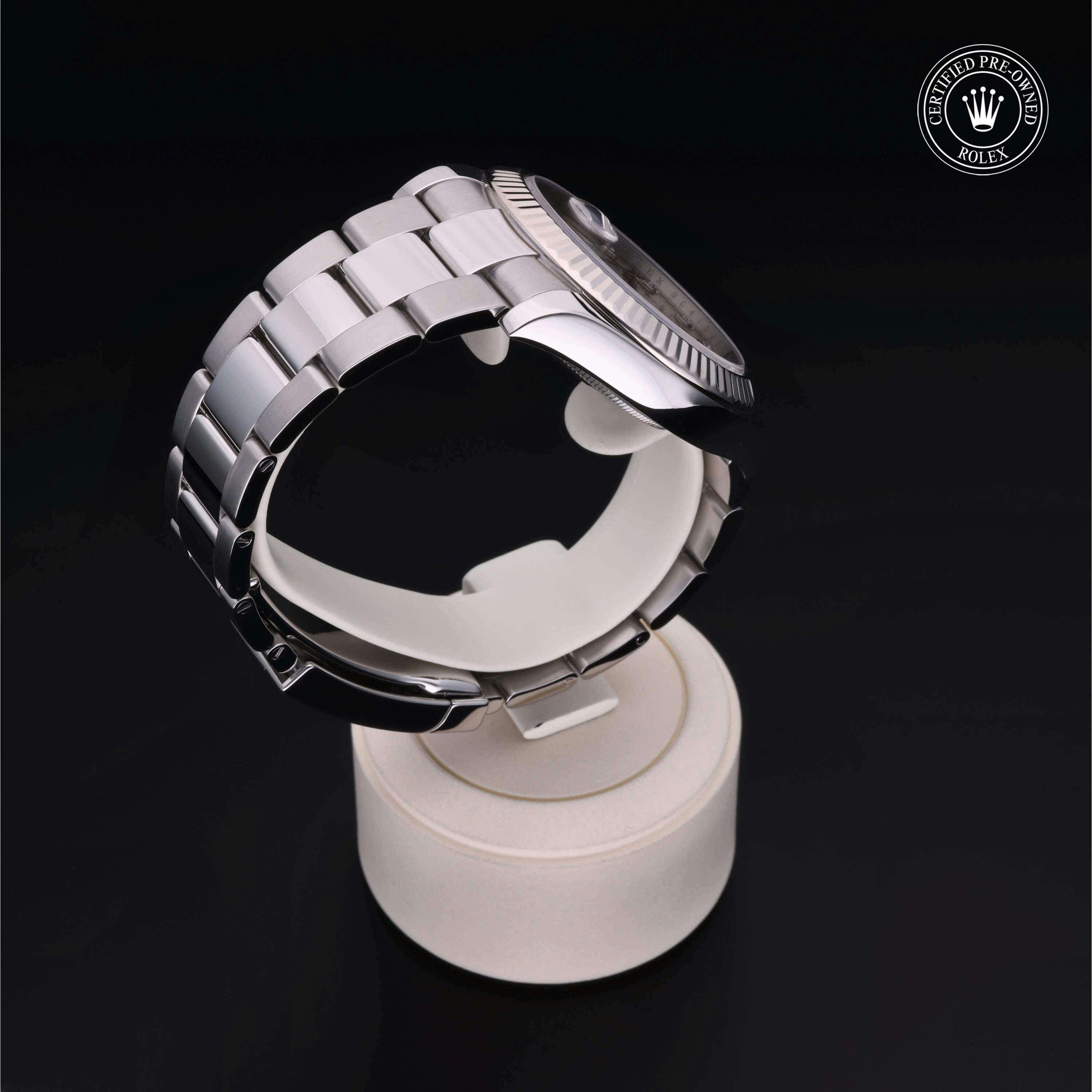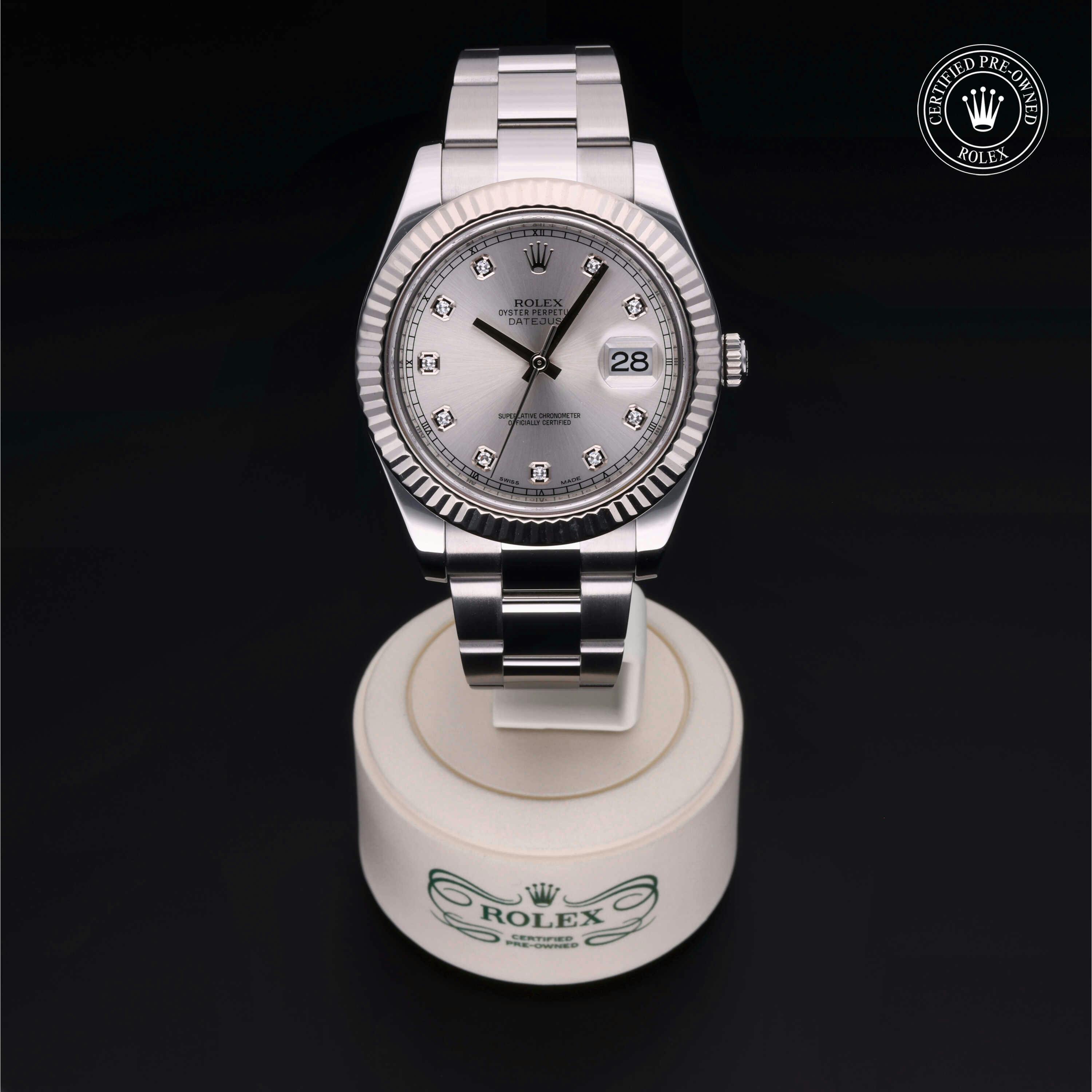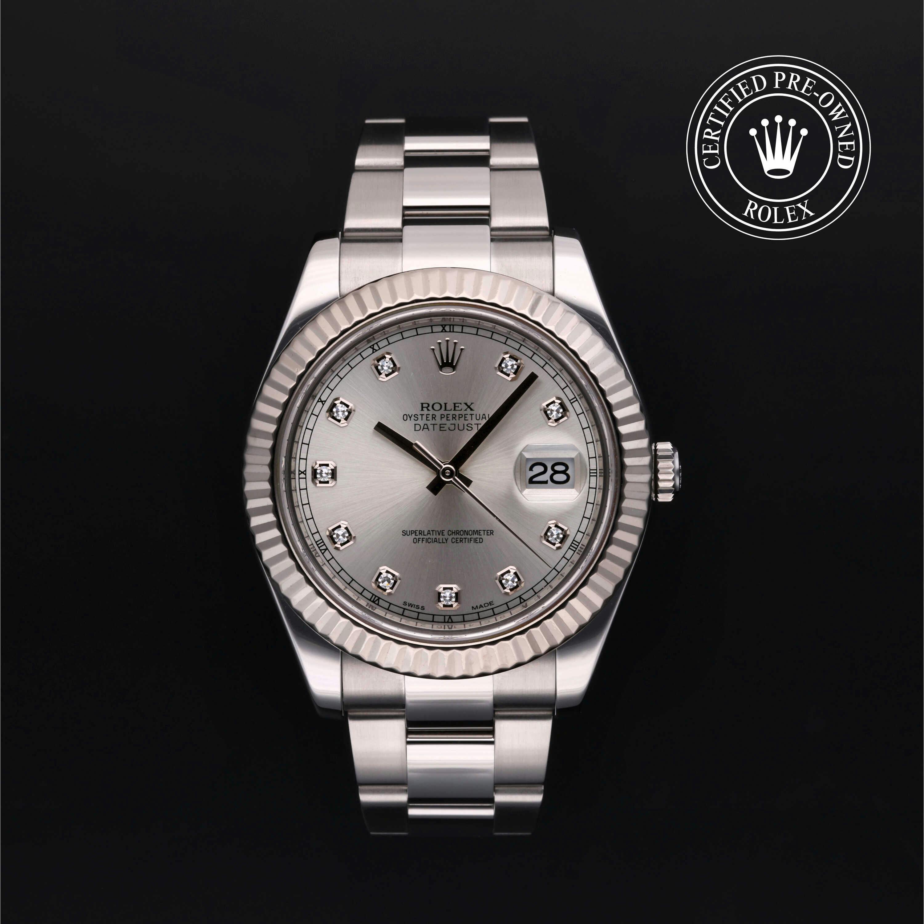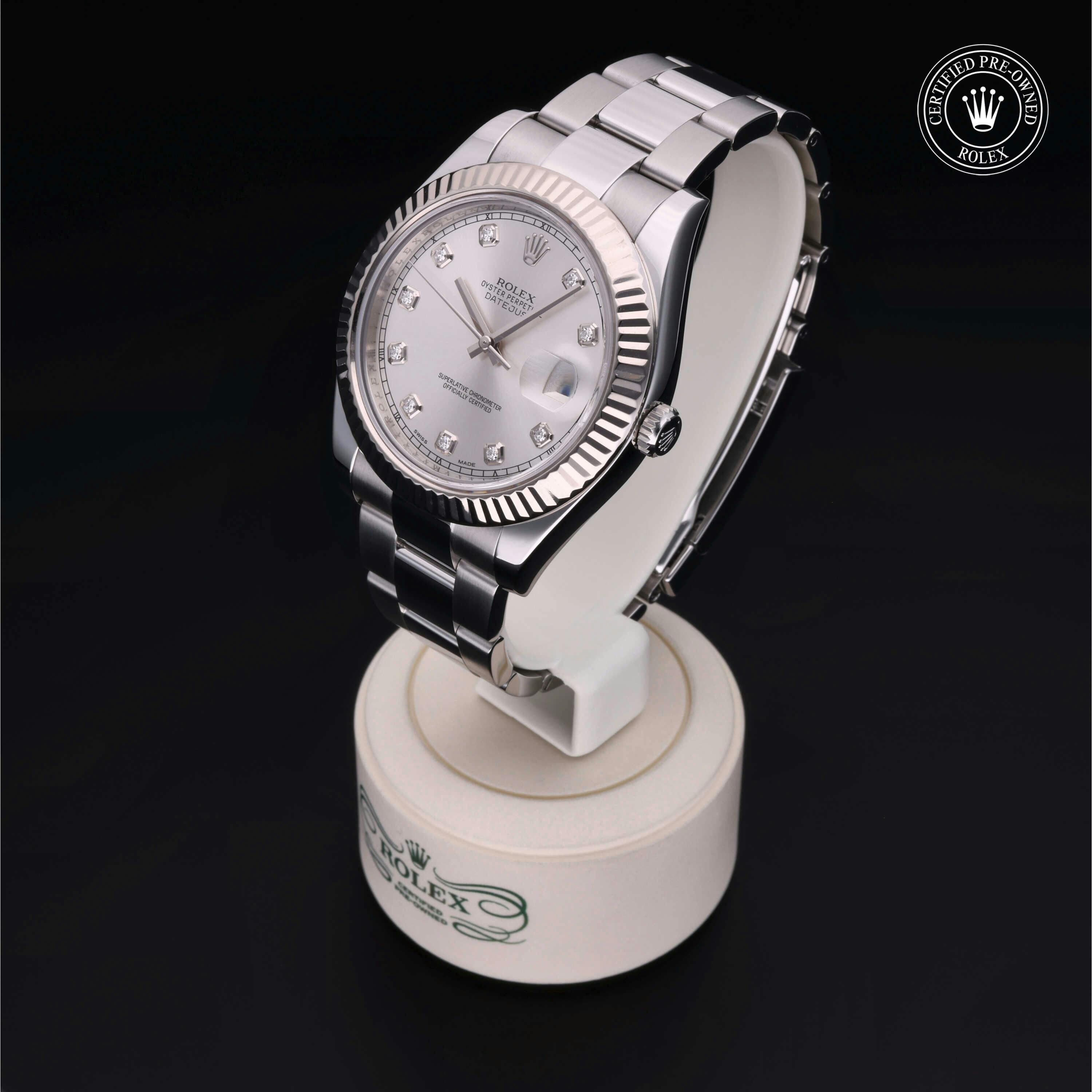 Rolex Certified Pre-Owned Datejust II (116334) self - winding automatic watch, features a 41mm stainless steel case with an 18k white gold fluted bezel surrounding a silver diamond set dial. Watch is secured on a stainless steel oyster bracelet complete with a folding buckle. Functions include hours, minutes, seconds and date. This watch has been received Rolex-authorized service and certified by Rolex. It comes with papers, and includes a custom Rolex Certified Pre-Owned hang tag, travel pouch and international warranty card.
