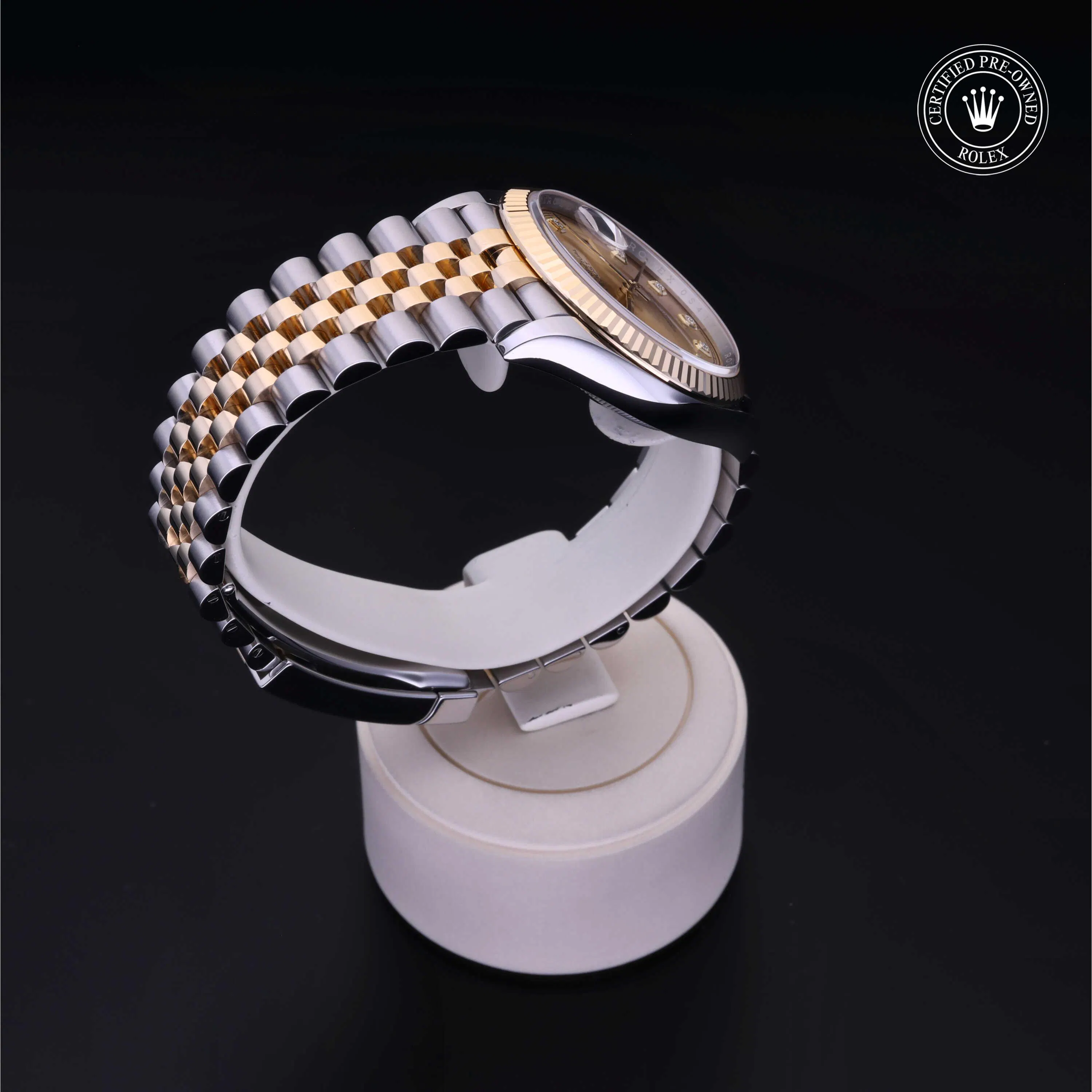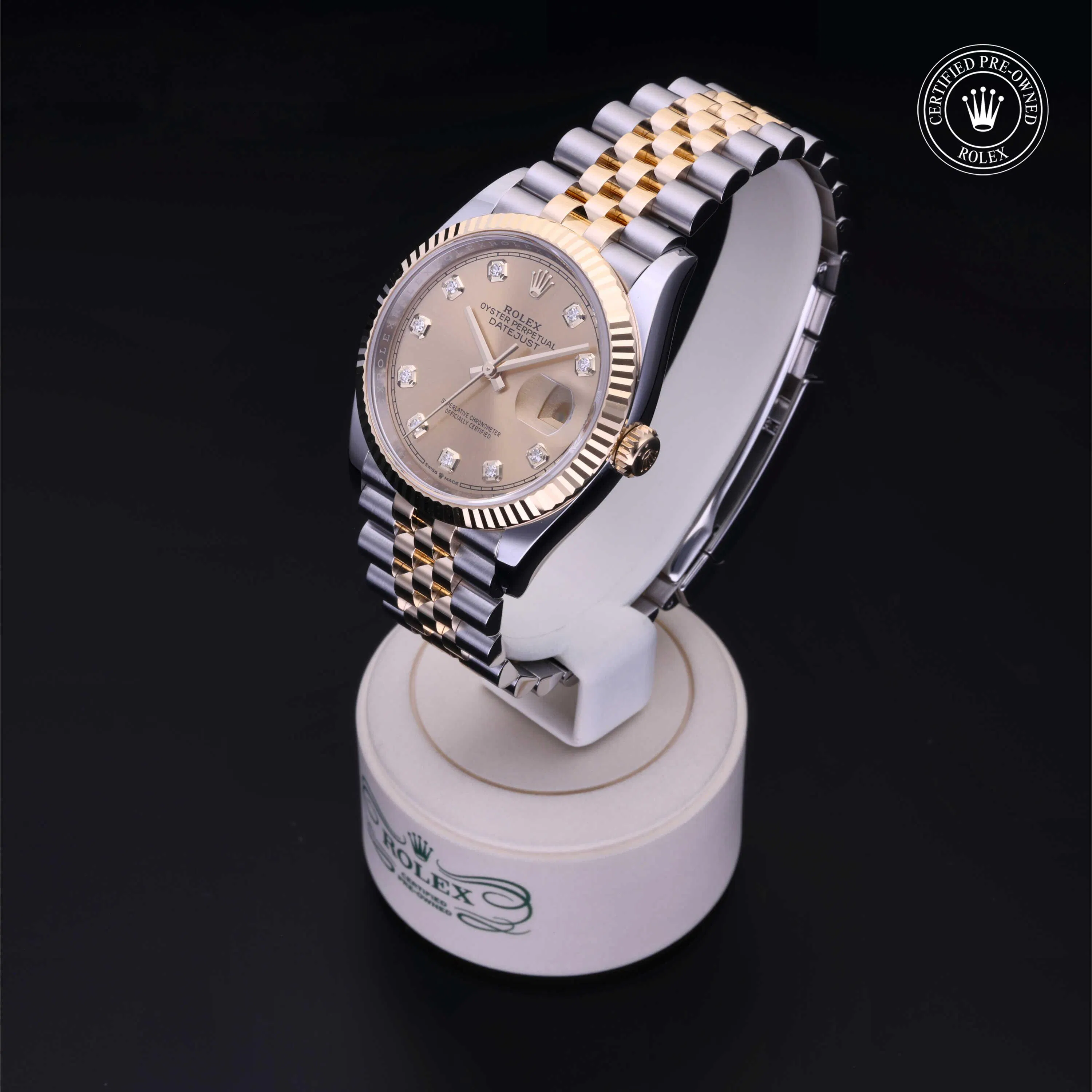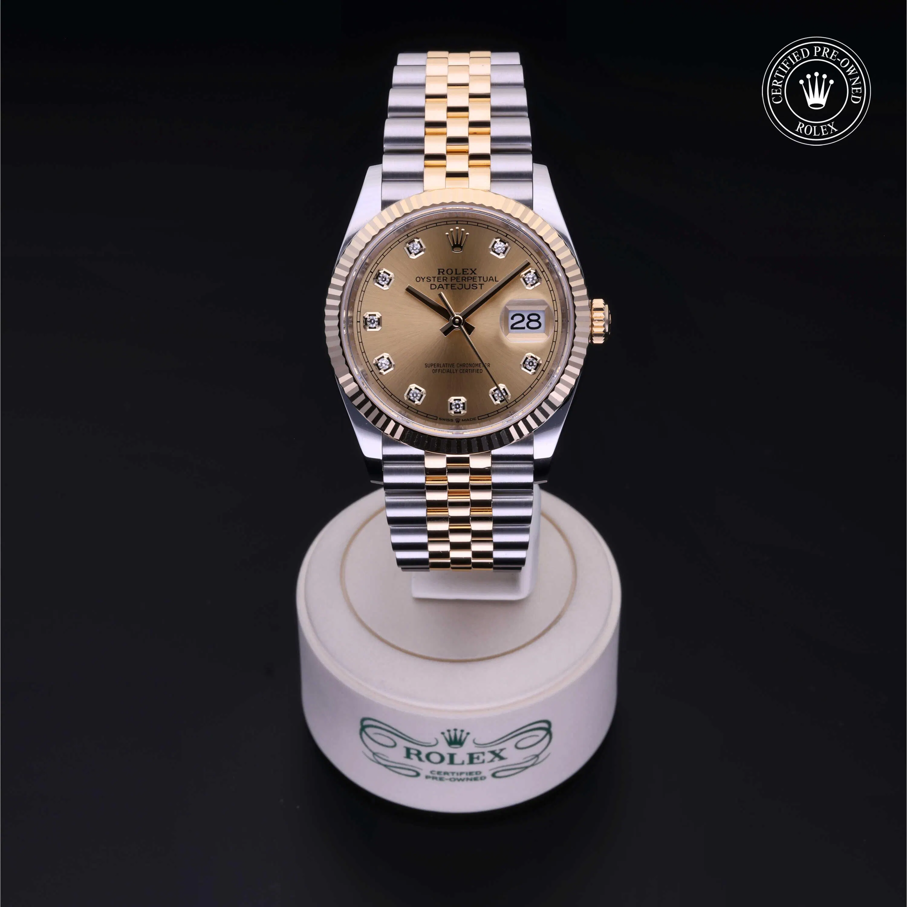 Rolex Certified Pre-Owned Datejust (126233) self - winding automatic watch, features a 36mm stainless steel case with an 18k yellow gold fluted bezel surrounding a champagne-color diamond set dial. The watch is secured on a stainless steel and 18k yellow gold Jubilee bracelet complete with a folding buckle. Functions include hours, minutes, seconds and date. This watch has been serviced by an authorized service center and certified by Rolex. It comes with the original box and papers as well as a custom Rolex Certified Pre-Owned hang tag, travel pouch and international warranty card.